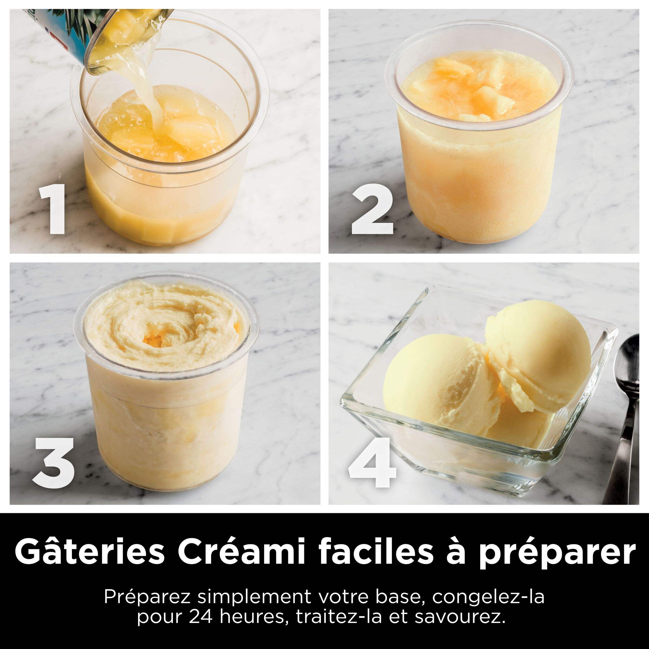 • Créez une gâterie CREAMiTM en trois étapes faciles. Il suffit de préparer vos ingrédients, de les mettre au congélateur pendant toute la nuit, de les traiter et de les savourer
