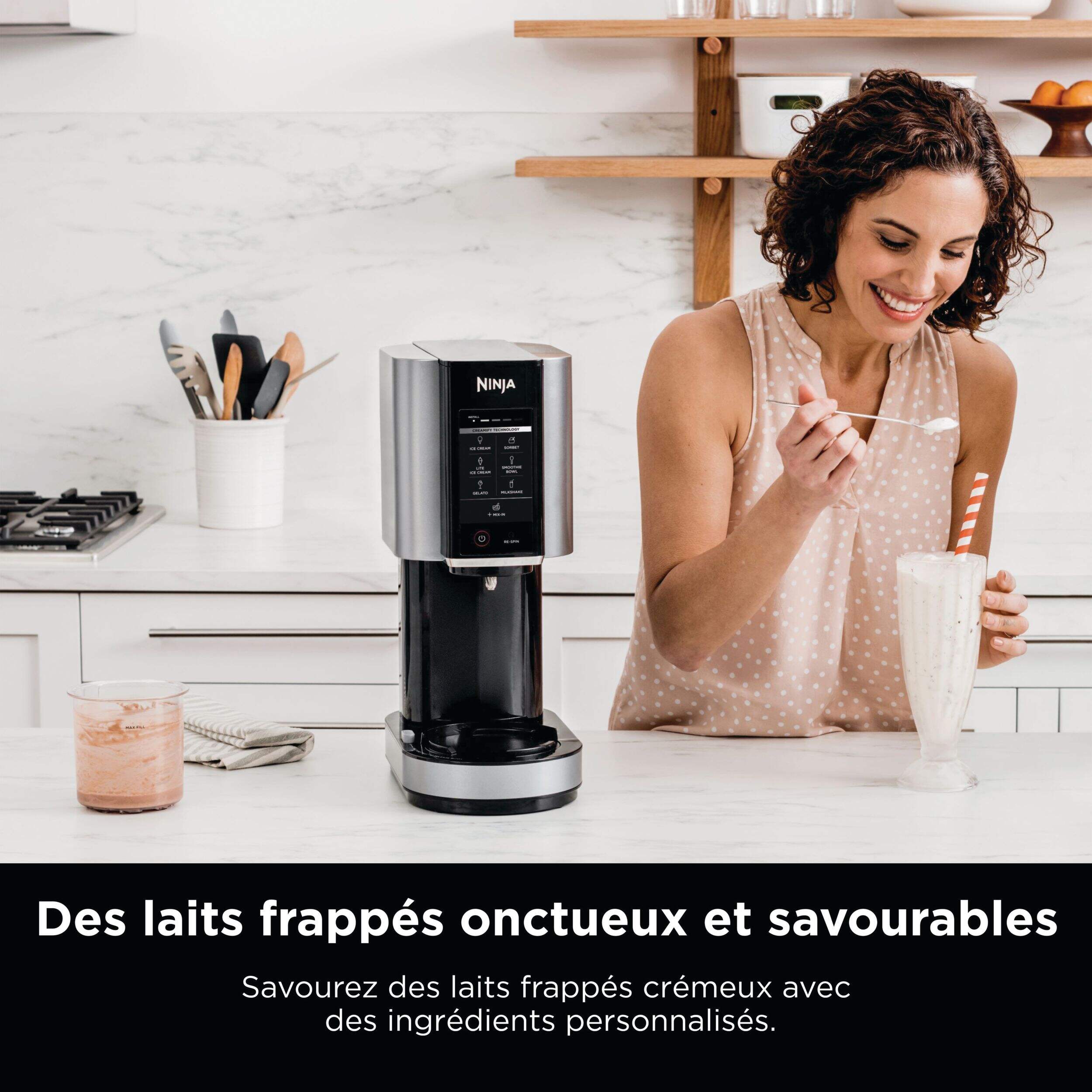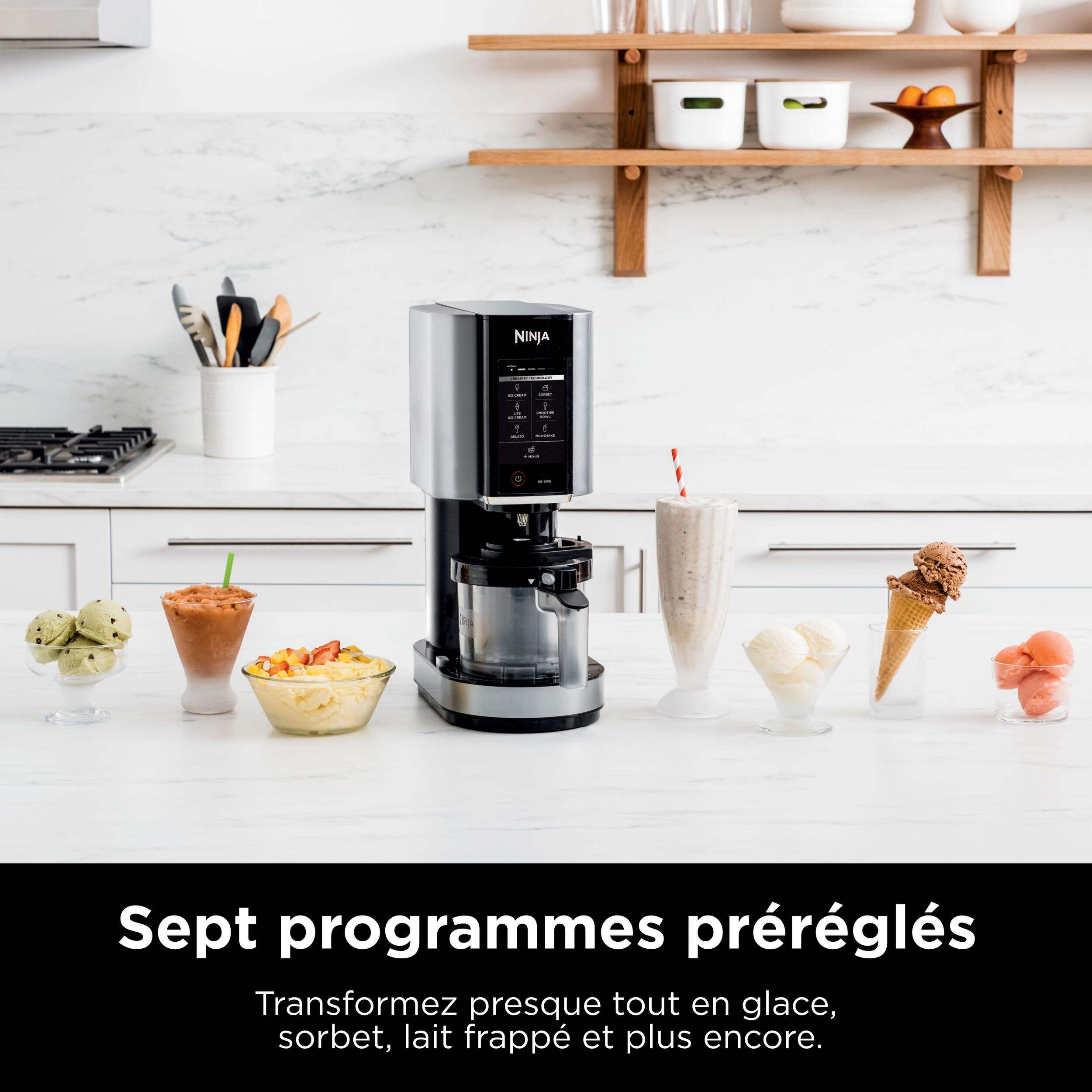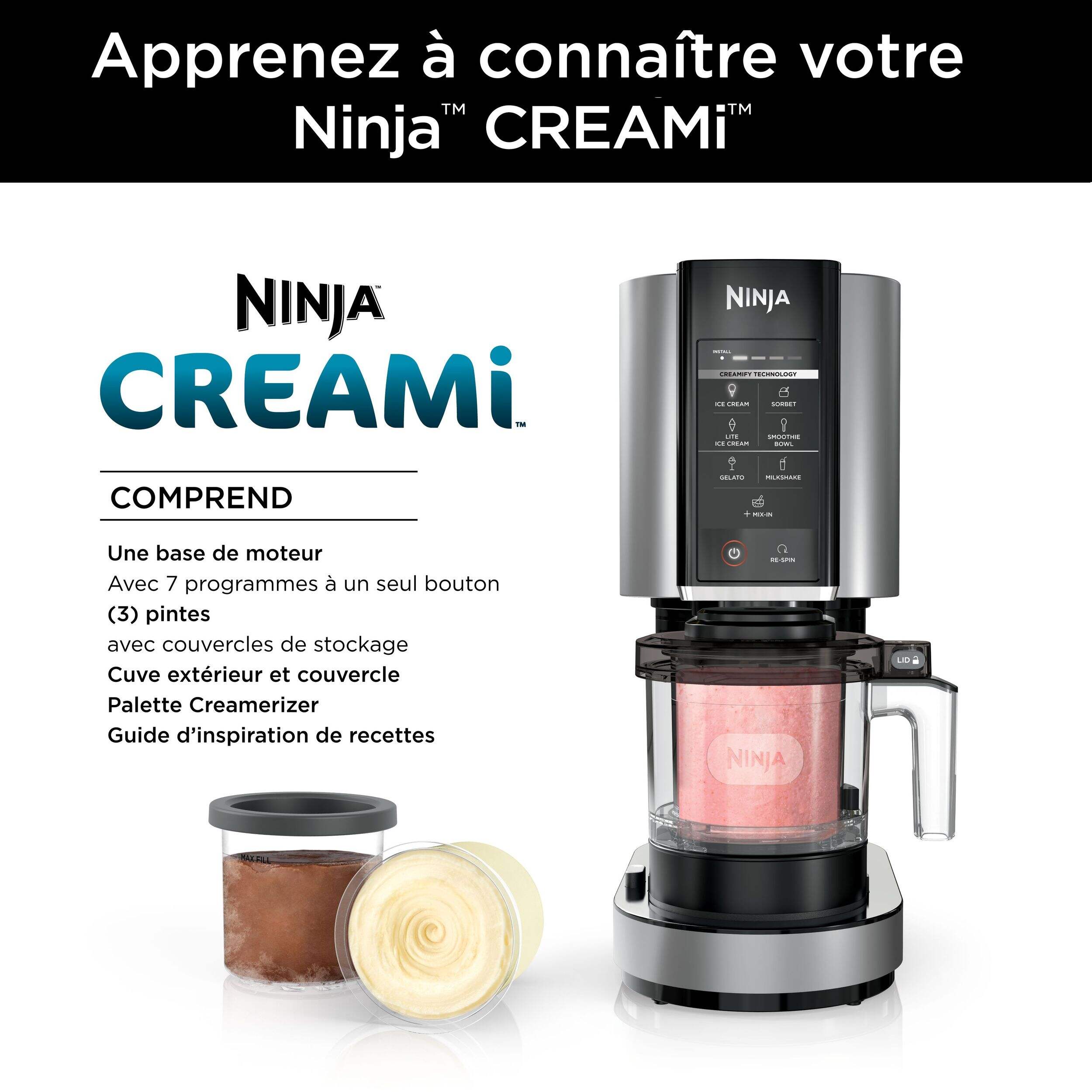NinjaMC CREAMiMC qui transforme les bases solides gelées en crème glacée, sorbets, laits frappés et plus encore en appuyant simplement sur un bouton. Technologie CreamifyMC de Ninja permettant à la sorbetière CREAMiMC de décomposer un bloc uniformément congelé en une texture incroyablement lisse et crémeuse en quelques minutes. Du sain au gourmand, le NinjaMC CREAMiMC peut créer une variété de gâteries glacées uniques pour satisfaire les palais les plus difficiles.
