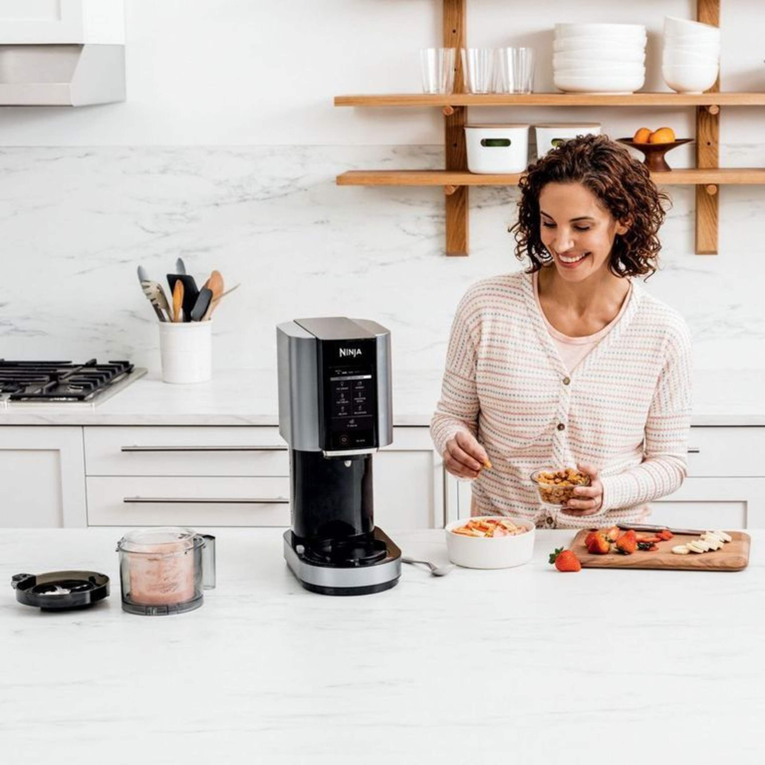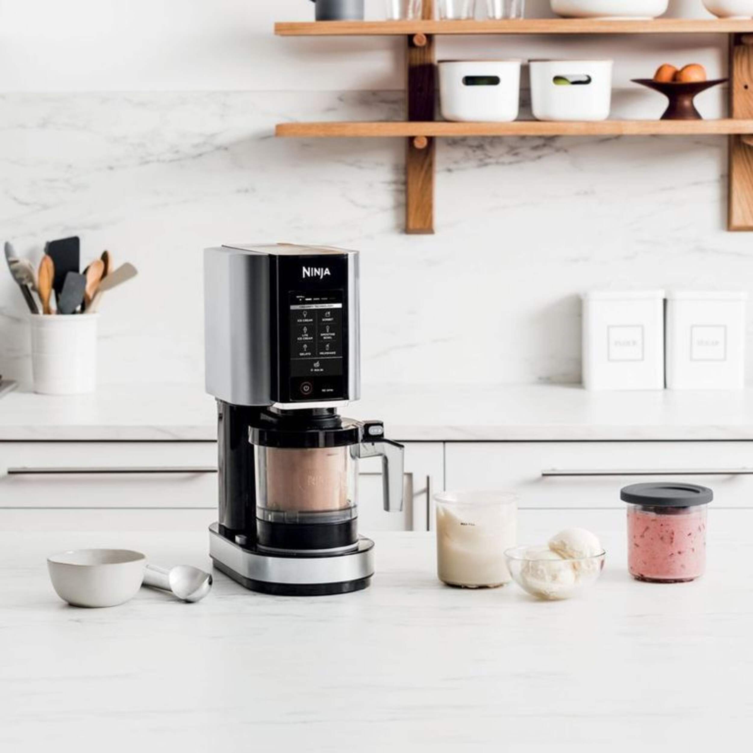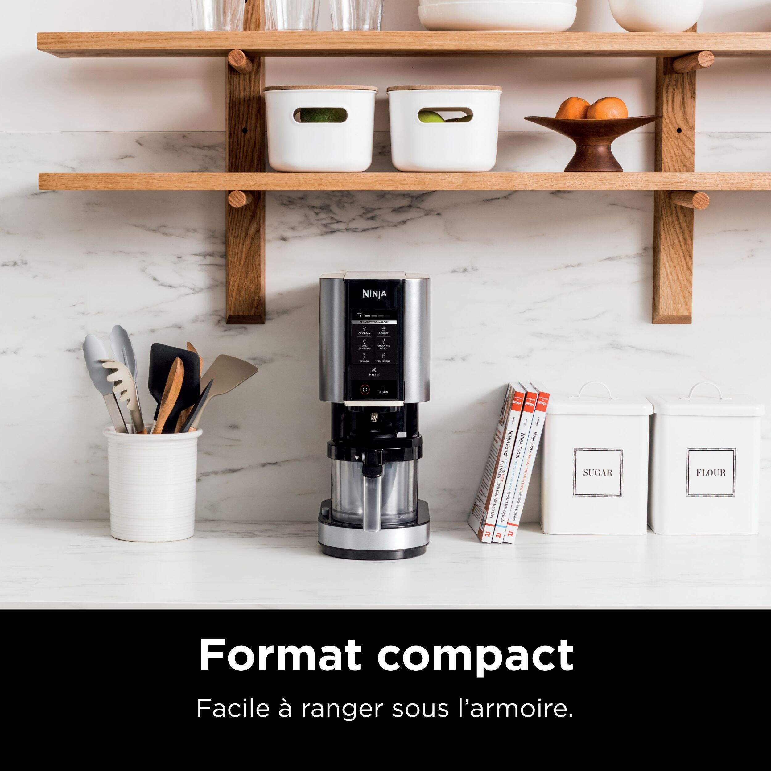 NinjaMC CREAMiMC qui transforme les bases solides gelées en crème glacée, sorbets, laits frappés et plus encore en appuyant simplement sur un bouton. Technologie CreamifyMC de Ninja permettant à la sorbetière CREAMiMC de décomposer un bloc uniformément congelé en une texture incroyablement lisse et crémeuse en quelques minutes. Du sain au gourmand, le NinjaMC CREAMiMC peut créer une variété de gâteries glacées uniques pour satisfaire les palais les plus difficiles.