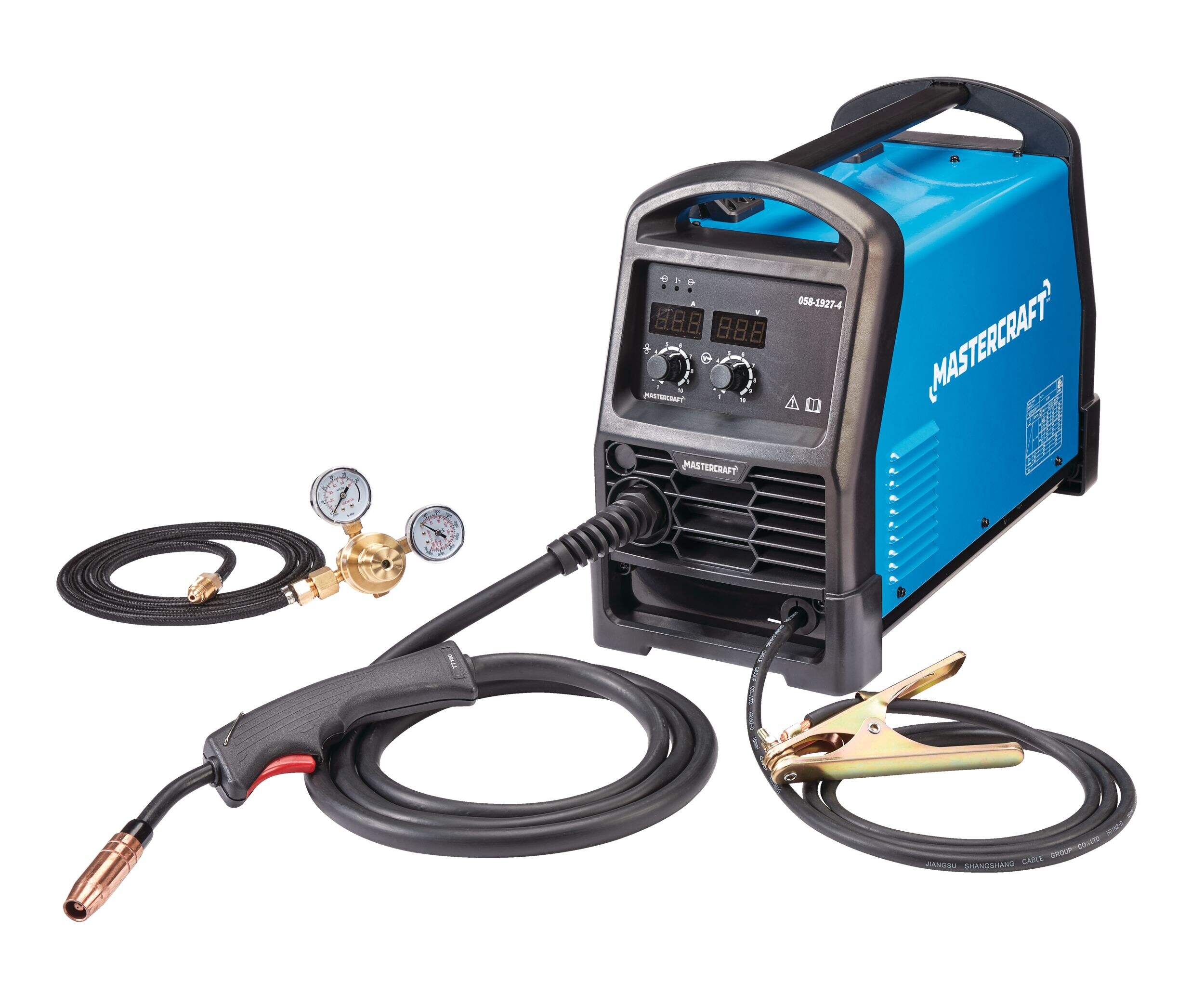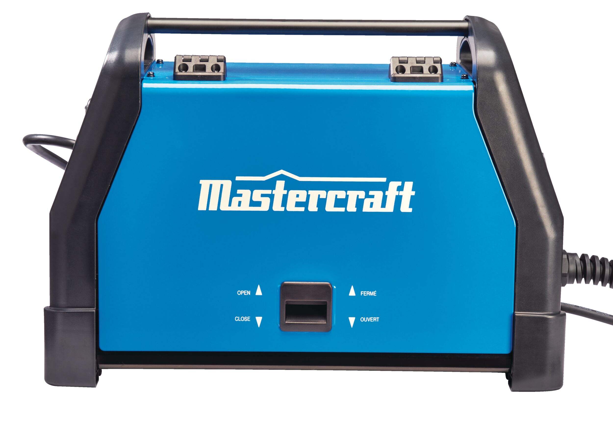 Comprend : Soudeuse à MIG à onduleur Mastercraft 180i, raccord et câble de mise à la terre de 1,8 m (6 pi), chalumeau à fil fourré/MIG de 1,8 m (6 pi), régulateur et tuyau à gaz de 1,8 m (6 pi), adaptateur de prise 15 A de 0,6 m (2 pi), tube contact (0,030 po), rouleau d'entraînement (0,023 po à 0,030/0,035 po)