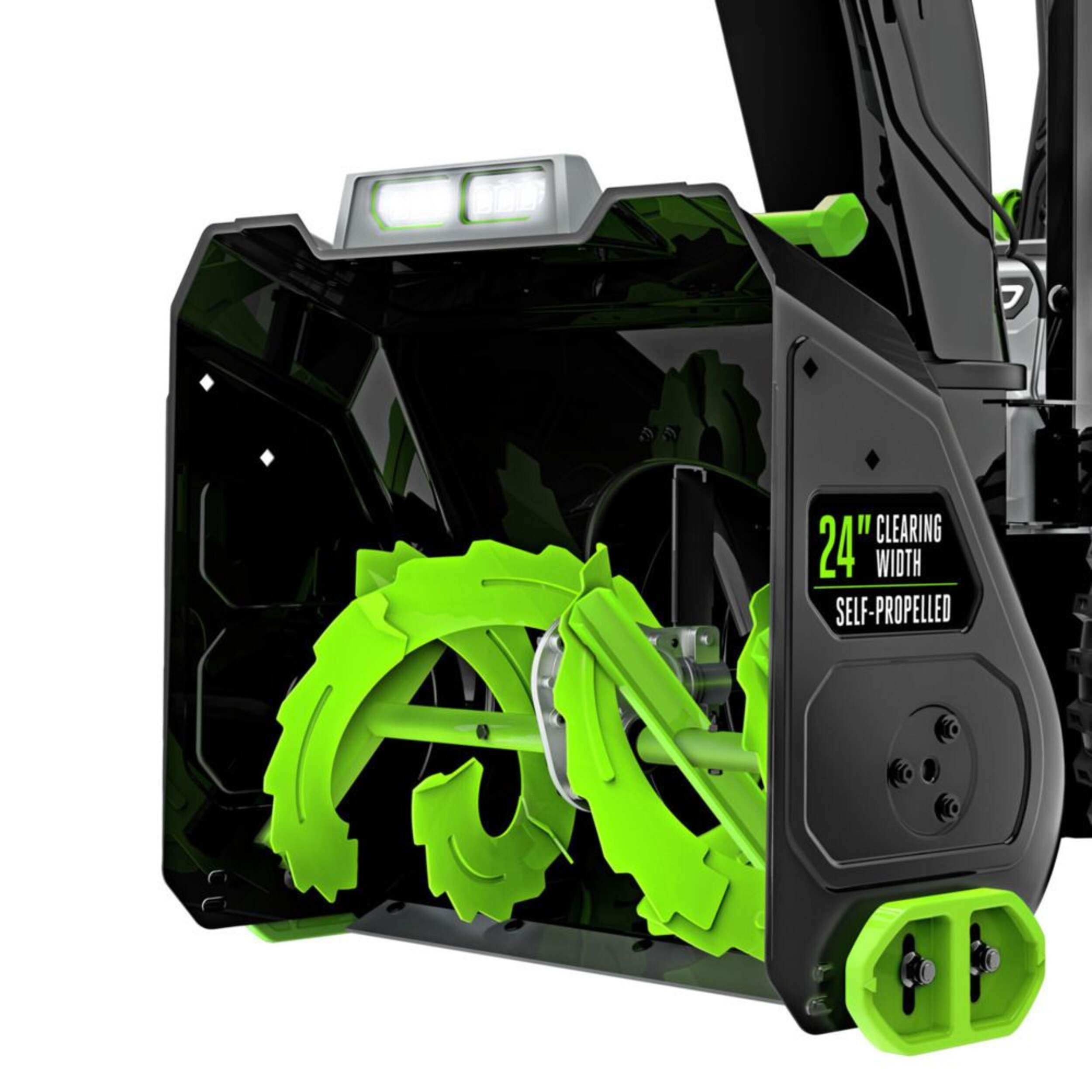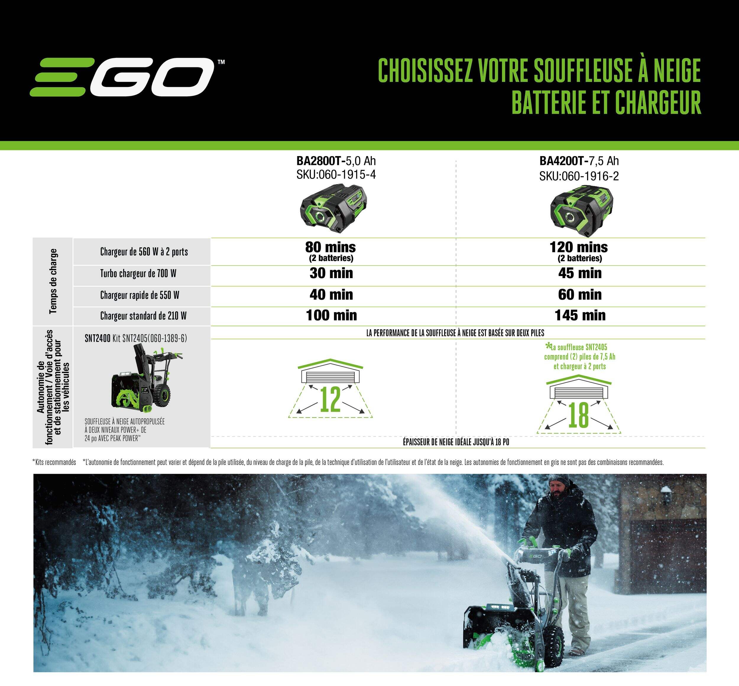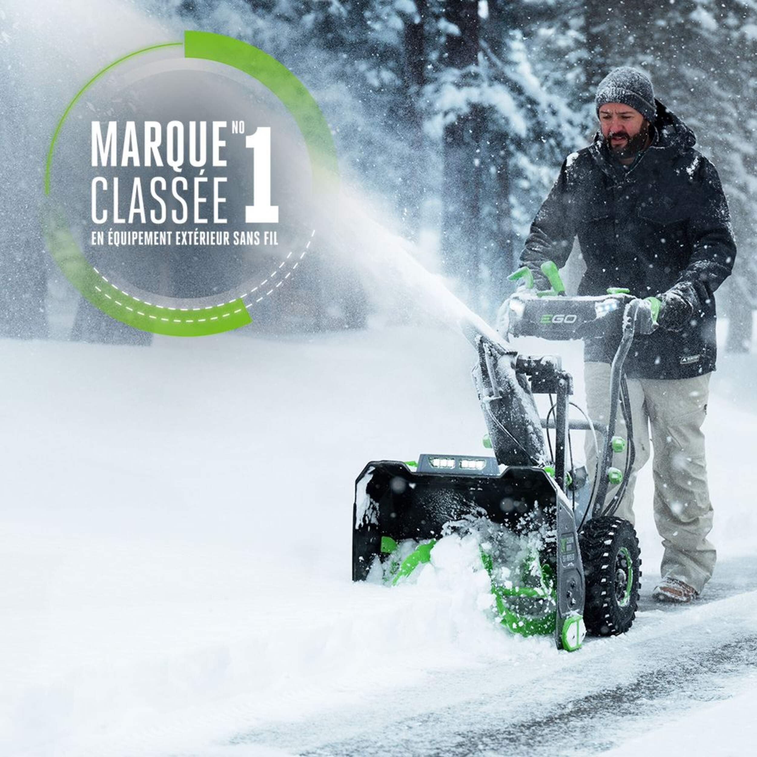 La souffleuse à neige à 2 phases sans fil EGO POWER+ surpasse la puissance et le rendement des souffleuses à neige à essence sans le bruit, le tracas et les émanations. Souffleuse à neige électrique sans fil combinant la puissance de 2 batteries EGO ARC LithiumMC de 56 V avec la technologie Peak PowerMC pour affronter toutes les neiges et toute la neige que la souffleuse laisse derrière facilement et lancer jusqu'à 50 pi. Sa largeur de déblaiement de 24 po et sa hauteur d'admission de 20 po permettent de nettoyer même la neige la plus profonde, et sa tarière à vitesse variable et sa goulotte à 200 degrés permettent de diriger la neige là où vous le voulez. Faites le travail facilement grâce aux directions avant et arrière à vitesse variable et aux 4 voyants DEL qui améliorent la visibilité tôt le matin ou le soir. Déneigez 8 po d'une entrée de garage de 18 voitures avec les 2 batteries de 7,5 Ah. Vivez l'expérience Power Beyond BeliefMC avec la souffleuse à neige à 2 phases sans fil EGO POWER+ et toute la gamme EGO POWER+.