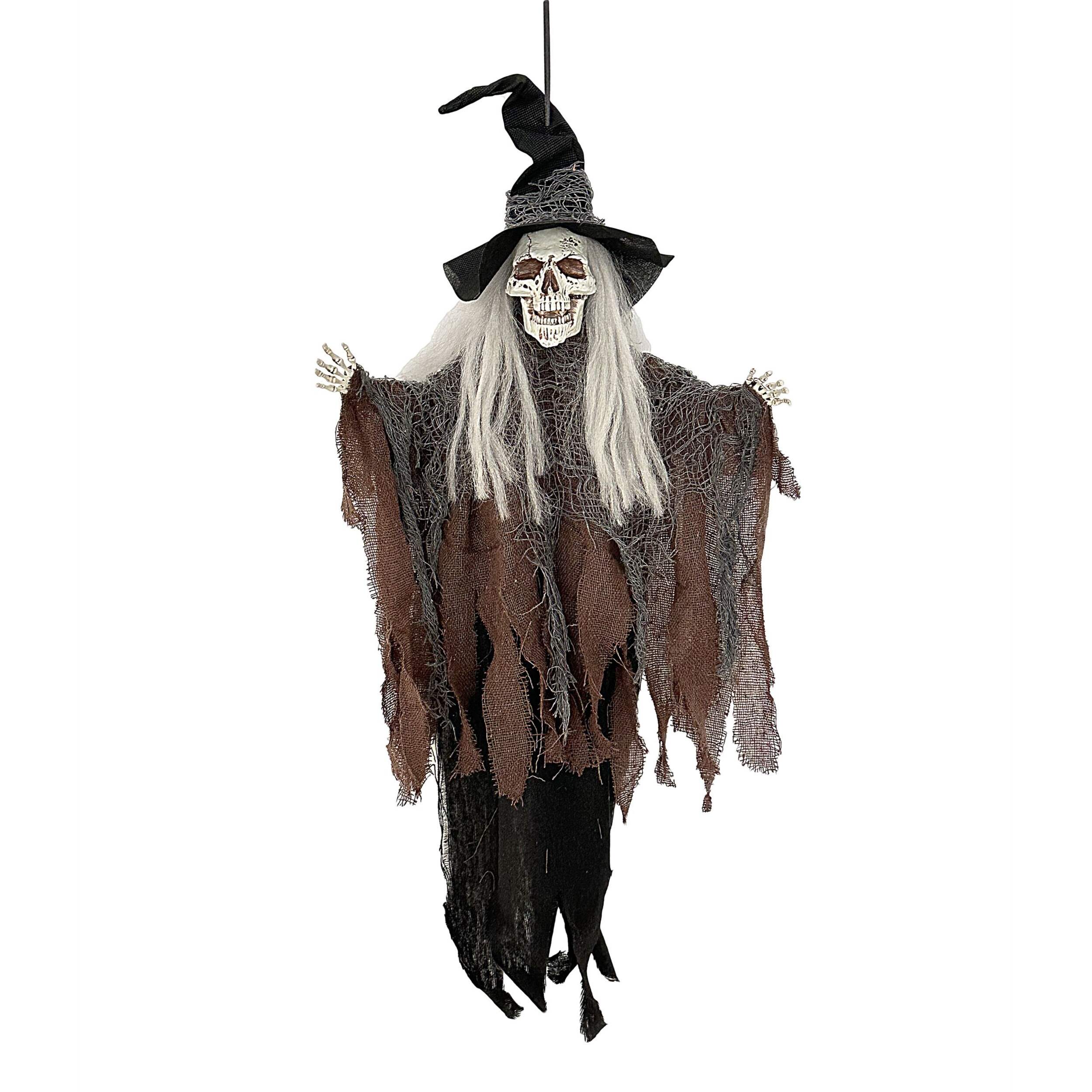 Sorcière suspendue dotée de longs cheveux gris, d'un visage de squelette et portant une robe noire et brune en lambeaux avec un chapeau de sorcière noir