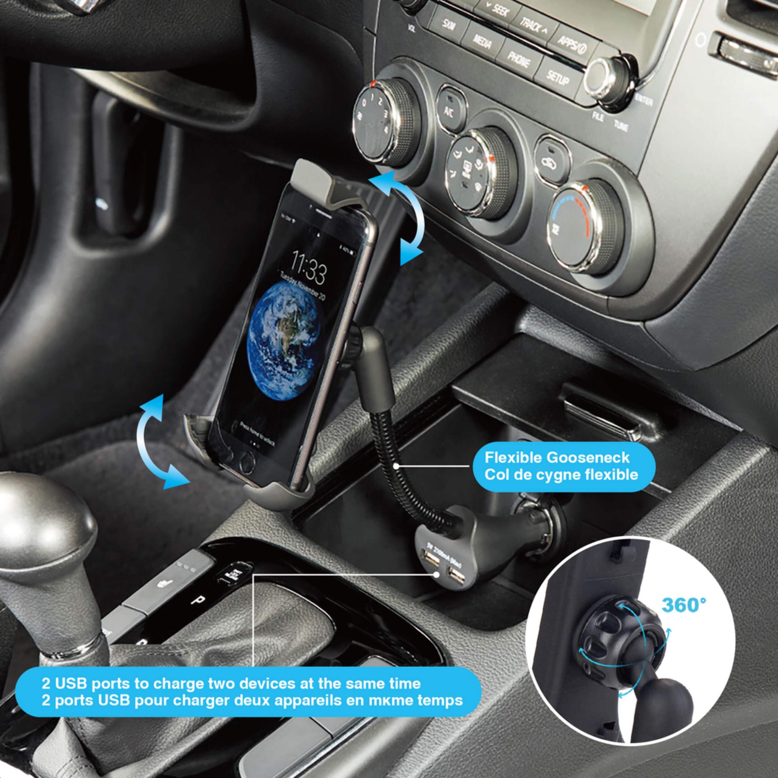 Support de téléphone col de cygne Bluehive 12 V qui est une solution pratique pour fixer solidement votre téléphone intelligent dans votre voiture. Grâce à ses pieds antidérapants, ce support pour téléphone assure une prise stable, gardant votre appareil en place même lors des promenades cahoteuses. Largeur réglable de 5,5 à 8,3 cm (2,2 à 3,3 po) et hauteur réglable de 14 à 19 cm (5-1/2 à 7,4 po) permettant un ajustement personnalisé pour une grande variété d'appareils. Doté d'une prise de 12 V et de 2 ports USB, ce support de téléphone Bluehive vous permet de recharger facilement vos appareils pendant vos déplacements. Garantie de 1 an comprise.
