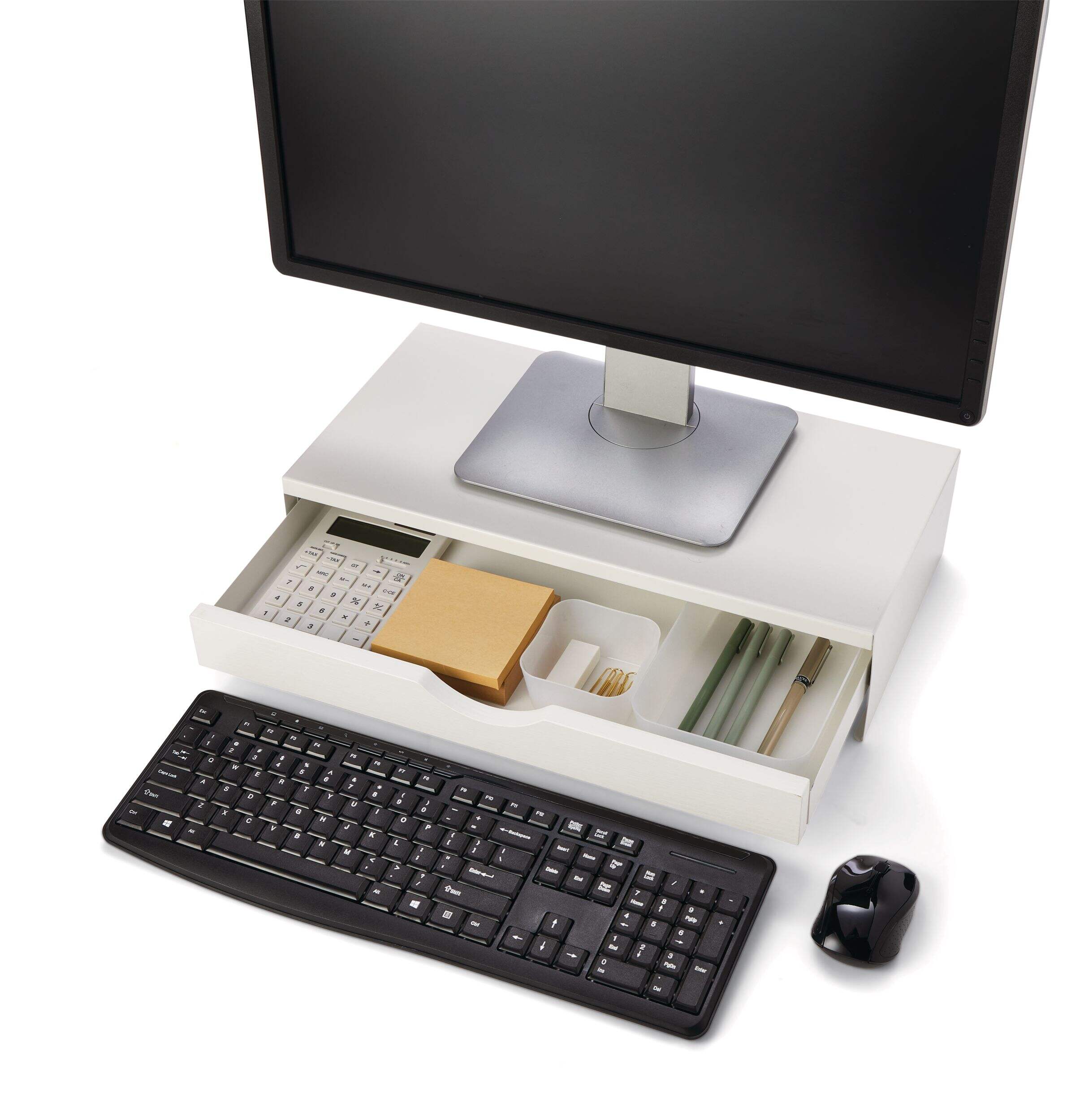 Organisez et améliorez votre espace de travail avec le support pour moniteur de type A. Son tiroir intégré permet de ranger vos essentiels comme des stylos, clés USB et écouteurs, pour une surface de travail dégagée. Ajustez la hauteur de votre moniteur sur son support en métal robuste pour trouver l'angle le plus ergonomique pour réduire la fatigue du cou. Ce support ergonomique remplit ses objectifs en vous permettant de travailler de manière organisée, productive et avec une bonne posture. Désormais, vous pouvez vraiment vous concentrer sur la tâche à accomplir au lieu de chercher des articles manquants ou de vous affaler devant votre écran. Tout ce dont vous aviez besoin pour une bonne journée de travail.
