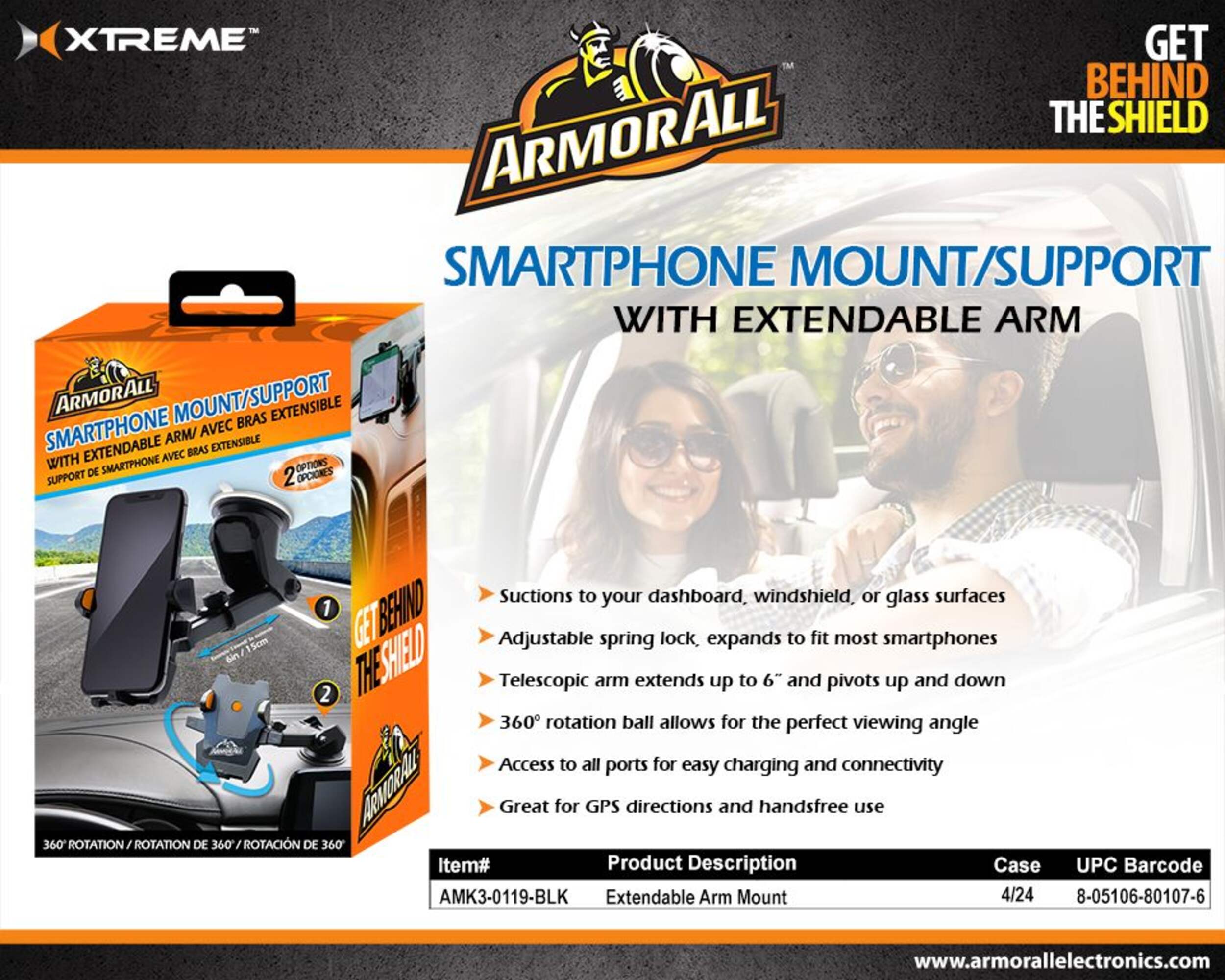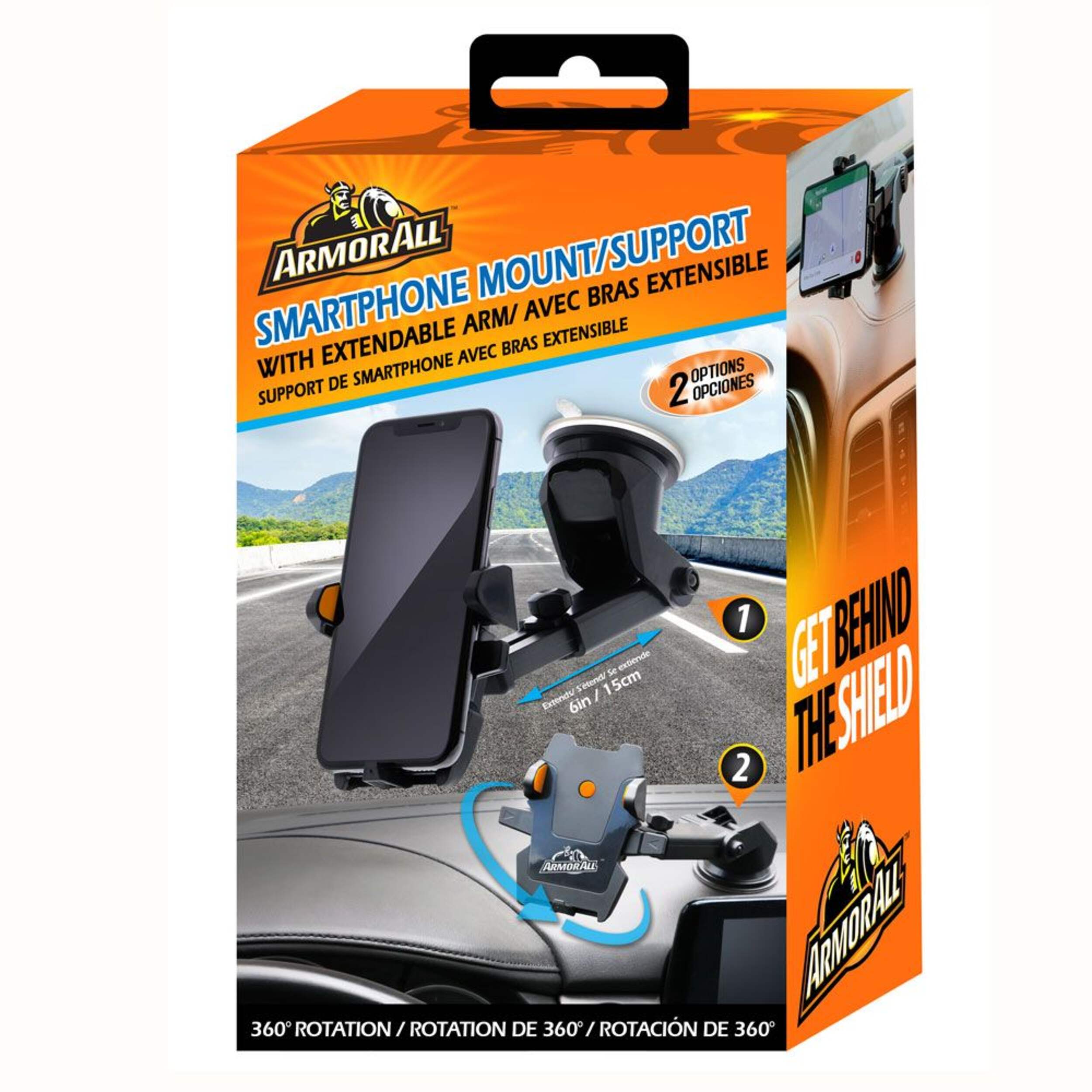 • Support pour téléphone intelligent Armor All avec bras extensible conçu pour offrir un ajustement sûr et universel, pour tenir la plupart des téléphones intelligents, même lorsqu'ils sont dans un étui