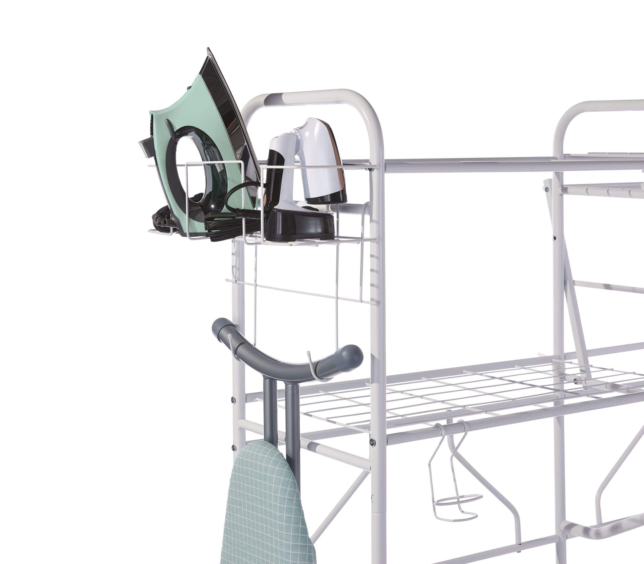 Panier latéral pour repassage pouvant contenir votre fer à repasser, votre défroisseur à vapeur standard et votre planche à repasser, et pouvant être installé de n'importe quel côté