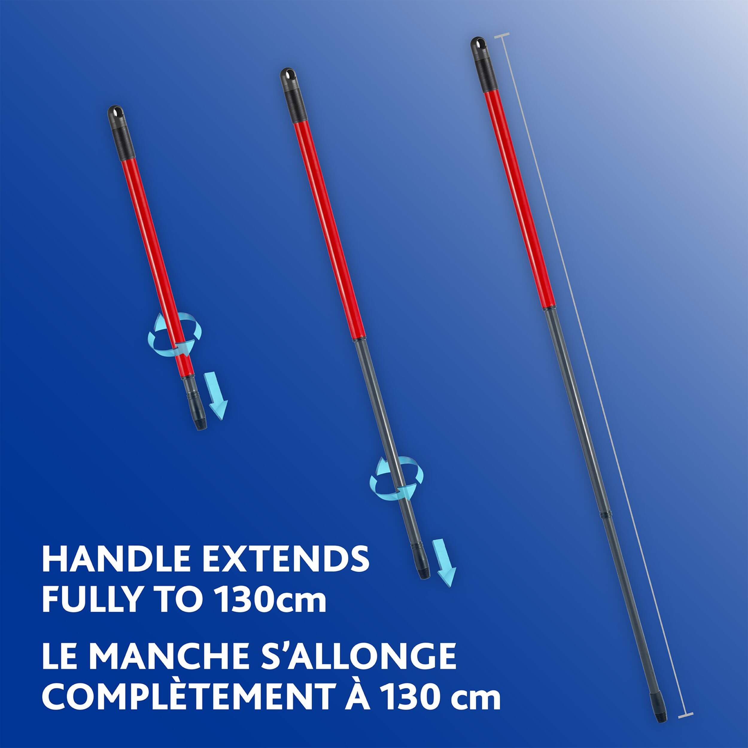 Poignée télescopique qui s'étend jusqu'à 130 cm pour étendre la portée sans avoir à vous pencher ou à vous étirer