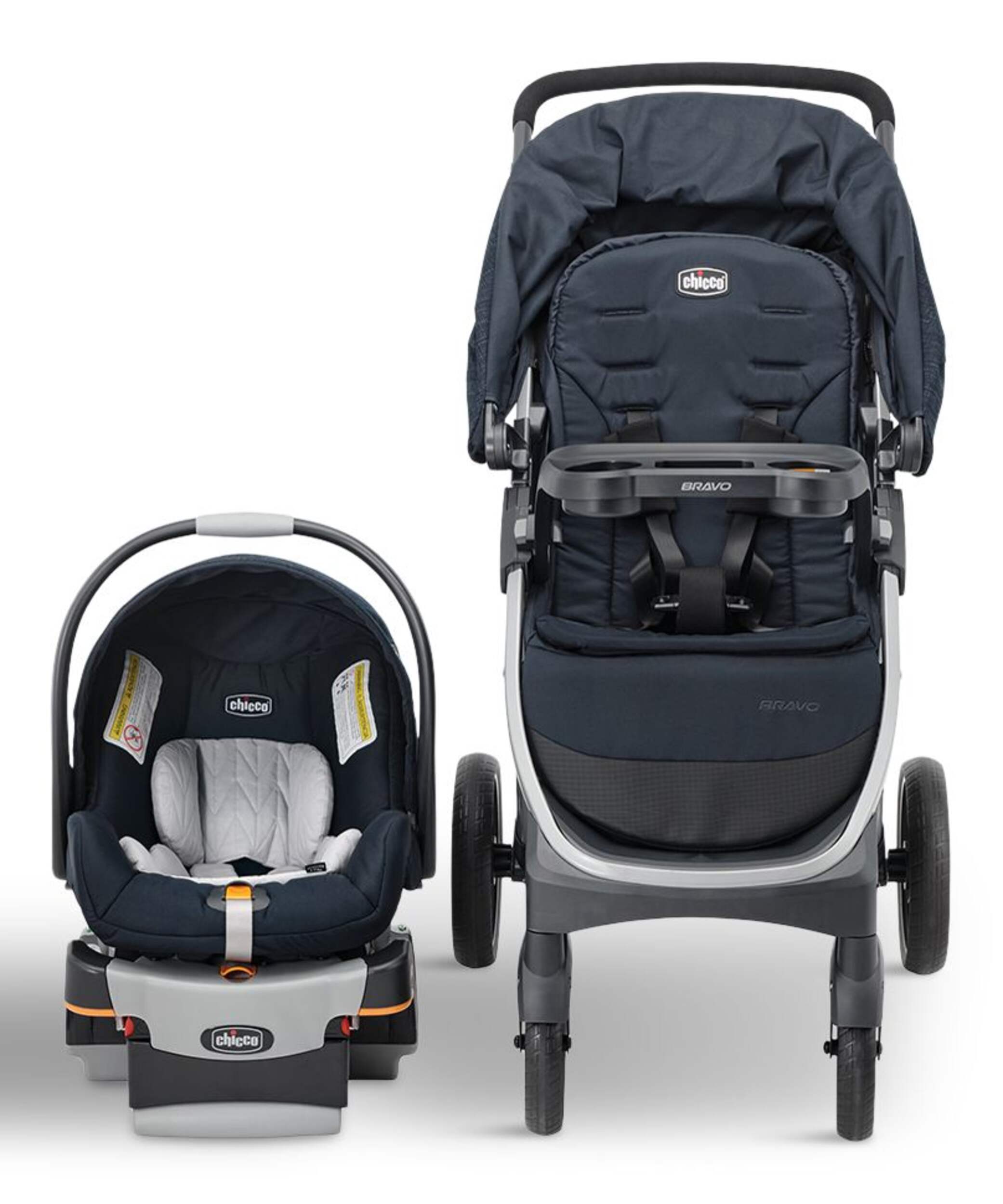 Système de voyage combinant la poussette Bravo à pliage rapide avec le siège auto KeyFitMD 30 et la base ajustable qui reste dans la voiture, pour simplifier les déplacements