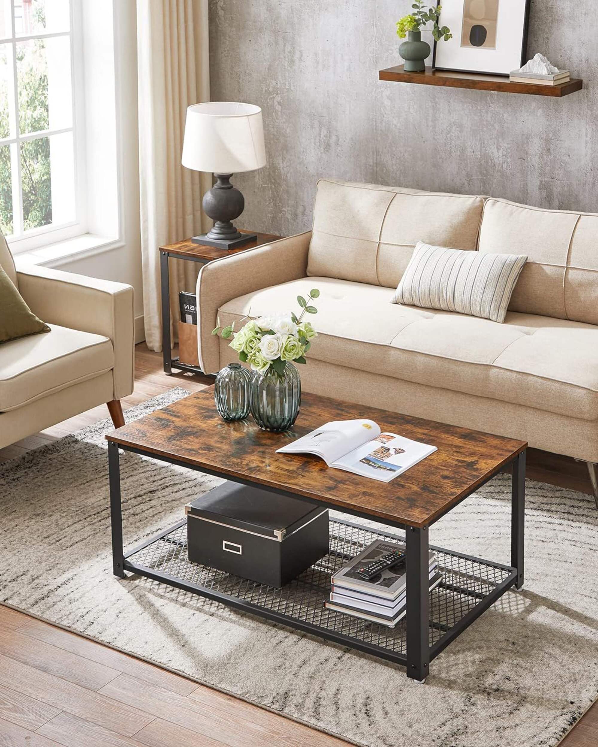 Fini brun rustique d'aspect bois avec garnitures en métal noir pour une touche industrielle