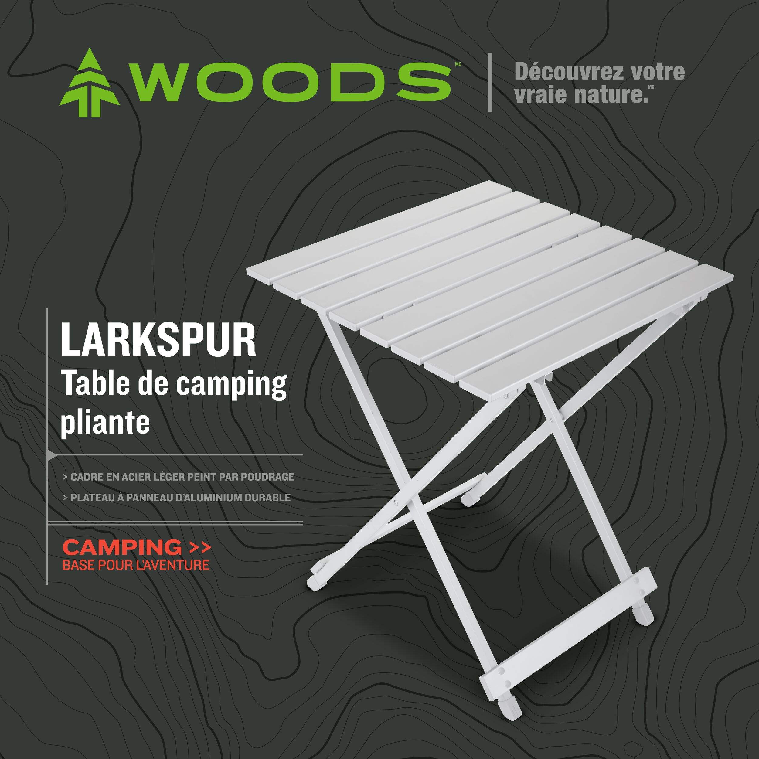 Besoin d'espace supplémentaire sur le terrain de camping? Dépliez cette table de camping pliante portative Woods Larkspur et cuisinez! Cette table est compacte, durable et très facile à installer. Fabriquée en aluminium et en acier légers, elle est idéale pour toutes les aventures en plein air. Que vous prépariez des repas ou ayez simplement besoin d'une surface robuste, la table Larkspur a ce qu'il vous faut.