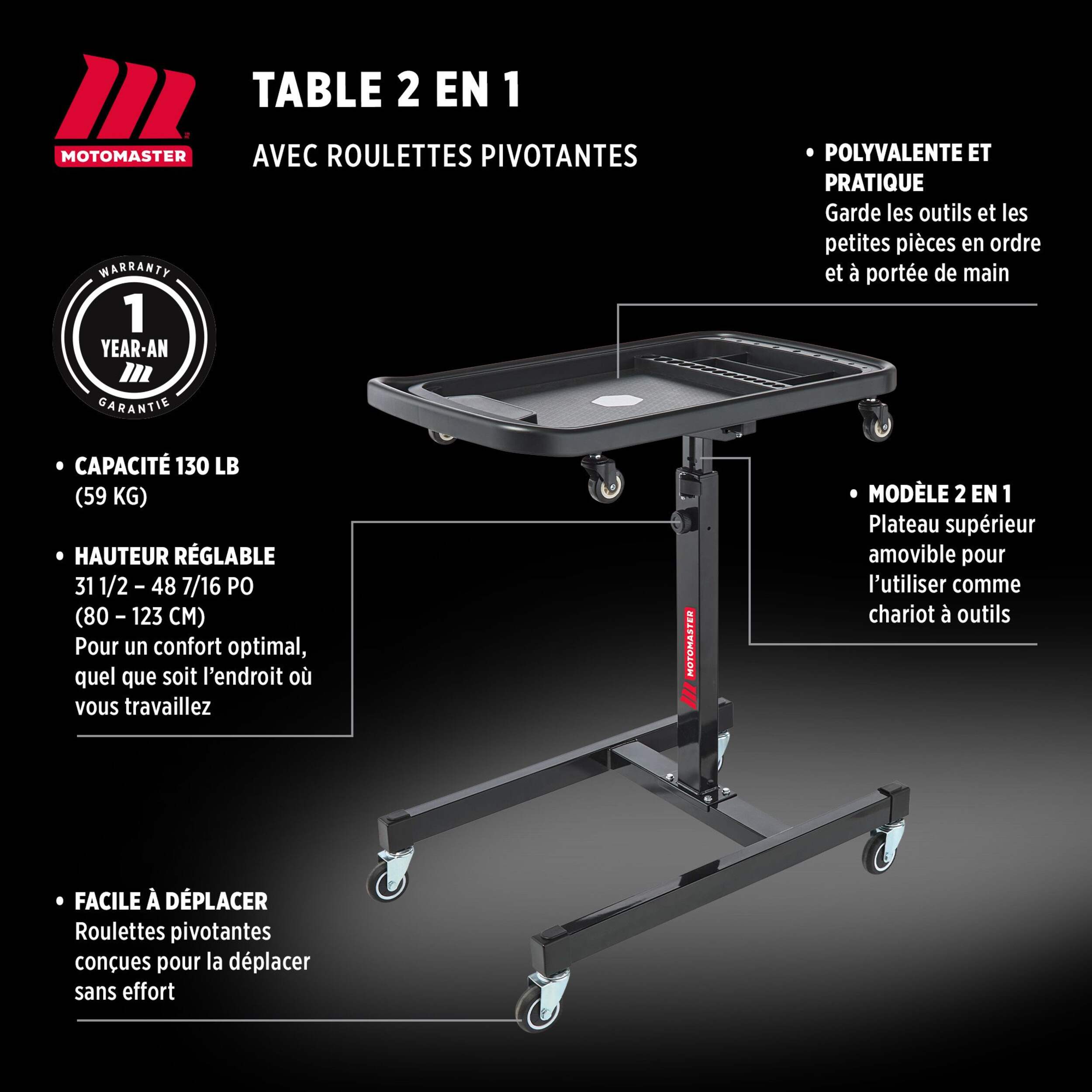Le plateau avec table de travail 2-en-1 réglable MotoMaster est un ajout polyvalent à n'importe quel espace de travail. Avec sa hauteur réglable et sa robustesse, il offre une surface fiable pour diverses tâches. Idéal pour les projets professionnels et les projets de bricolage, ce plateau avec table de travail est pratique et efficace dans votre environnement de travail.