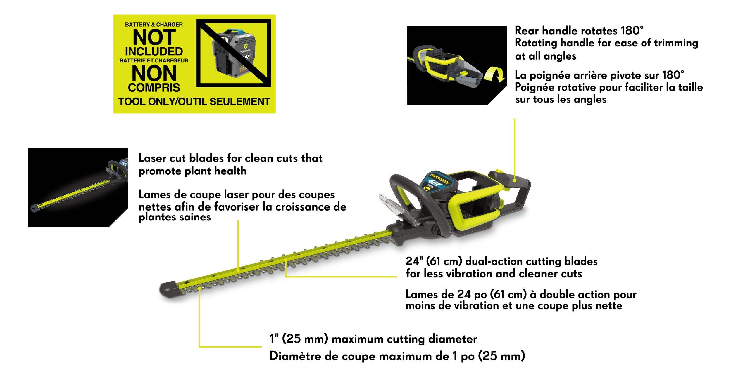 Entretenez votre pelouse en toute simplicité grâce au taille-haie sans fil au lithium-ion Yardworks, 48 V. Cet outil puissant est doté de lames de coupe à double action qui permettent des coupes nettes et efficaces, favorisant une croissance saine avec une capacité de coupe maximale de 1 po. Son modèle novateur minimise les vibrations pour plus de confort pendant l'utilisation. Grâce à la poignée arrière qui pivote à 180 degrés, il est facile et précis de tailler sous différents angles.