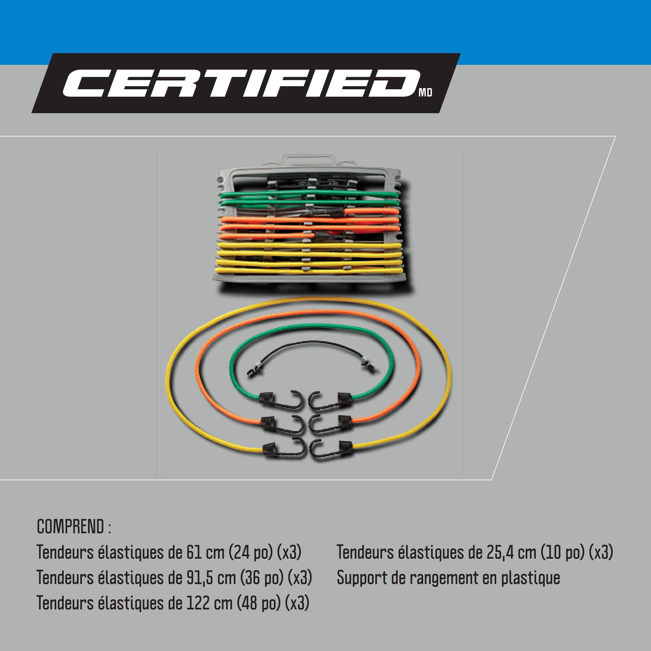 Comprend : 3 tendeurs élastiques de 61 cm (24 po), 3 tendeurs élastiques de 91,5 cm (36 po), 3 tendeurs élastiques de 122 cm (48 po), 3 tendeurs élastiques de 25,4 cm (10 po) et 1 support de rangement en plastique