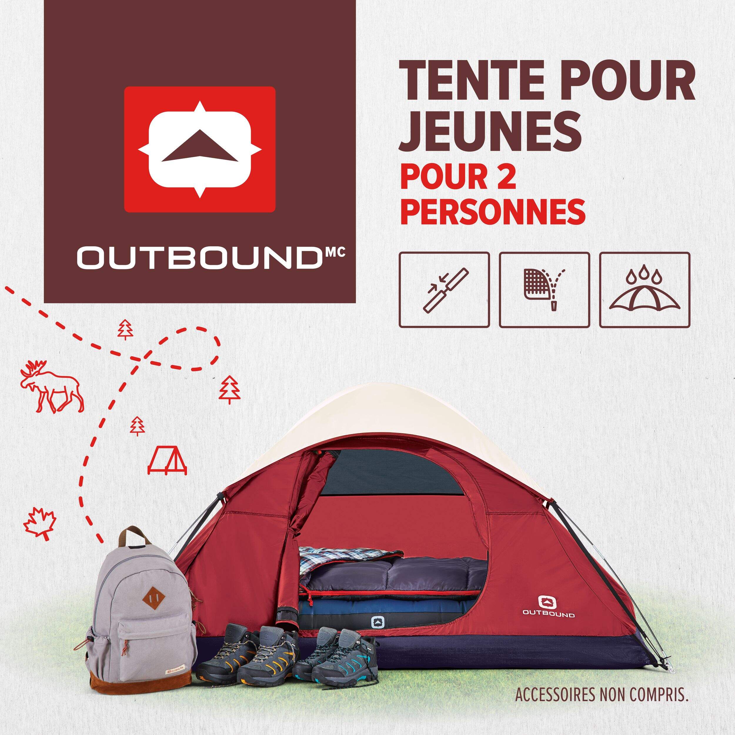 Comprend : piquets de tente, haubans, sac de transport et instructions d'assemblage