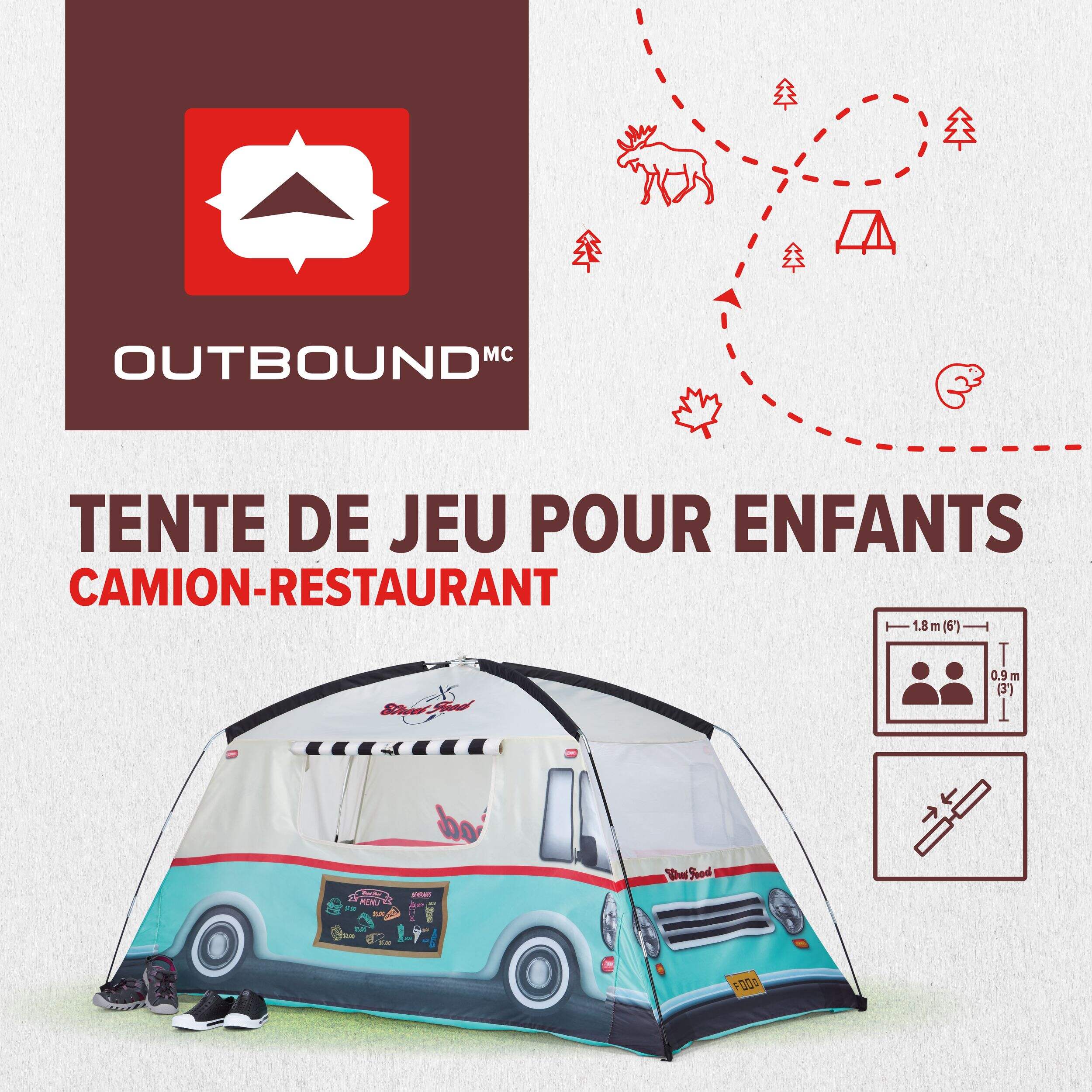 La tente de jeu portative pour camion à aliments Outbound pour enfants offre une façon agréable pour les enfants de s'amuser de façon créative. Facile à installer et assez spacieuse pour deux enfants, elle est dotée d'une fenêtre de service latérale pour faire semblant de cuisiner. Lorsque le jeu est terminé, elle se replie facilement dans un sac de transport pour faciliter le rangement et le transport.
