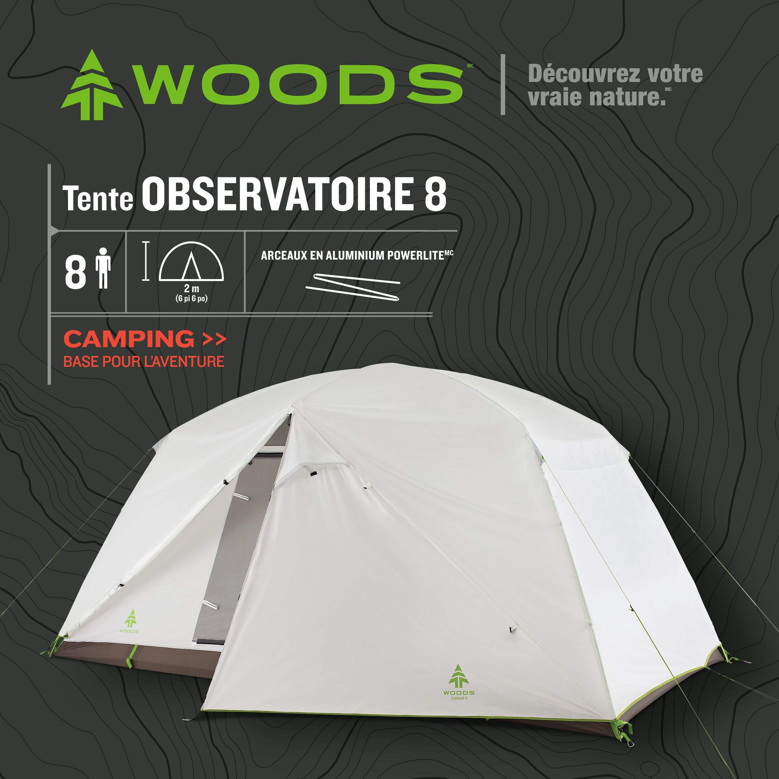 Explorez le plein air avec la tente Woods Lookout pour 8 personnes. Cette tente spacieuse d'avant-pays 3 saisons est idéale pour 8 personnes. La construction de la tente de camping comprend 75 % de polyester indéchirable non teint et le tissu du double toit, à l'exclusion des garnitures. Le tissu non teint utilise moins d'eau, d'énergie et de produits chimiques. Grâce à sa résistance exceptionnelle à l'eau avec 5 000 mm planchers recouverts de protection imperméable RainguardMC et 2 000 mm double-toit avec coutures scellées, vous restez protégé contre les intempéries. Ses mâts légers et durables PowerliteMC en aluminium sont fermes et assurent la stabilité au sol. Restez bien aéré grâce aux grandes portes en filet No-See-Um et aux panneaux de fenêtre qui protègent contre les insectes lorsque vous êtes à l'extérieur. De plus, la tente facile à monter est dotée de 2 vestibules pour une entrée protégée et le rangement de l'équipement. La tente familiale comprend un étui de transport, des cordons d'ancrage, un manuel d'utilisation, des mâts, un double toit, des piquets, une poche range-tout et un vestibule.