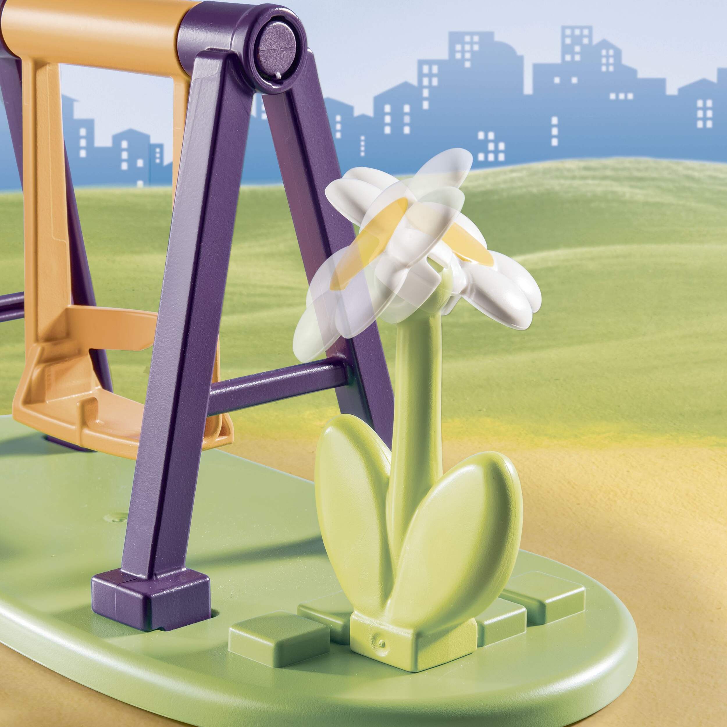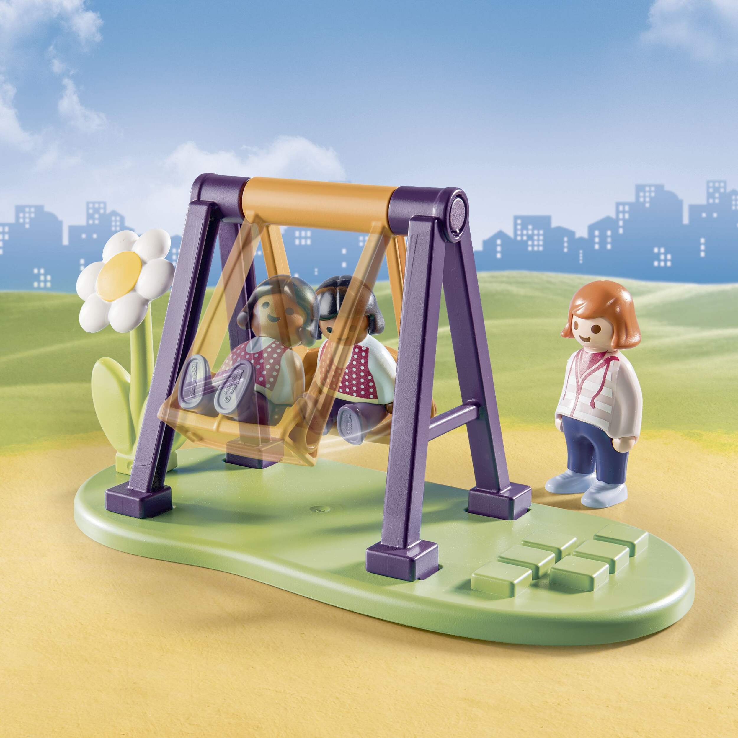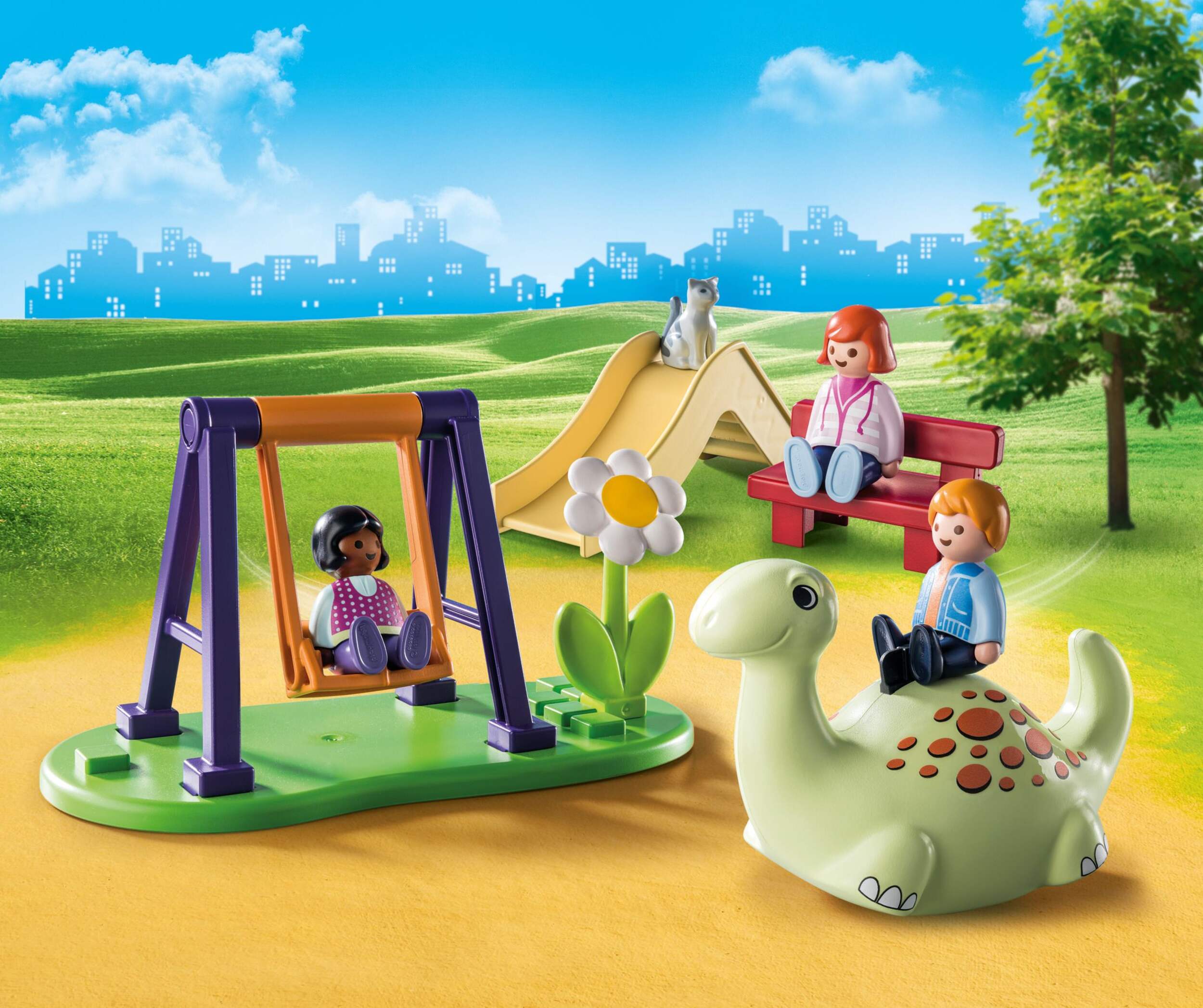 Descendez la glissade dans le de jeu terrain de jeu aventure 1-2-3 Playmobil pour une pause en plein air excitante, puis profitez de l'air frais en faisant un tour sur la balançoire