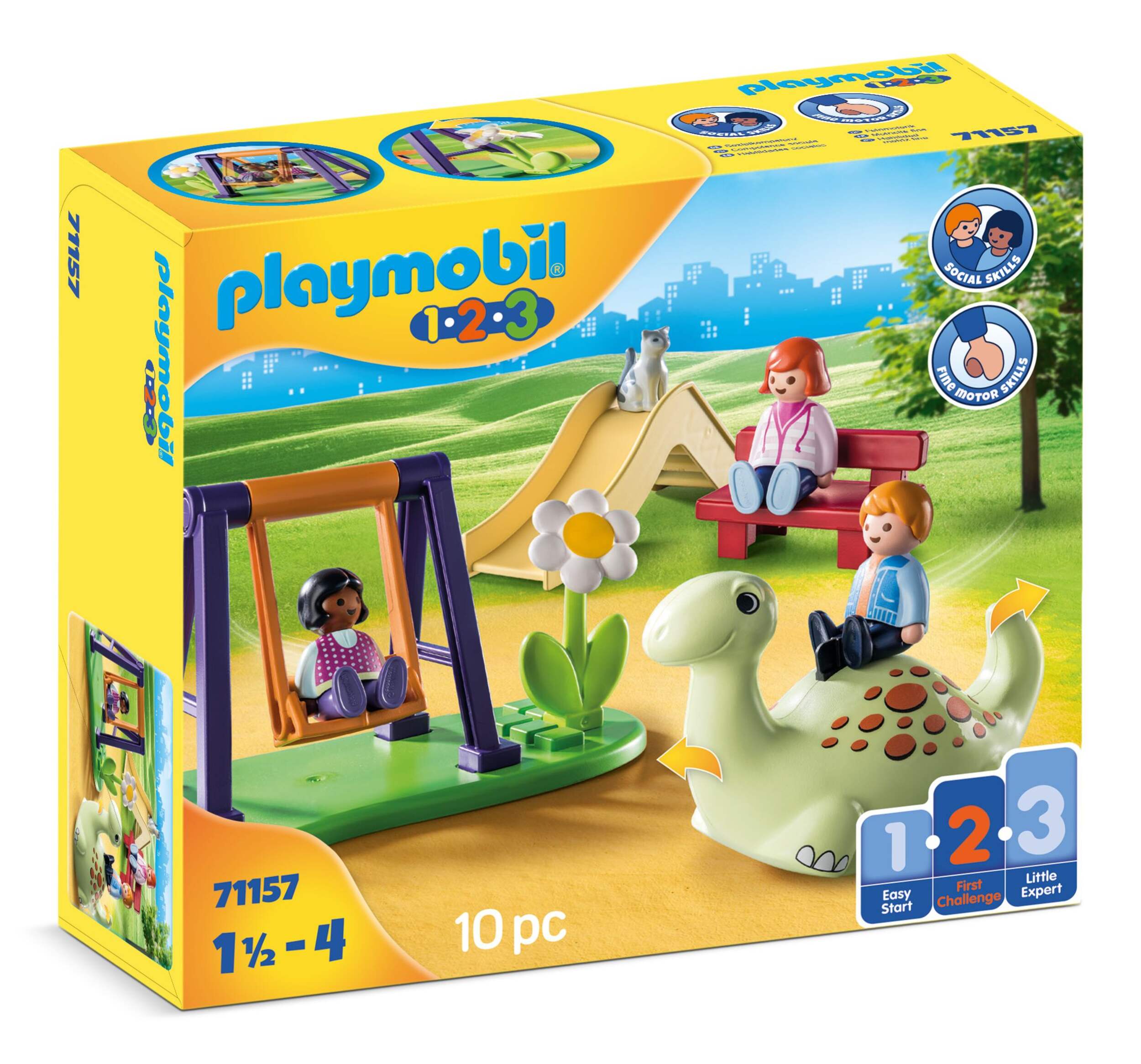 Le terrain de jeu aventure 1-2-3 Playmobil est une aventure en format miniature. Glissez dans la glissade incurvée et remontez directement pour une autre descente. Faites de la balançoire et faites semblant que vous êtes en train de traverser le ciel. Les tout-petits adoreront entrer dans cette bascule en forme de dinosaure pour s'amuser en toute sécurité. Les couleurs primaires vives et formes simples de ce terrain de jeu 1-2-3 stimuleront les jeunes esprits en développant d'importantes habiletés motrices et langagières à 18 mois et plus. Accompagnant les enfants pendant leurs premières années de jeu, ce coffret de jeu est l'introduction parfaite au monde plus vaste du plaisir en plein air, offrant des heures d'aventures et des escapades imaginaires dans leur propre cour.
