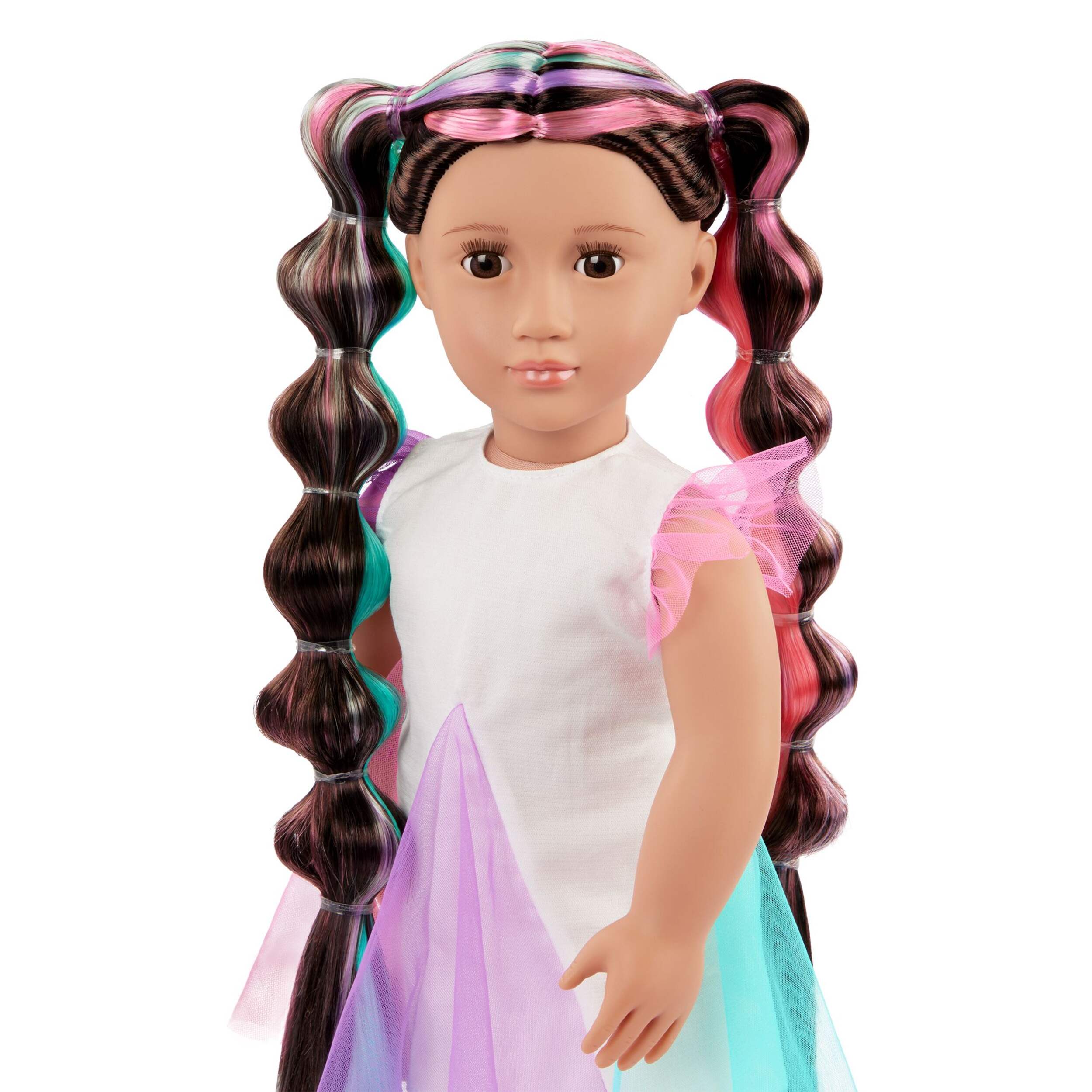 Comprend une poupée, une tenue, un peigne, 2 rallonges de cheveux, 2 pinces à cheveux et un livret de coiffure