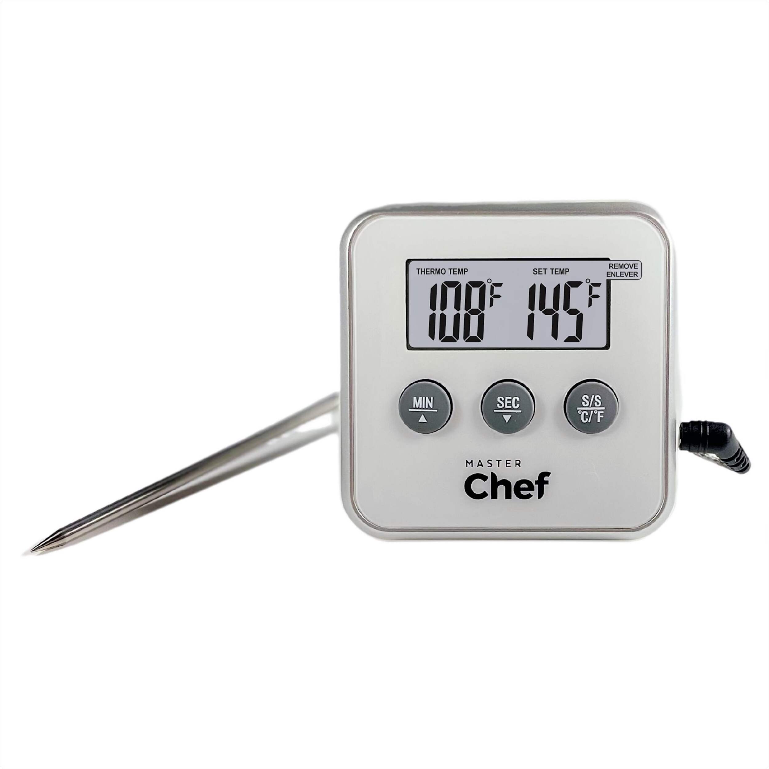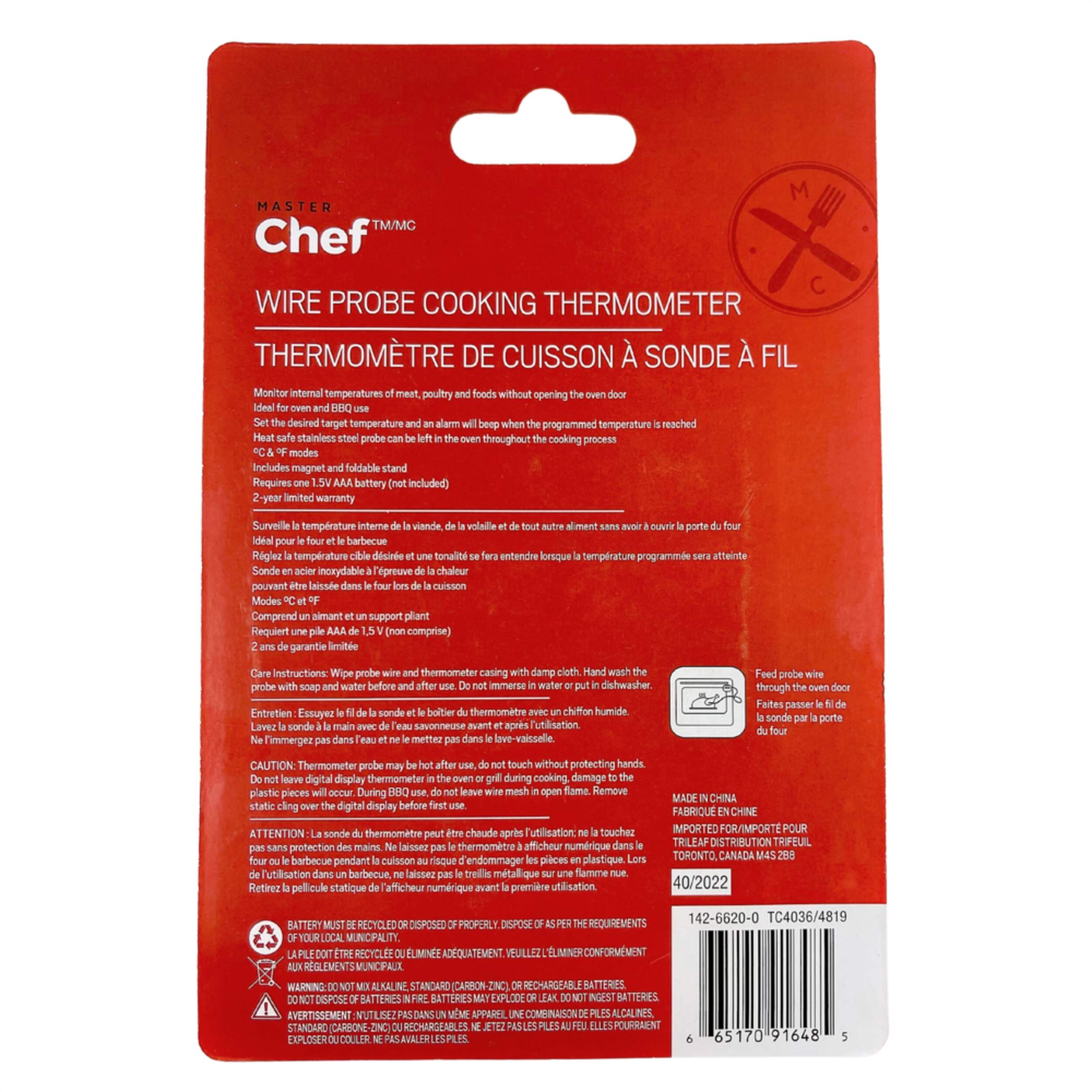Surveillez la température interne de n'importe quelle viande grâce au thermomètre de cuisson avec fil MASTER Chef. La sonde en acier inoxydable et résistante à la chaleur du thermomètre en plastique peut être laissée dans le four pendant toute la durée de la cuisson. Sa programmation manuelle est facile à utiliser : réglez la température et elle émet un bip lorsque la température programmée sera atteinte. Il mesure en Celcius et Fahrenheit, est doté d'un aimant et d'un support pliable, et nécessite une pile AAA pour fonctionner.