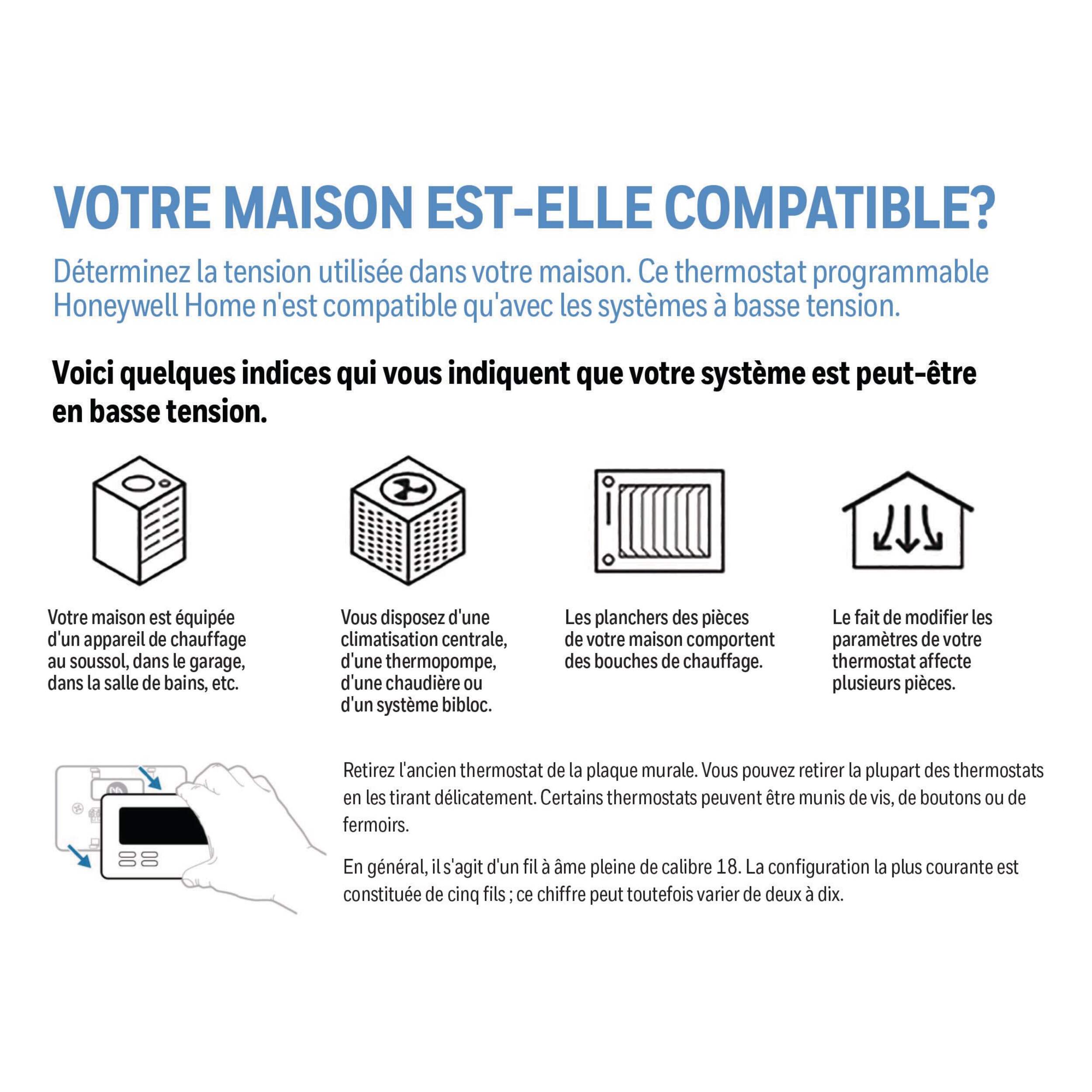 COMPATIBLE AVEC : Air pulsé (gaz, huile ou électricité), eau chaude et vapeur et pompes à chaleur avec renfort électrique. Ne fonctionne PAS avec les plinthes chauffantes électriques (120 à 240V)