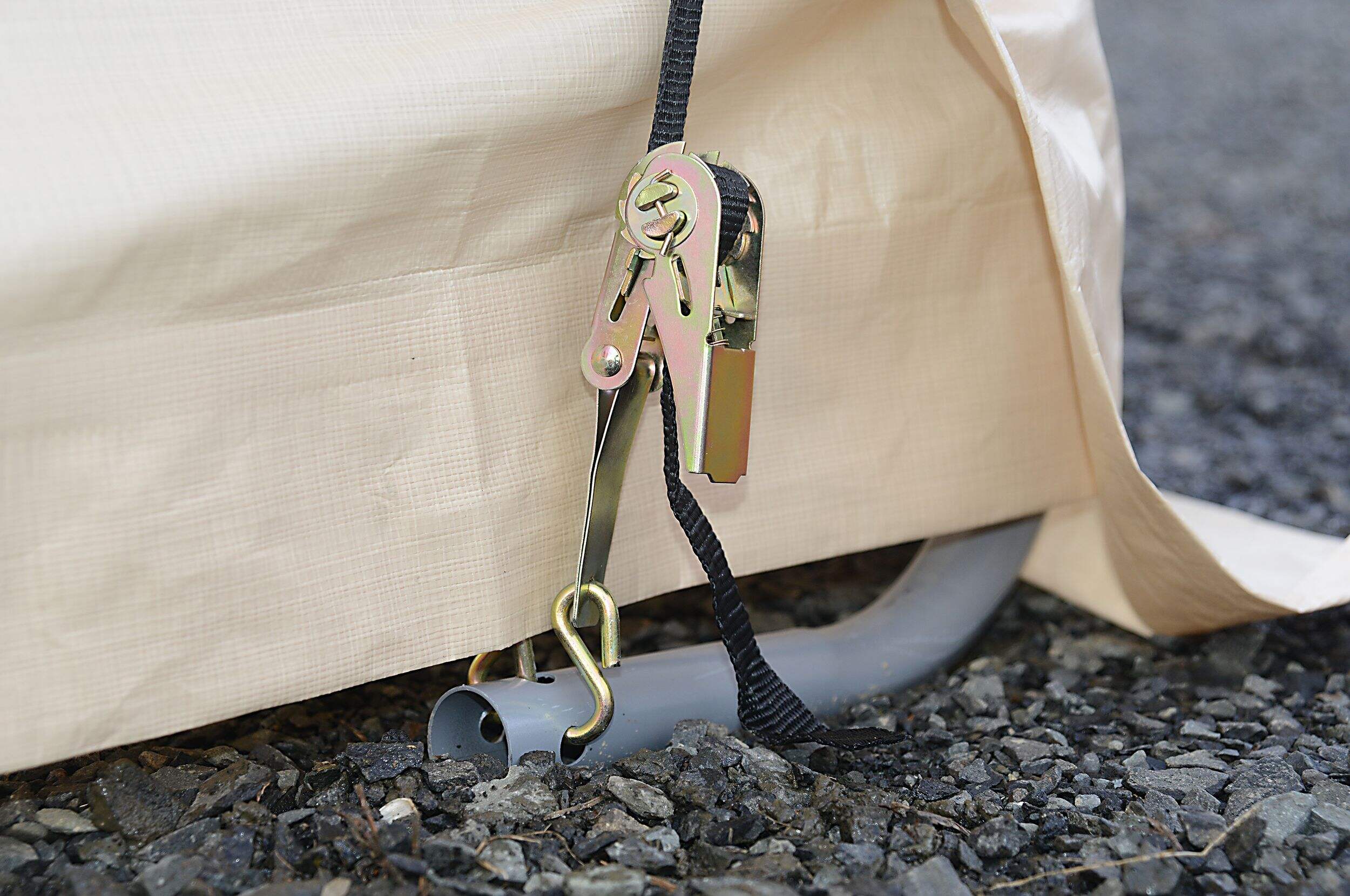 Système de tension à cliquet robuste offrant une installation simple tout en maintenant la toile bien tendue