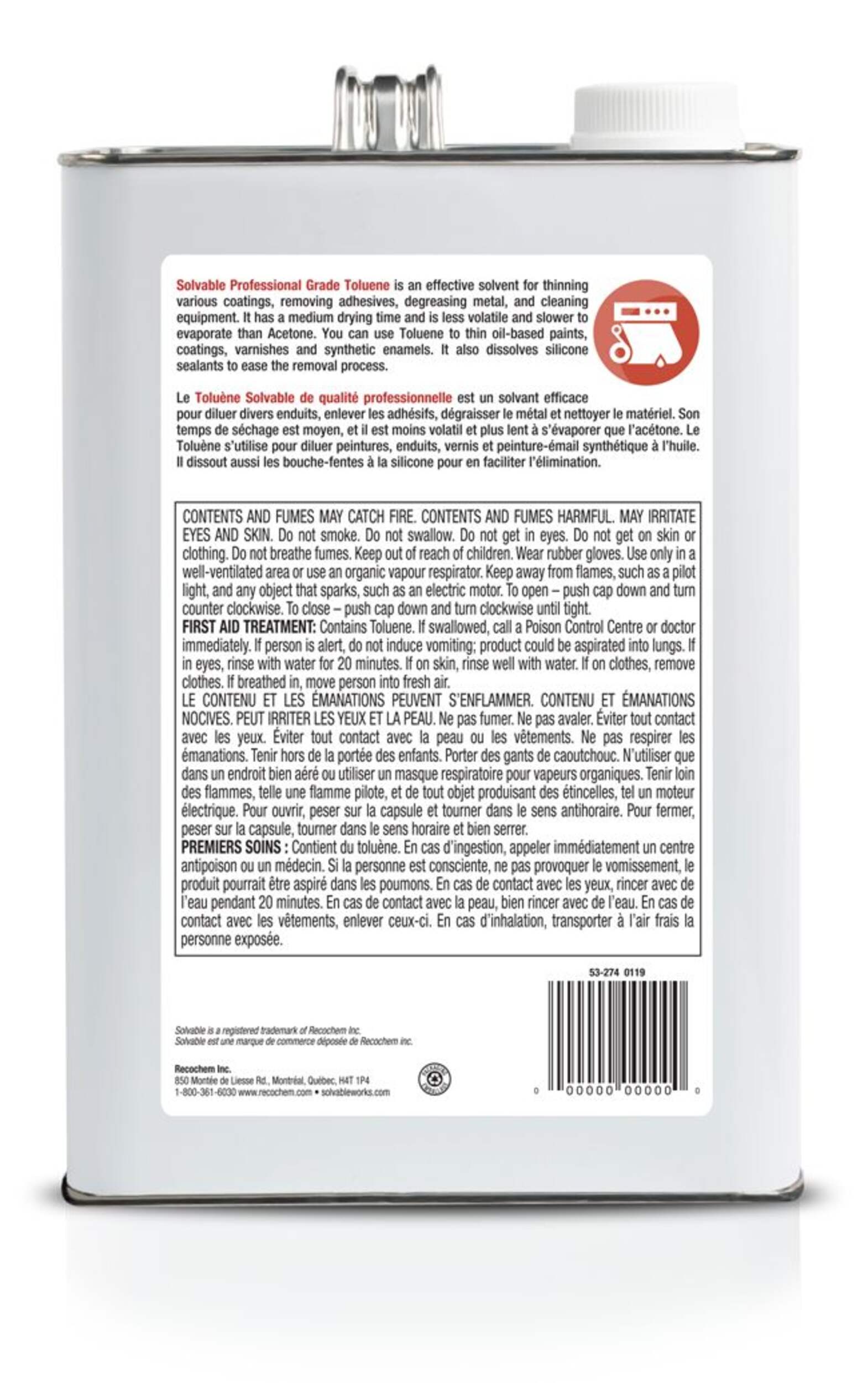 Le toluène soluble, 3,78 L, est un solvant à action rapide qui nettoie, dégraisse et accélère le temps de séchage des peintures et des laques à base d'huile. Il permet de dissoudre les encres et les adhésifs sur des surfaces telles que les outils et les équipements. Le bidon de 3,78 L permet d'éliminer rapidement la graisse des pièces métalliques et des machines, ce qui leur permet de sécher sans tache. Il pénètre dans les résidus collés que l'eau n'arrive pas à déloger, ce qui permet d'économiser du temps et des efforts par rapport aux méthodes de récurage et de grattage qui demandent plus de travail.