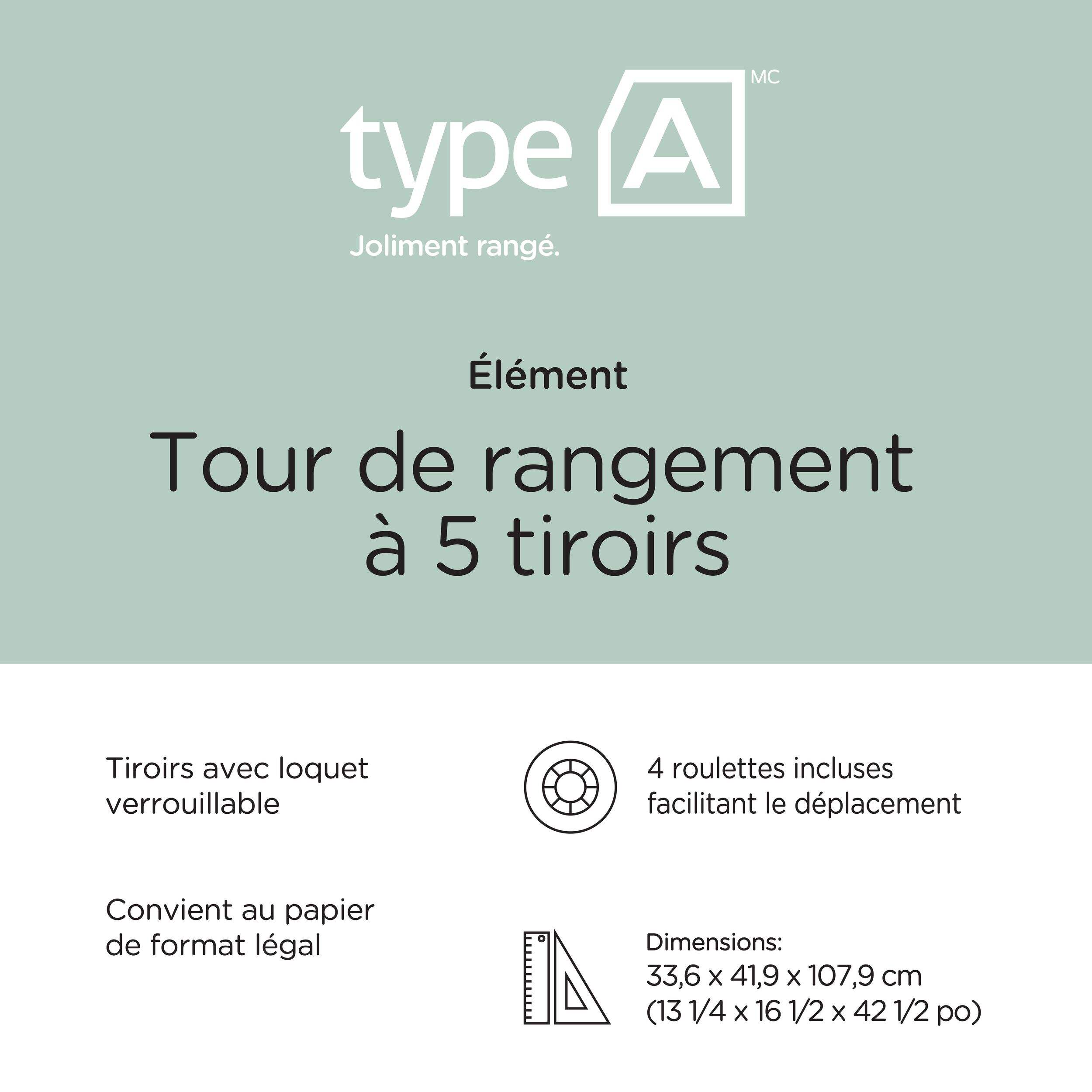 Organisez n'importe quelle pièce rapidement et facilement avec la tour de rangement verrouillable à cadre blanc Type A Element. Tour en plastique blanc dotée de 5 tiroirs de rangement spacieux qui peuvent être utilisés pour ranger une variété d'articles. Tour dotée de roulettes verrouillables pour que vous puissiez facilement la déplacer d'une pièce à l'autre et la fixer en place, ce qui la rend idéale pour gérer les vêtements et l'équipement saisonniers, pour organiser la chambre d'un enfant ou une aire de jeu.