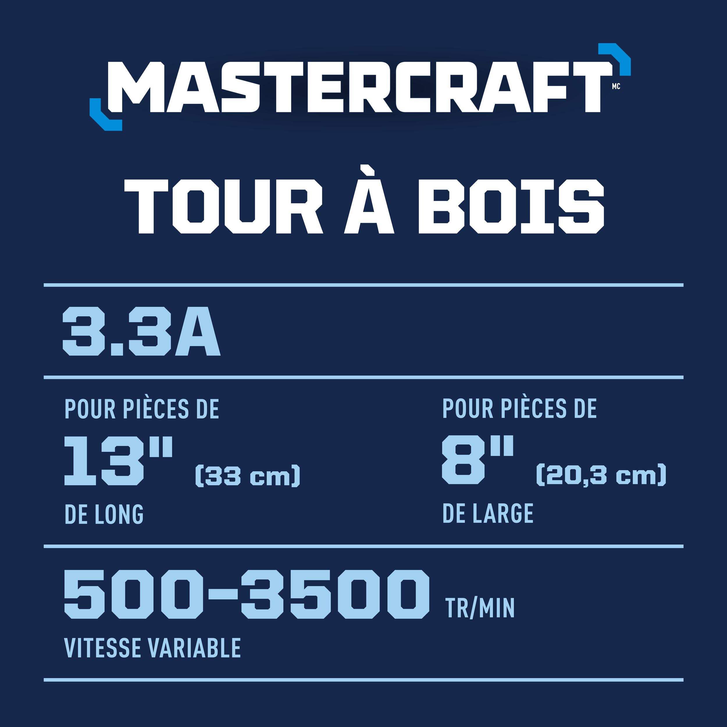 Tour Mastercraft avec tour à fil de 12 po conçu principalement pour le bois. Avec une vitesse variable entre 500 et 3 500 tr/min, ce tour Mastercraft convient aux pièces de 13 po de long et 8 po de large, et offre des accessoires pratiques comme un espace de rangement pour outils, des poignées de transport et une clé. Conçu pour durer, ce puissant tour à bois est également couvert par une garantie de 3 ans.