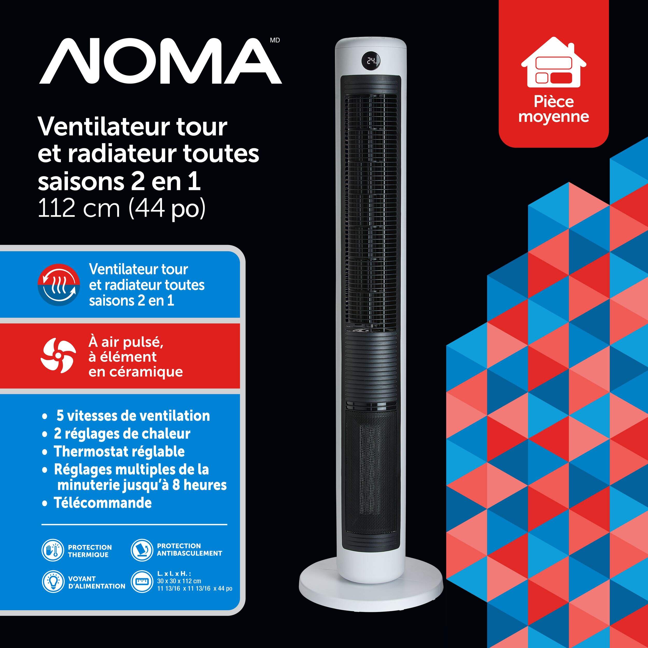 Le ventilateur tour et radiateur NOMA 2-en-1, 44 po, vous assurera un confort toute l'année. Avec ses cinq vitesses de ventilation silencieuses et ses deux réglages de chaleur, vous aurez la température idéale, que ce soit une nuit froide à l'intérieur ou une journée étouffante. L'oscillation automatique étendue assure une distribution uniforme de l'air, tandis que les fonctions de sécurité intégrées comme un interrupteur anti-basculement et une protection contre la surchauffe vous permettent de vous reposer facilement. Une fonction de minuterie et une fonction d'arrêt automatique préviennent le gaspillage d'énergie, vous permettant de vous concentrer sur des choses plus importantes que votre thermostat. Mesurant 111 cm (44 po), cette élégante tour combinée à radiateur soufflant est la seule machine à changer les conditions météorologiques dont vous avez besoin.