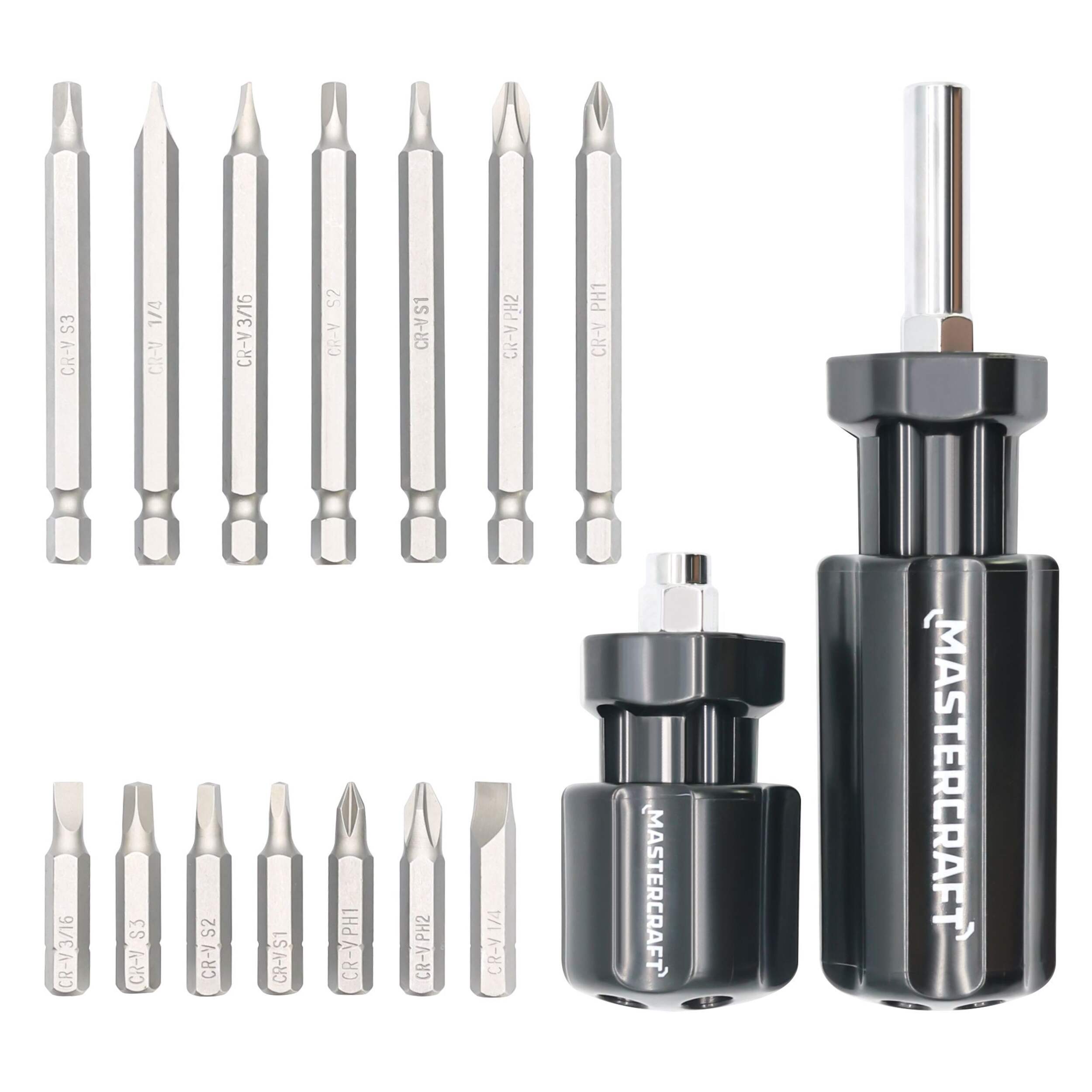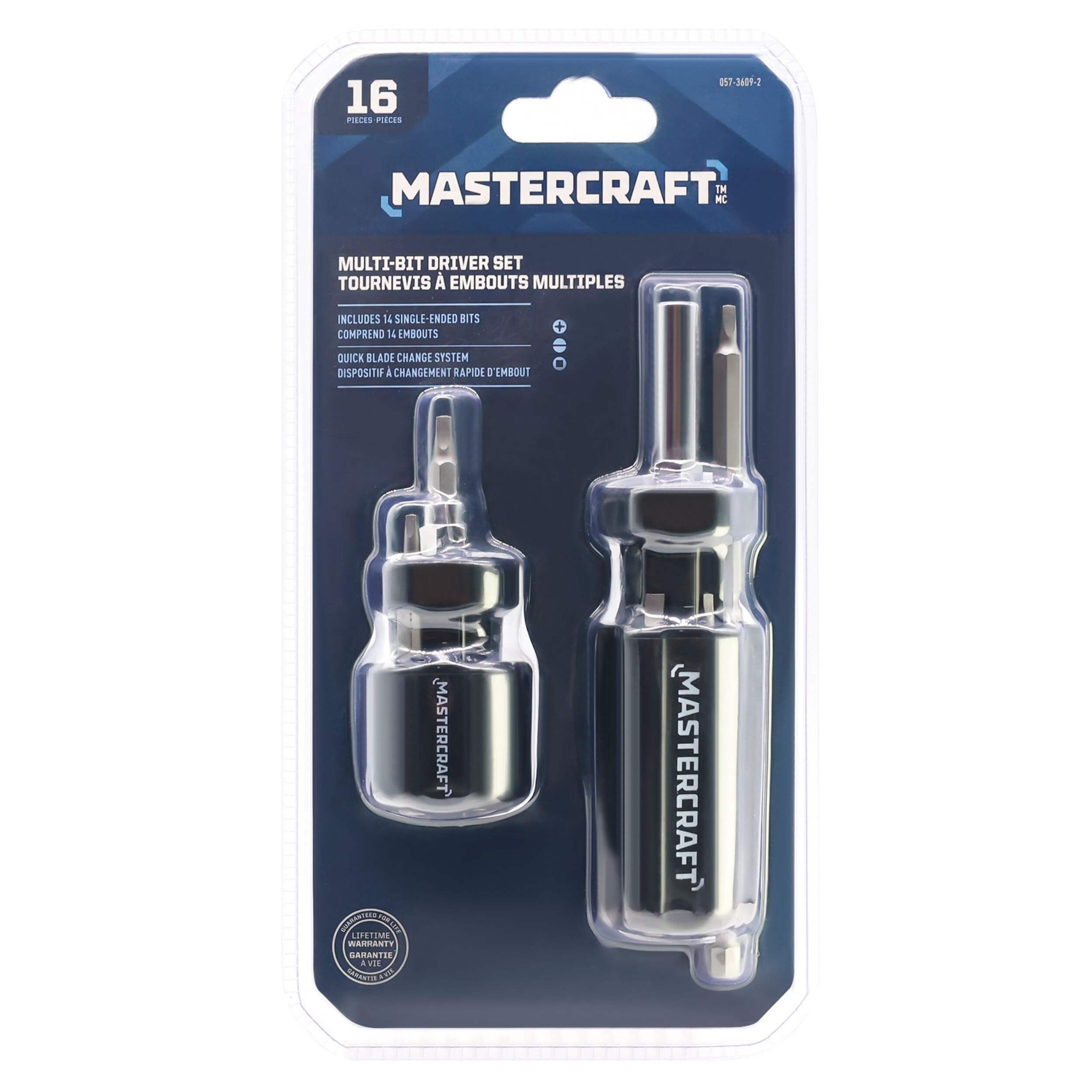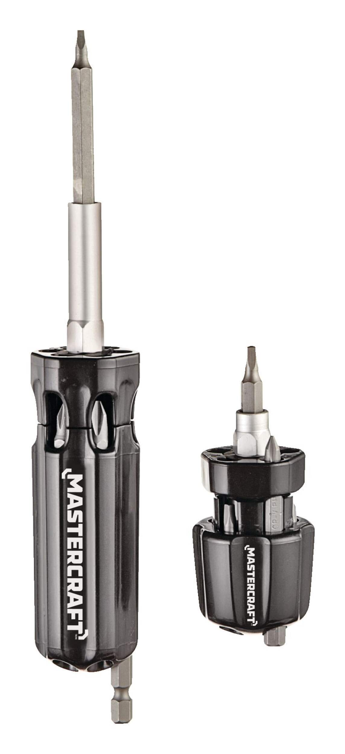 Travaillez rapidement et efficacement avec le tournevis 7-en-1 Mastercraft. Cet ensemble de 2 embout de tournevis multiples comprend un tournevis plat et un tournevis court, ainsi que 14 embouts de tournevis cruciformes, plats et carrés. Le système de changement de lame rapide vous aide à remplacer instantanément les embouts, tandis que le porte-embout magnétique maintient le foret en place pendant que vous vissez.