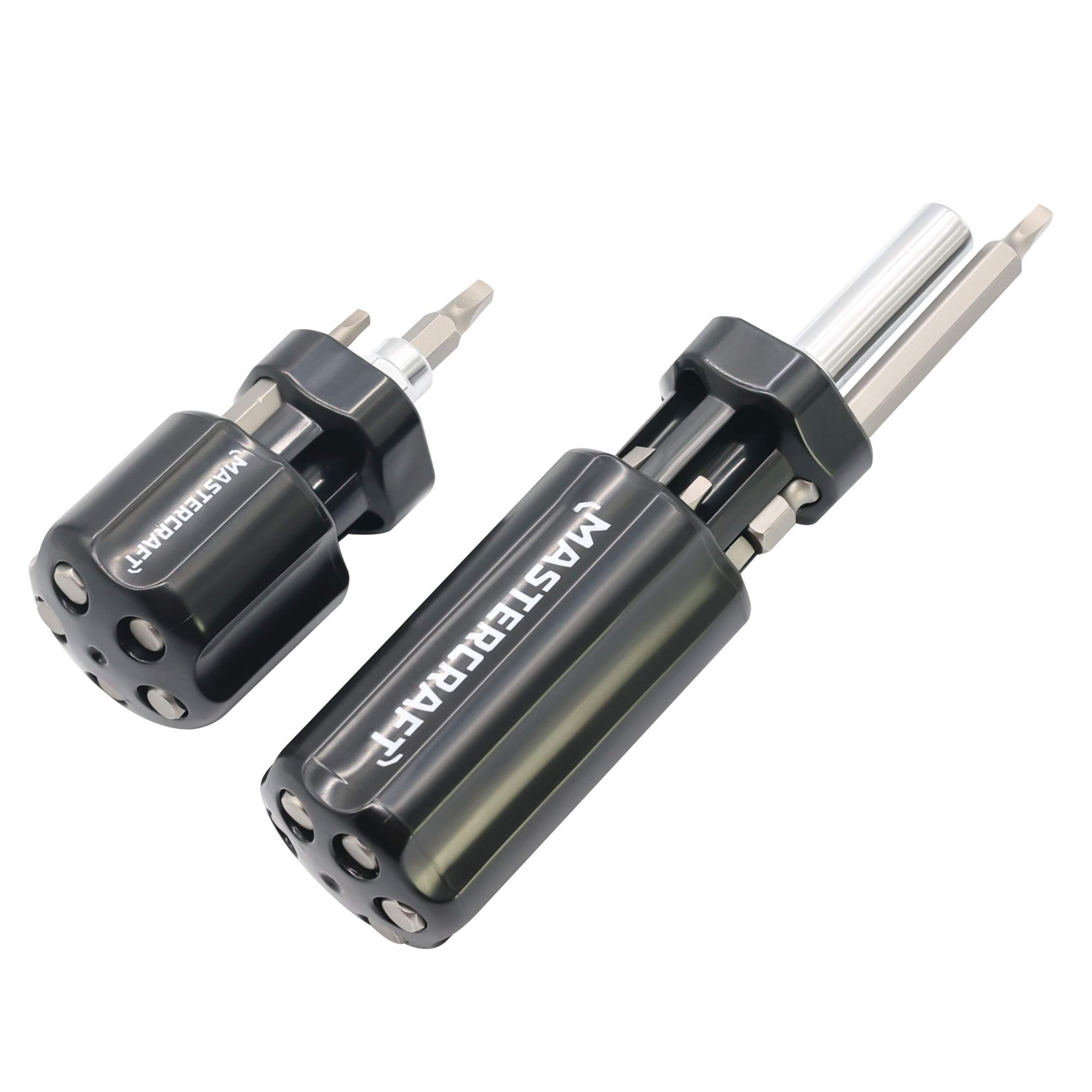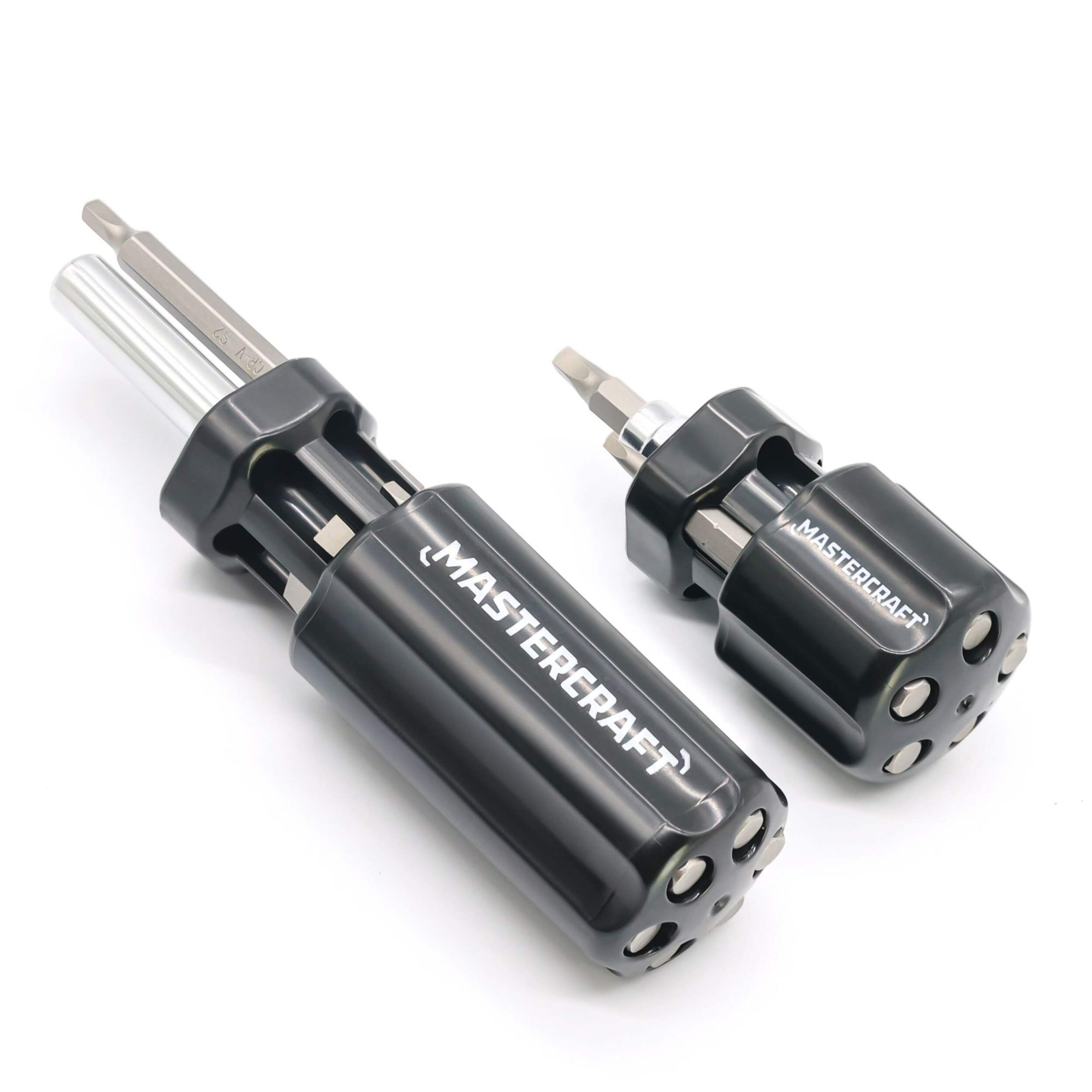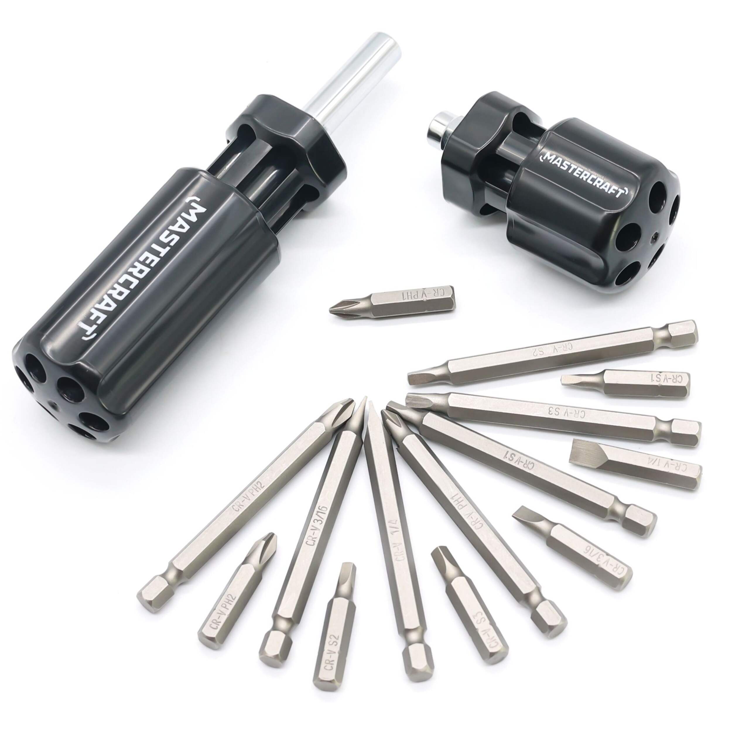 Travaillez rapidement et efficacement avec le tournevis 7-en-1 Mastercraft. Cet ensemble de 2 embout de tournevis multiples comprend un tournevis plat et un tournevis court, ainsi que 14 embouts de tournevis cruciformes, plats et carrés. Le système de changement de lame rapide vous aide à remplacer instantanément les embouts, tandis que le porte-embout magnétique maintient le foret en place pendant que vous vissez.