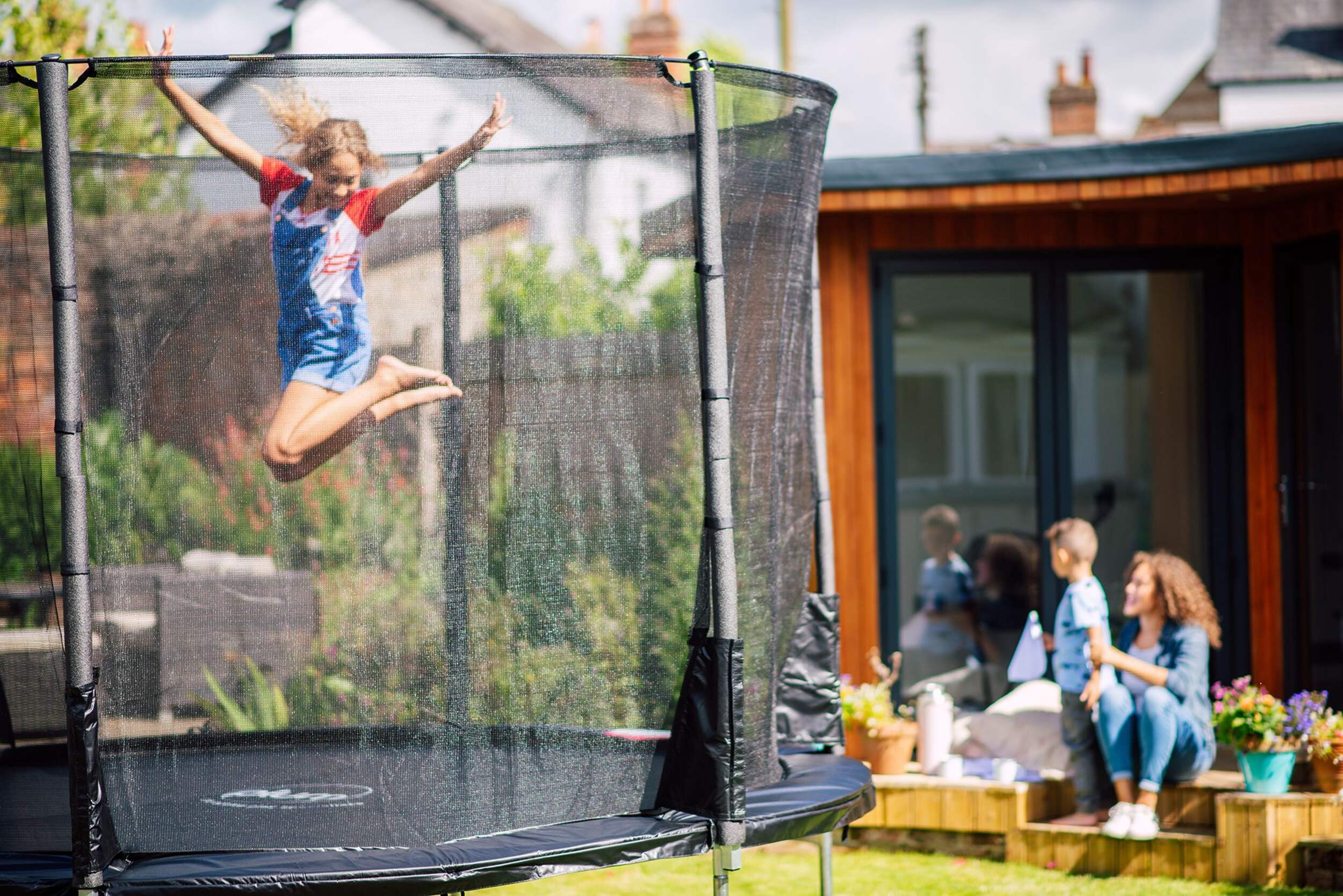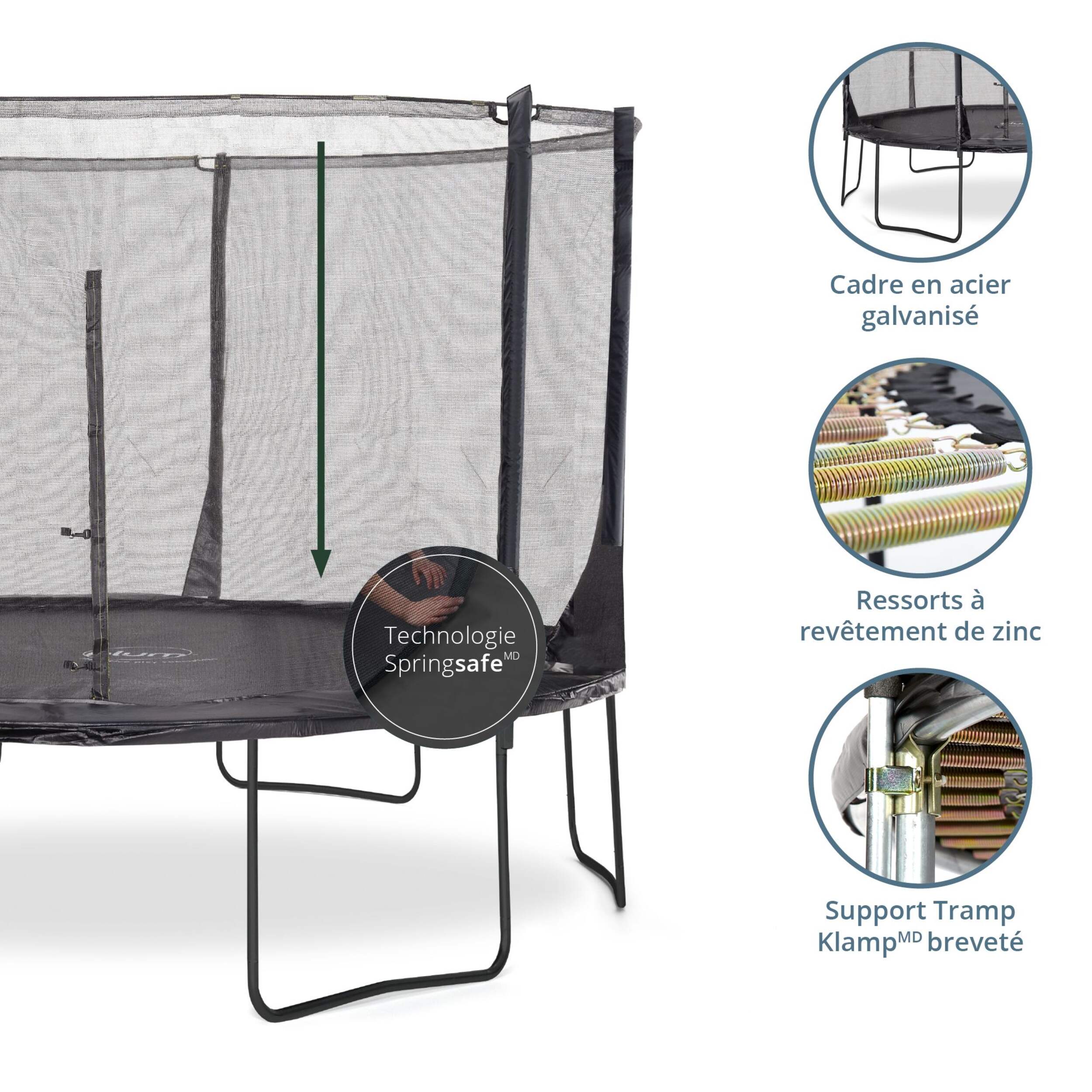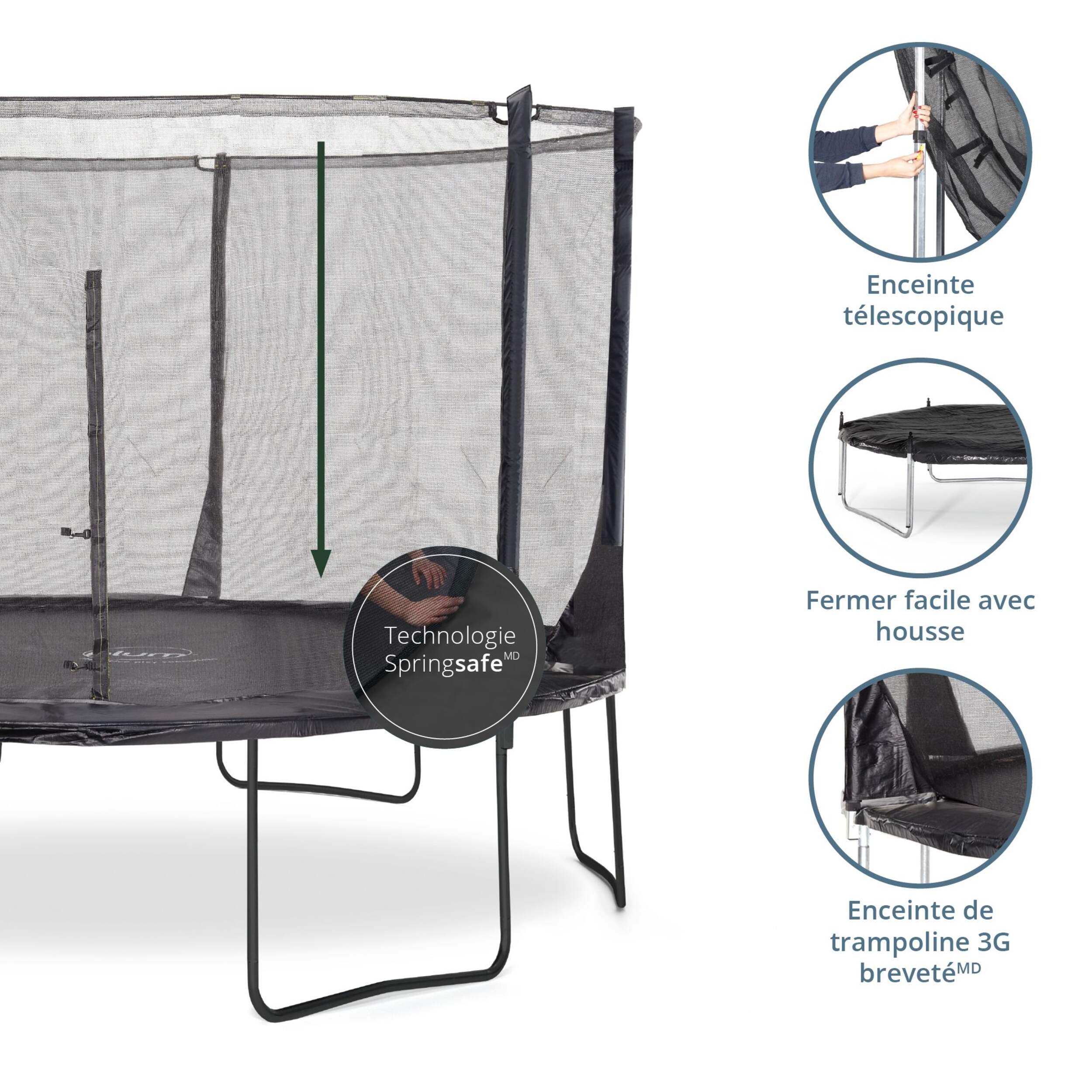 Trampoline Plum Space Zone avec enceinteMD SpringsafeMD 3G brevetée qui éloigne l'utilisateur des ressorts et de l'armature