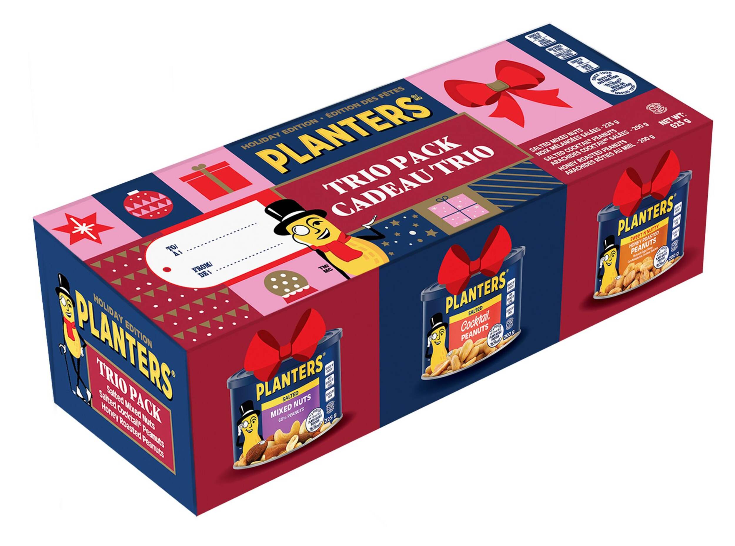 Comprend : 225 g de noix mélangées, 200 g d'arachides salées et 200 g d'arachides grillées au miel