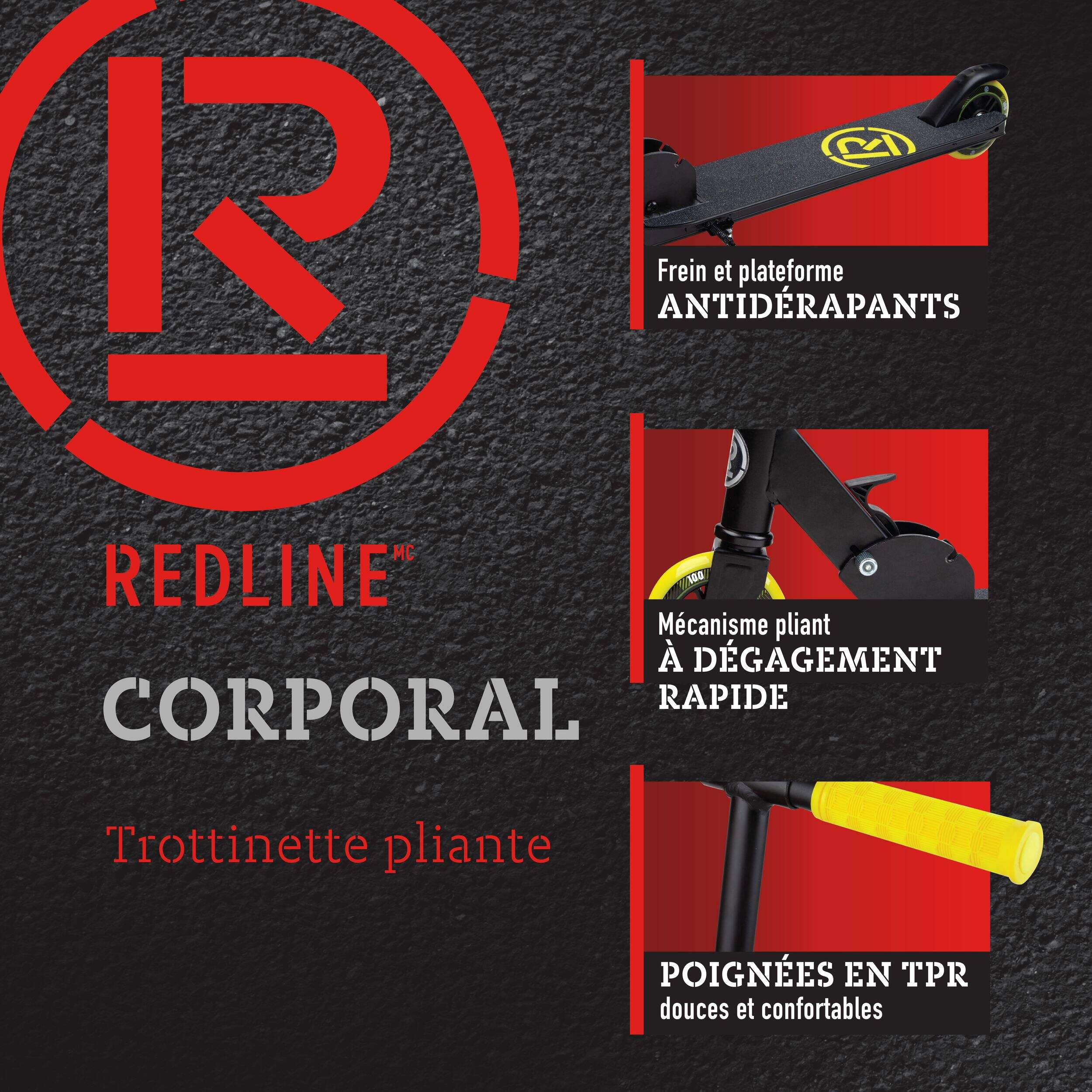 La trottinette réglable Redline Corporal offre une conduite fluide et fiable pour les cyclistes de tous âges. Équipée de roues de 4 po, cette trottinette assure stabilité et maîtrise sur une variété de surfaces. Le guidon réglable offre un ajustement personnalisé, ce qui le rend idéal pour les enfants et les adultes. Avec son cadre durable et sa conception noire élégante, la trottinette Redline Corporal allie style et fonctionnalité. Sa construction légère et pliable facilite le transport et le rangement, ce qui la rend idéale pour les déplacements, les activités en plein air ou les balades décontractées.