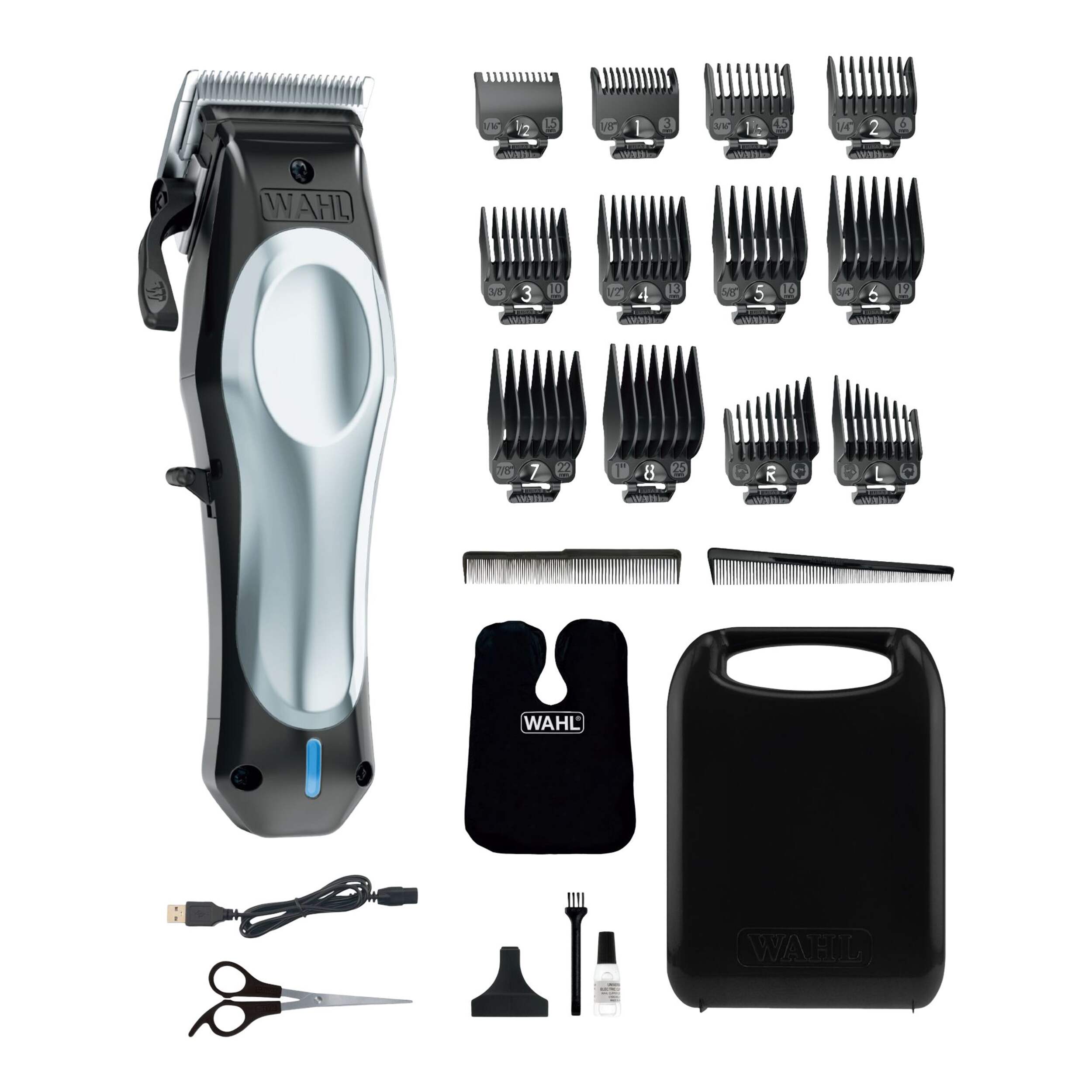 Comprend : un protège-lame à pince, un câble de chargement, une grande brosse de nettoyage, une brosse de nettoyage de finition, une huile pour lame, un peigne de barbier, un peigne de coupe, des ciseaux, un étui de rangement rigide, un rasoir et des instructions