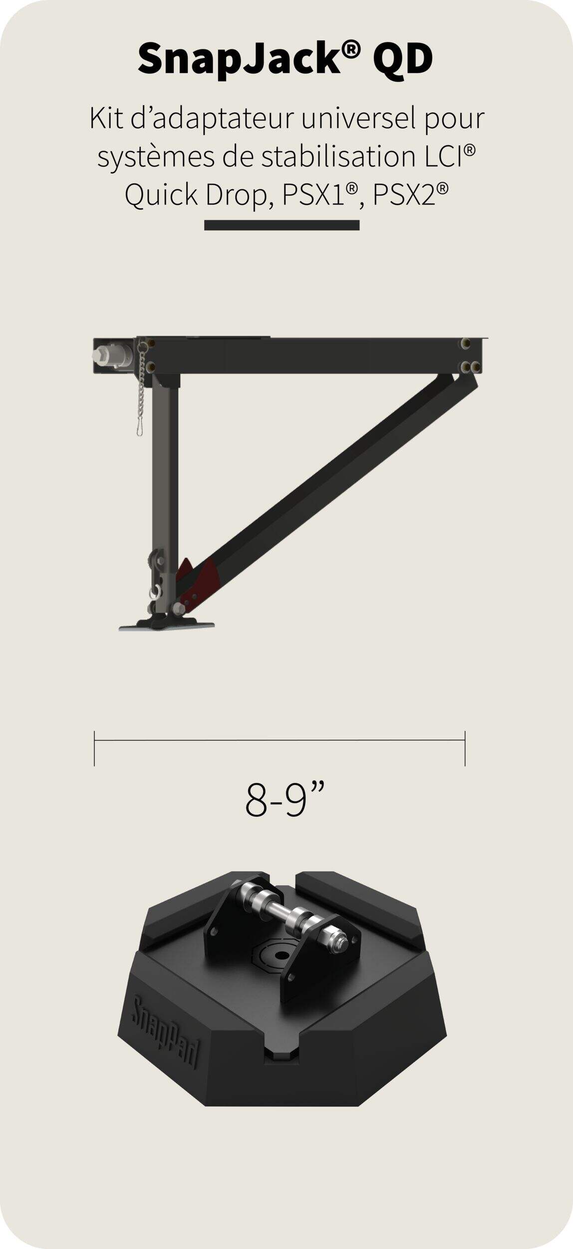 La trousse de conversion SnapJack QuickDrop QDU4 de SnapPad pour les systèmes de nivellement Quickdrop, PSX1, PSX1 offre une mise à niveau rapide et facile pour stabiliser les crics Quickdrop. Les coussins protecteurs en caoutchouc SnapJack augmentent l'empreinte au sol, atténuent les vibrations et s'adaptent aux terrains inégaux comme le gravier, empêchant ainsi l'enfoncement ou le déplacement de votre cric. Les miettes de pneu recyclées durables et la résine haute résistance conservent leur forme sous de lourdes charges. Dotés d'une prise texturée, ces blocs SnapJacks conviennent aux systèmes de nivellement Quickdrop, PSX1, PSX2 et augmentent la stabilité sur n'importe quelle surface. La plaque en acier au fini peint par poudrage de 1/4 po d'épaisseur incluse offre une base robuste. Profitez d'une commodité accrue avec cette amélioration.