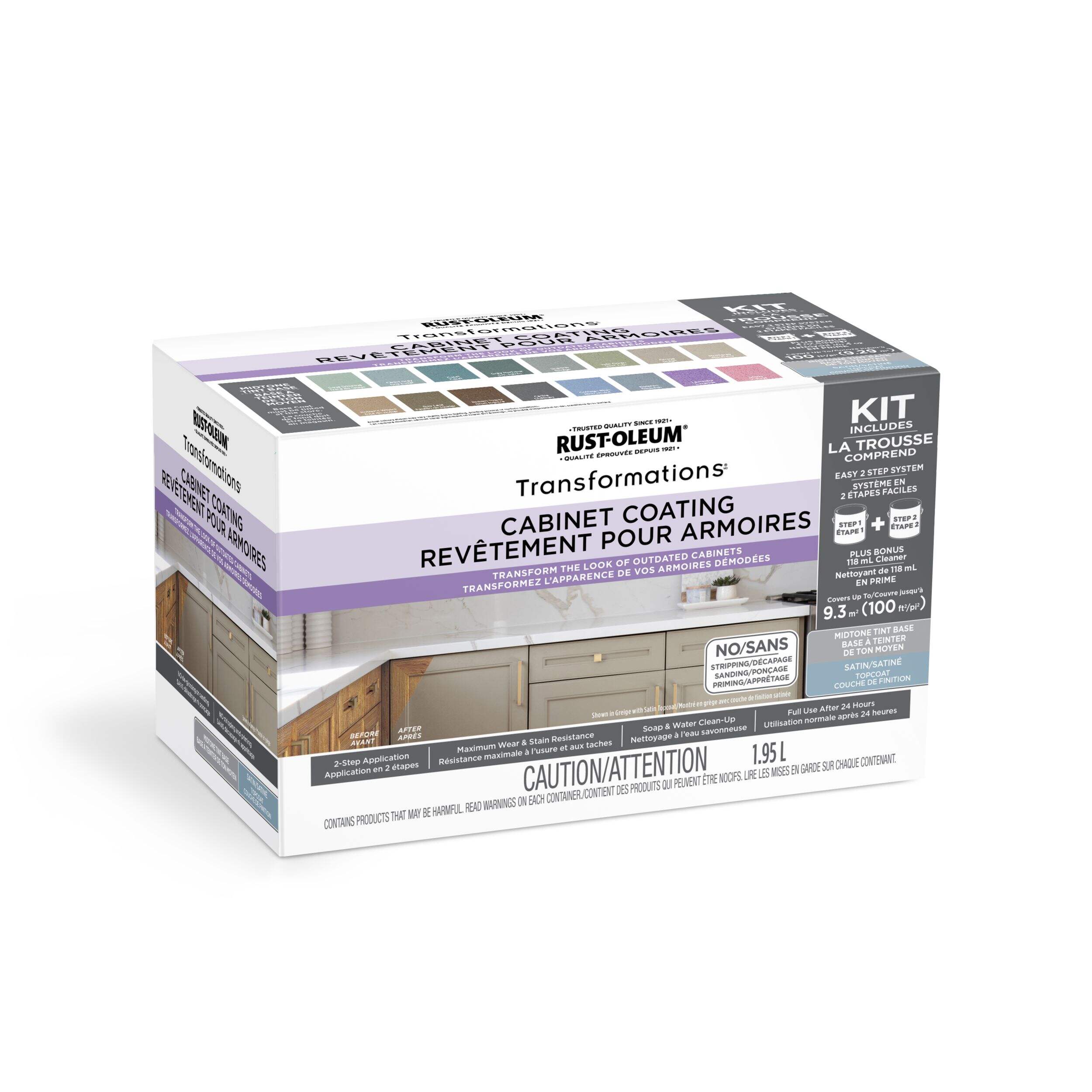 Trousse de rénovation de revêtement pour armoire Rust-OleumMD TransformationsMD offrant un système de revêtement novateur qui change complètement l'apparence des vieilles armoires usées pour donner l'effet de magnifiques armoires créées à la main, sans les frais de les remplacer