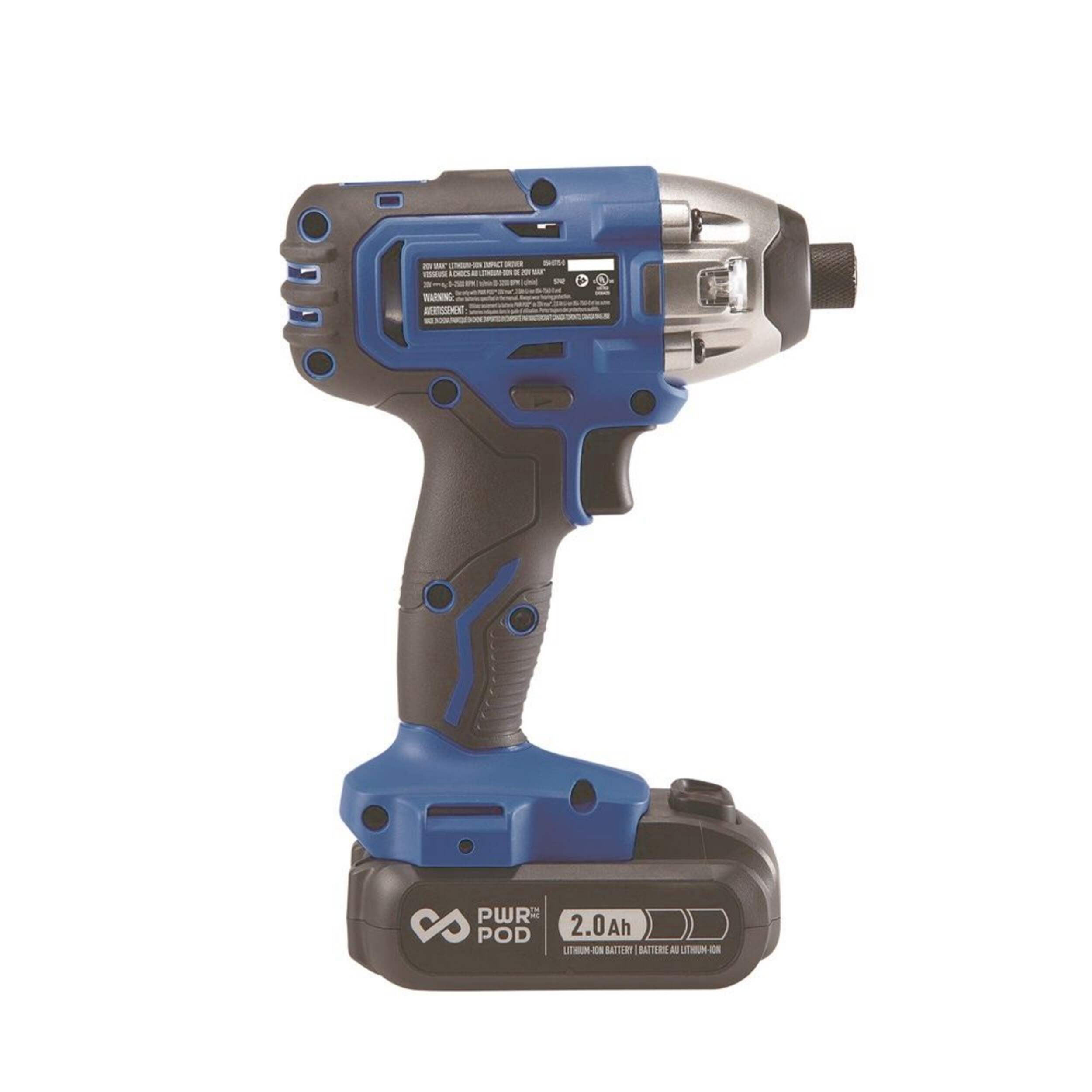 Comprend un tournevis à percussion de 1/4 po, une batterie PWR POD 20 V MAX 2,0 Ah, un chargeur de batterie PWR POD de 10 W, 2 embouts de tournevis à une extrémité, une pince de ceinture, un porte-embout et un sac souple