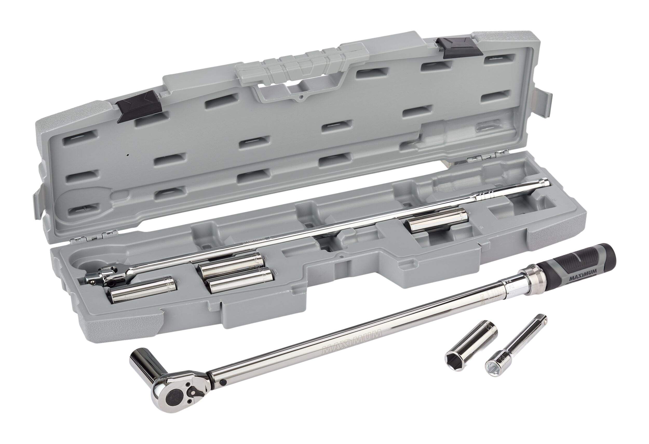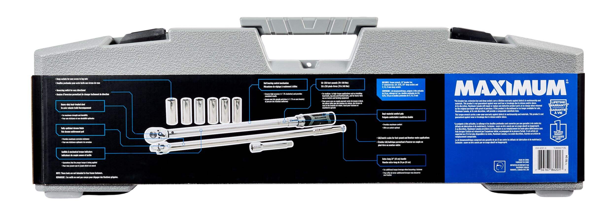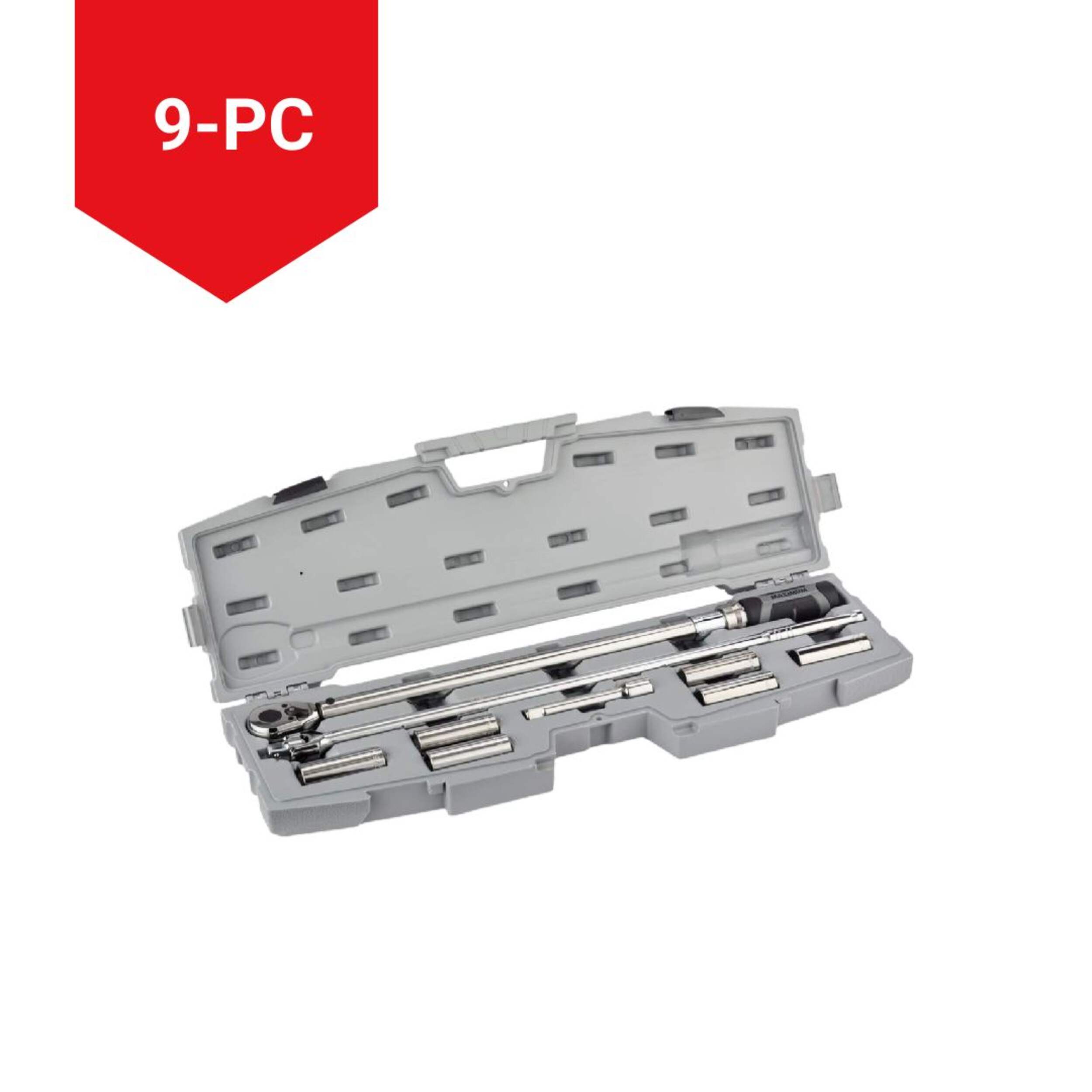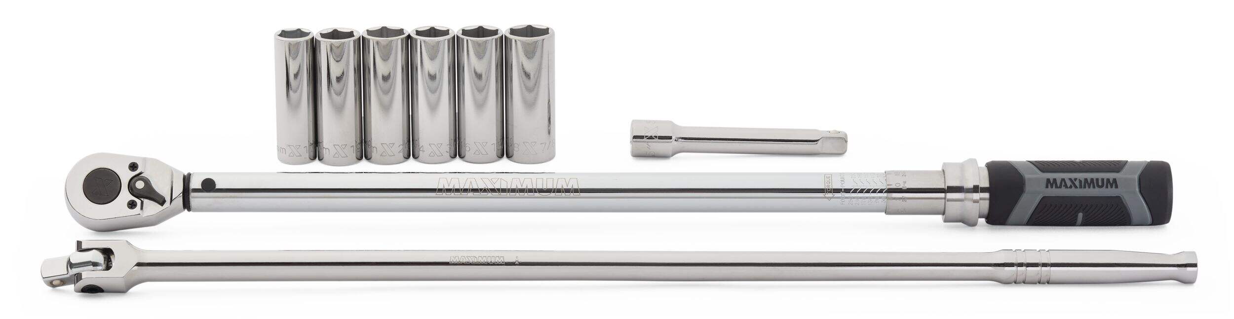 Comprend : clé dynamométrique prise 1/2po (50 à 250 pi-lb), clé articulée 61 cm (24 po) prise 1/2po, rallonge 12,7 cm (5 po) prise 1/2po, 6 douilles profondes (17 mm 19 mm 21 mm 3/4 po 13/16 po 7/8 po)