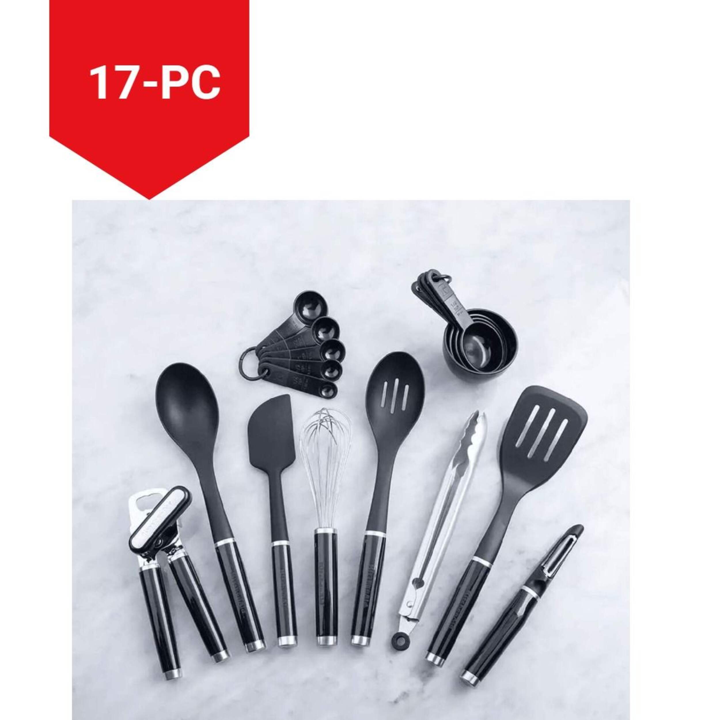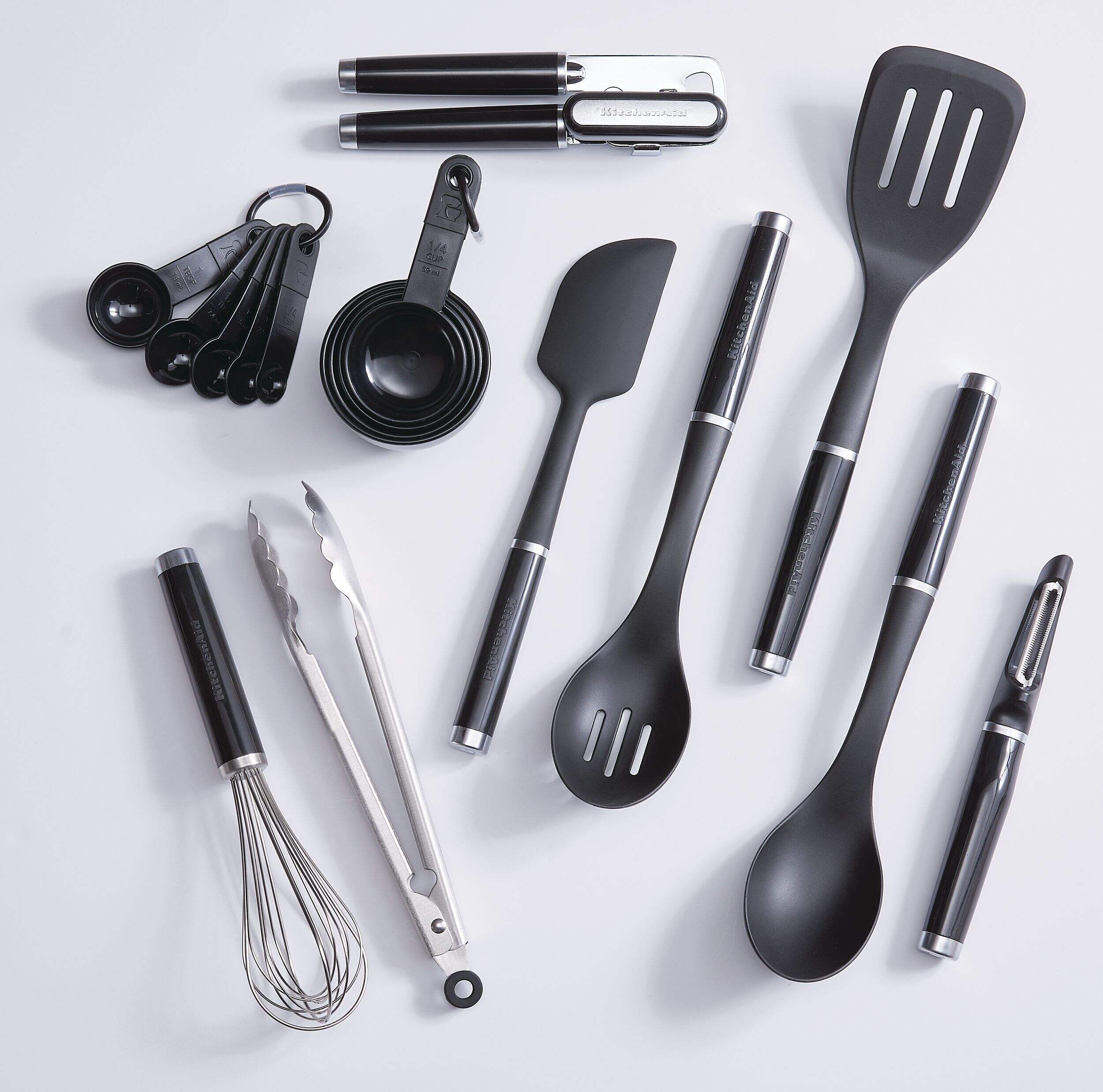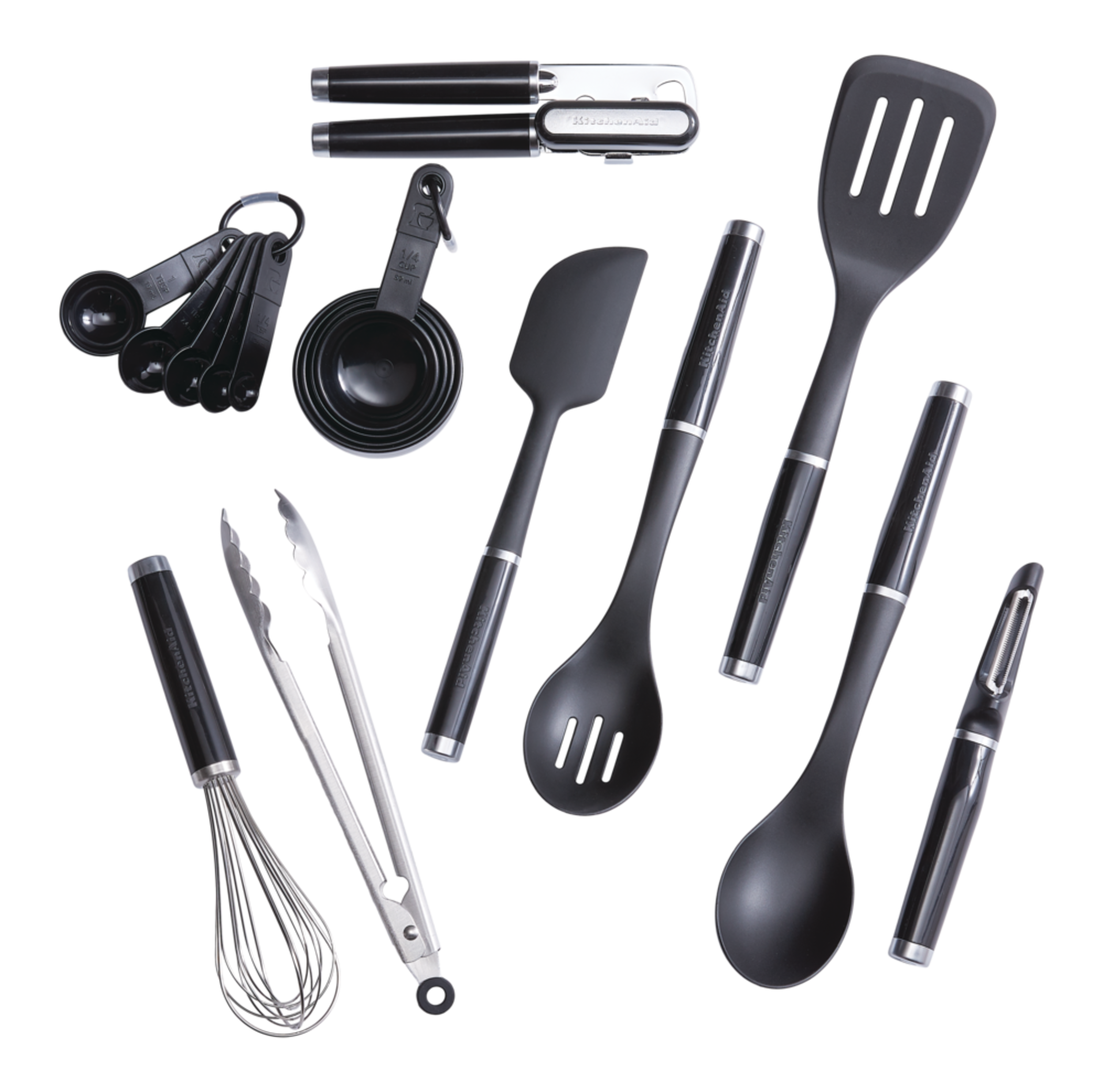 Comprend : 1 spatule à fentes, 1 cuillère à badigeonner, 1 cuillère à fentes, 1 pince en acier inoxydable, 1 spatule en silicone, 1 éplucheur euro, 1 ouvre-boîte, 1 fouet, 4 tasses à mesurer et 5 cuillères à mesurer
