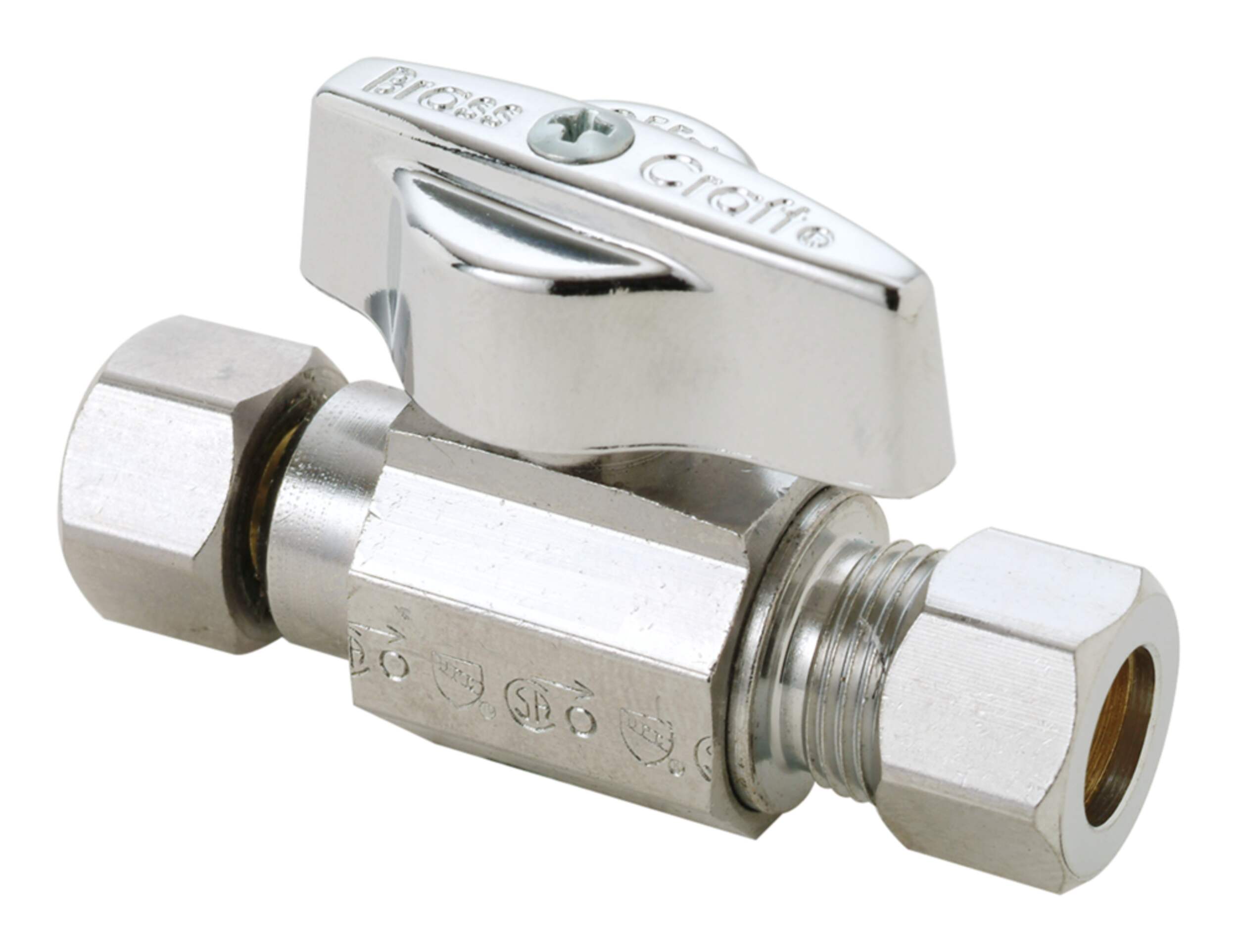 Robinet droit PlumbShop compatible avec des tuyaux en cuivre ou en polyéthylène réticulé (les installations de polyéthylène réticulé demandent l'insertion d'un tube en acier inoxydable)