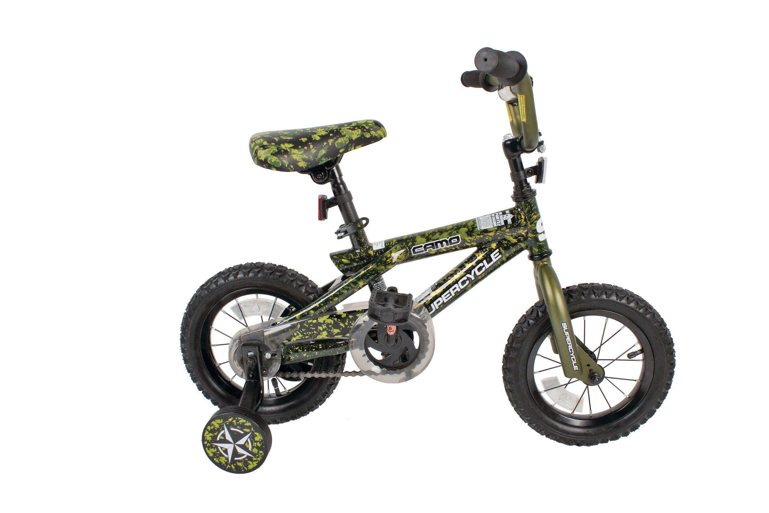 Ce vélo est idéal pour votre tout-petit qui aime le camouflage! Le cadre en acier robuste soutiendra votre enfant pendant qu'il se promène. Les roues stabilisatrices amovibles et réglables permettent aussi au vélo de grandir avec votre enfant. Un frein à rétropédalage assure que les arrêts peuvent être effectués facilement et avec soin. Les motifs de camouflage de ce vélo Supercycle attireront l'attention des petits cyclistes!