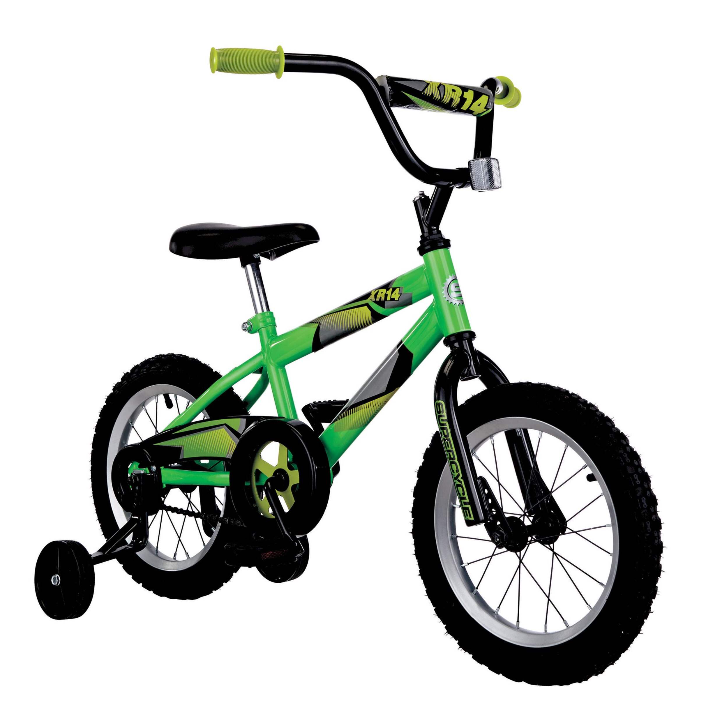 L'audacieux vélo vert fluo Supercycle XR14 offre un style de course excitant. Les graphiques sur le cadre en acier durable s'agencent au coussinet de guidon et au protège-chaîne. Les prises et le pignon jaune vif créent un look amusant. Ce vélo à 1 vitesse comprend un frein à rétropédalage et de robustes roues stabilisatrices.
