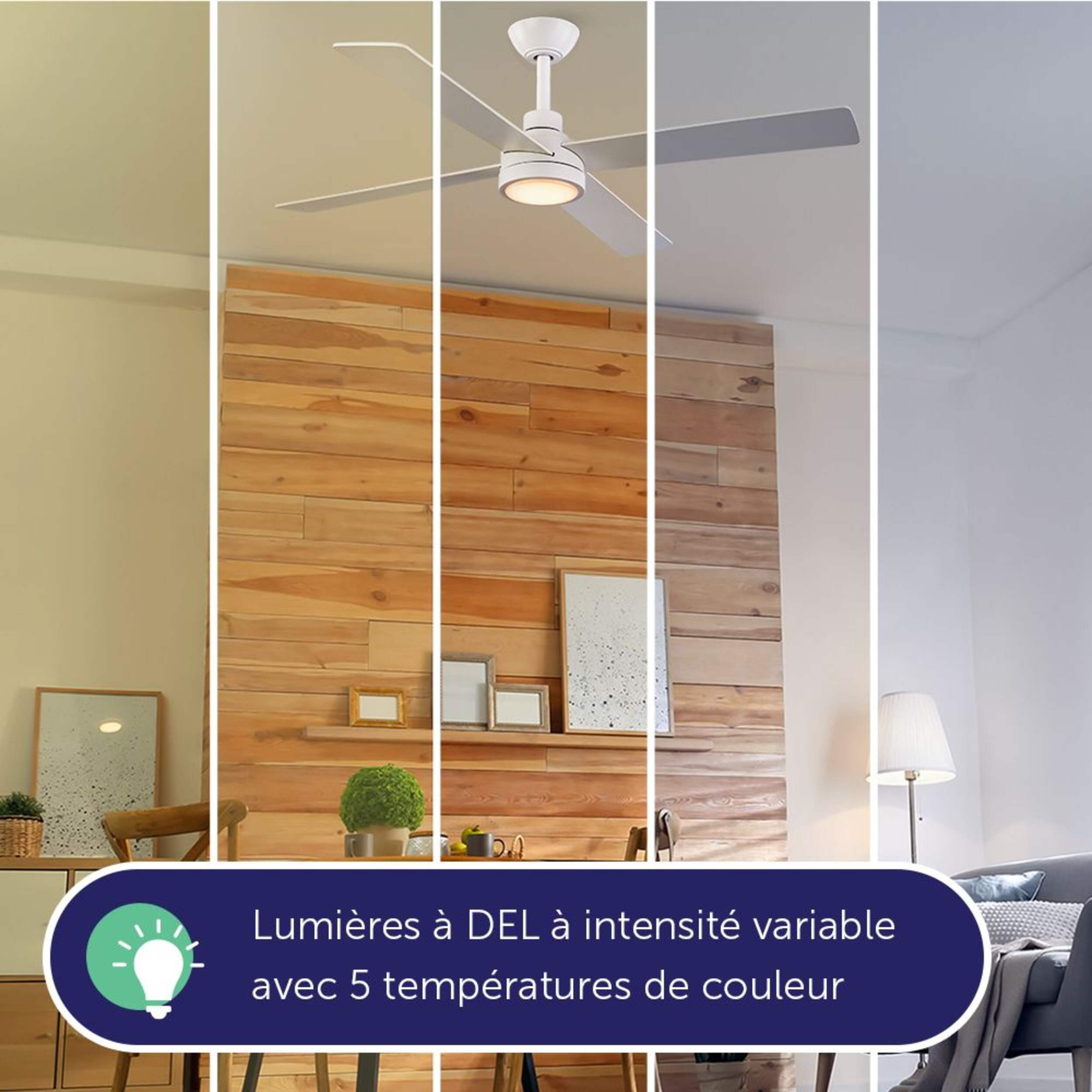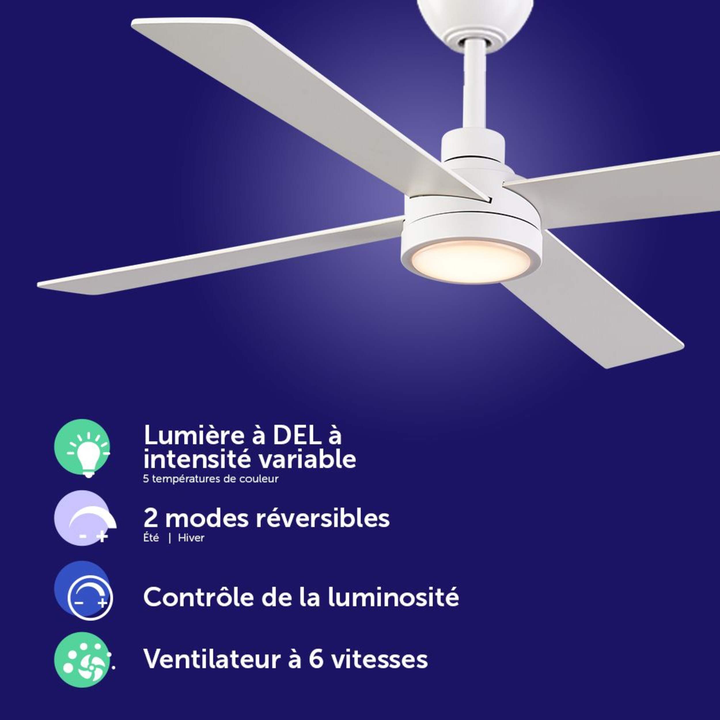 Le ventilateur de plafond NOMA Baxter avec trousse d'éclairage à DEL est le ventilateur de plafond idéal pour les grands espaces. Ce ventilateur de plafond télécommandé est doté de 4 pales réversibles et d'une ampoule à DEL à intensité réglable pour une luminosité optimale. Ce ventilateur de plafond à DEL comprend tout le matériel nécessaire pour une installation sans tracas.