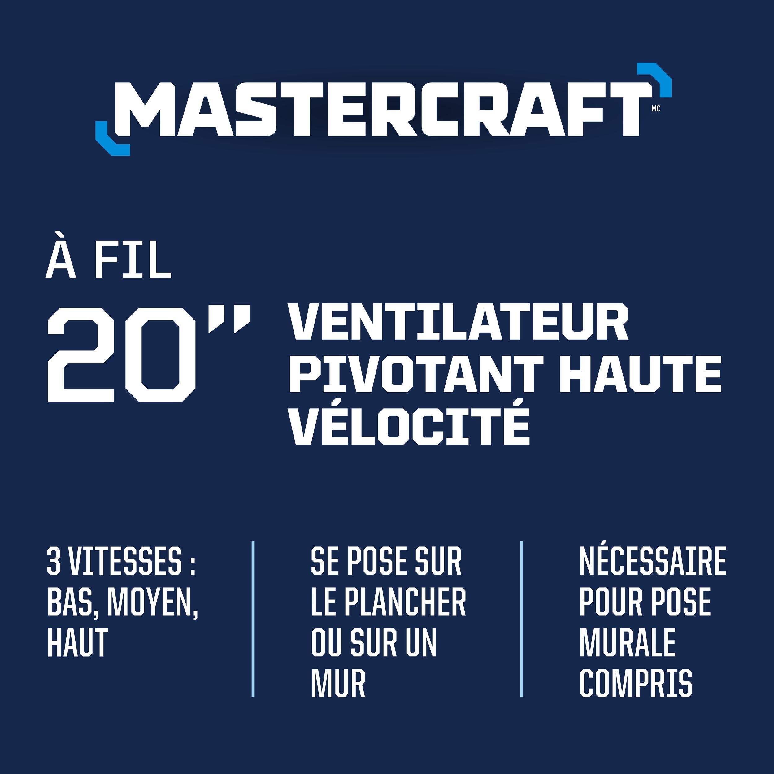 Le ventilateur mural/de plancher Mastercraft avec tête réglable à 720 degrés, 50,8 cm (20 po), est idéal pour les grands espaces. Le ventilateur industriel aide à atténuer rapidement la chaleur intense dans les garages, les ateliers ou même les chantiers de construction. Grâce à sa tête pivotante à 720 degrés, vous pouvez personnaliser la circulation d'air selon vos besoins. Le débit d'air directionnel est un avantage supplémentaire par rapport à un ventilateur de plafond traditionnel qui ne permet pas d'accéder à des zones spécifiques qui nécessitent un refroidissement. Le ventilateur portatif est doté d'une lame en aluminium à 5 pales et d'un débit d'air à haute vitesse pour offrir un refroidissement efficace. Utilisez le réglage à 3 vitesses pour régler la vitesse du ventilateur entre faible, moyen et élevé. Le ventilateur de refroidissement peut être utilisé tel quel, en le reposant sur le plancher ou en le fixant à l'endroit désiré avec la trousse de montage incluse.