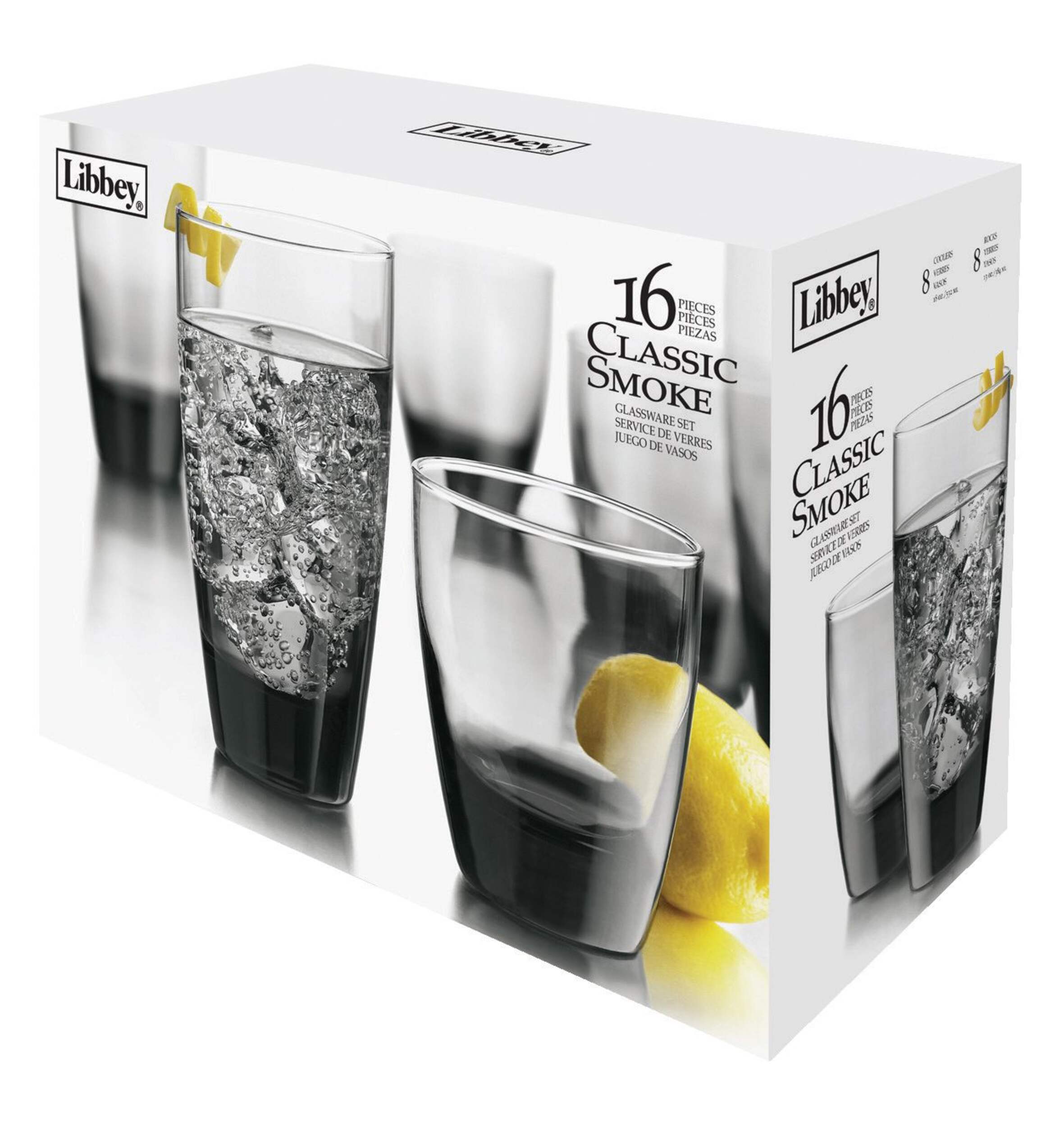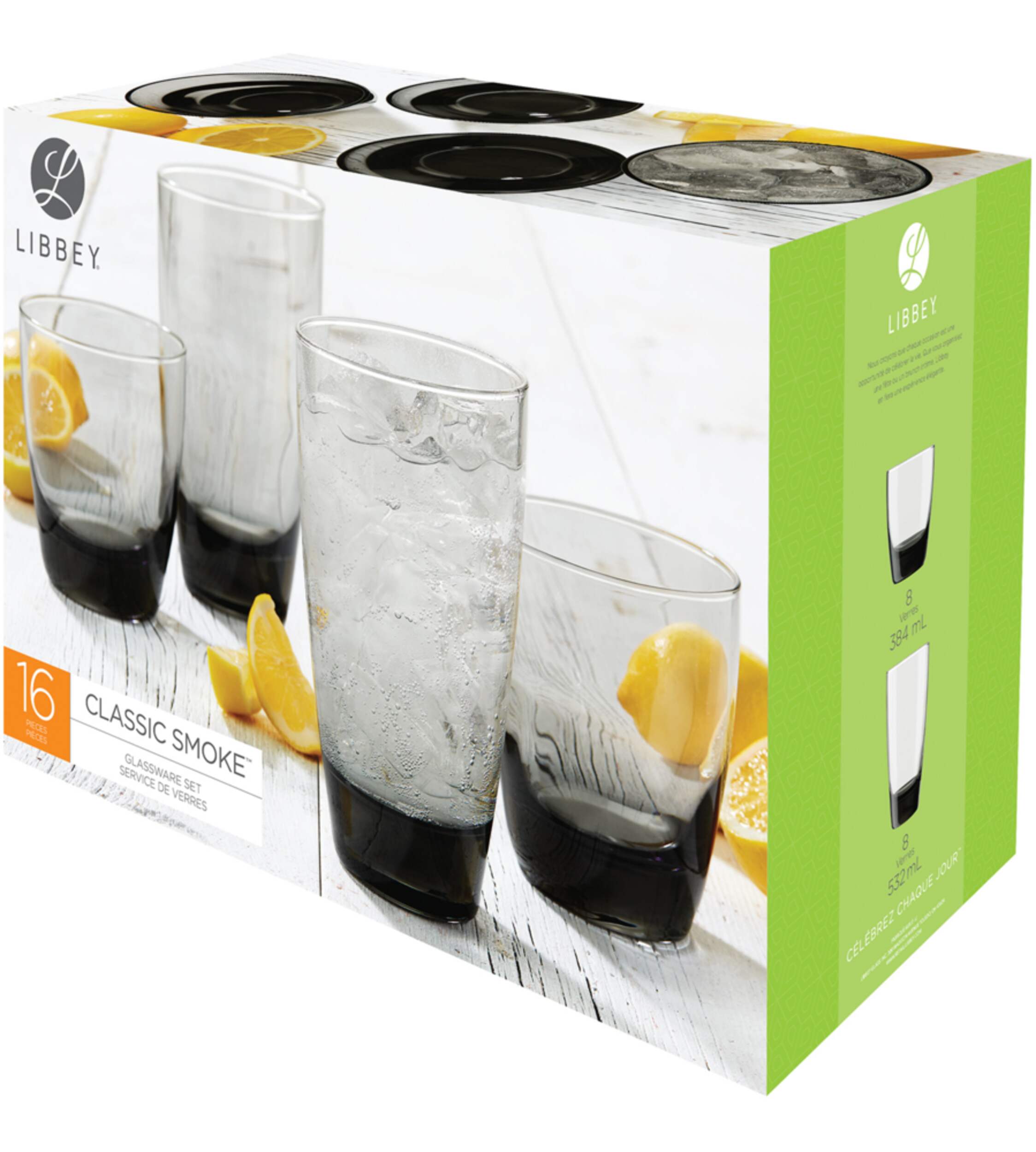 Comprend : 8 verres à whisky doubles de 384 mL (13 oz) et 8 verres à boissons rafraîchissantes de 532 mL (18 oz)