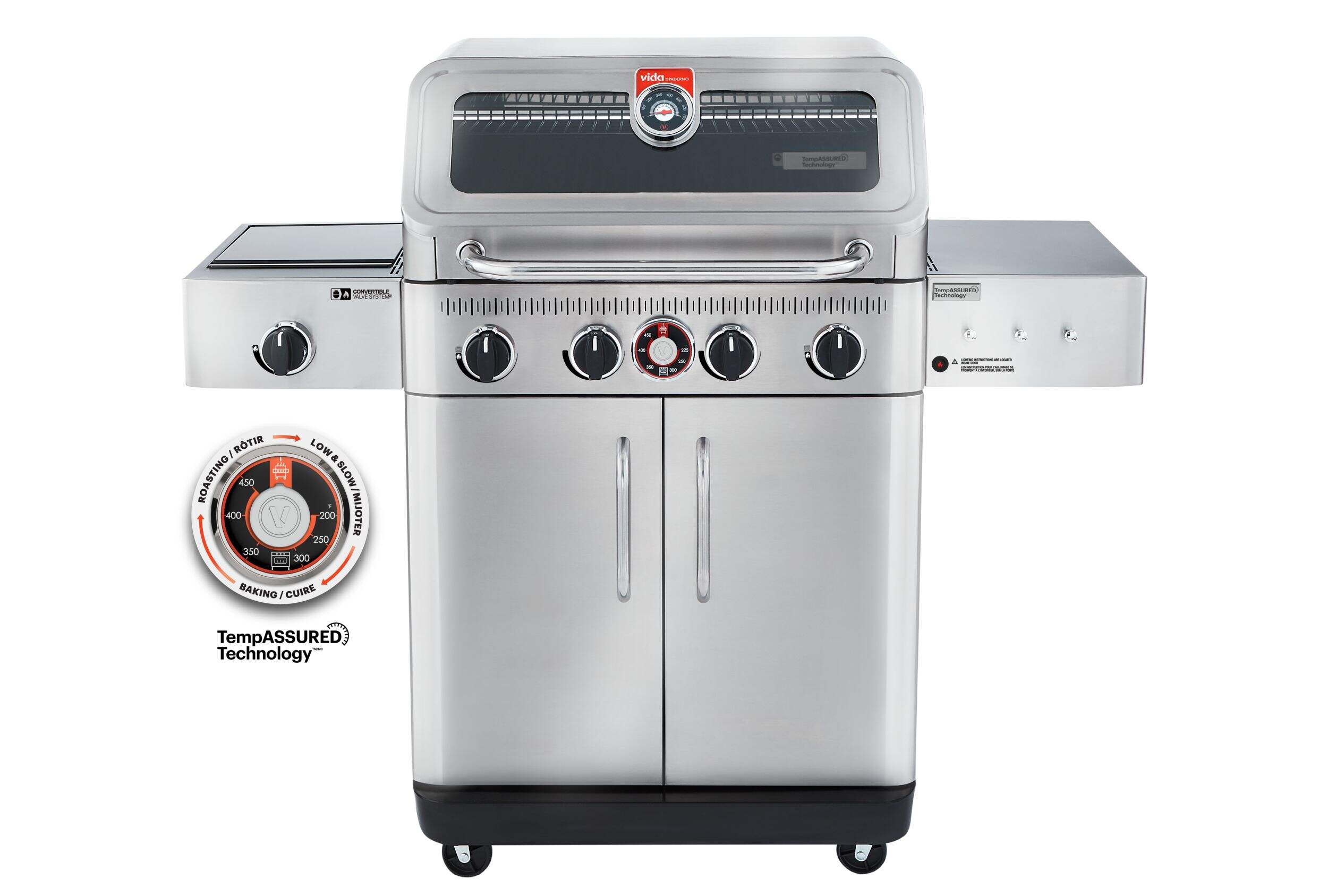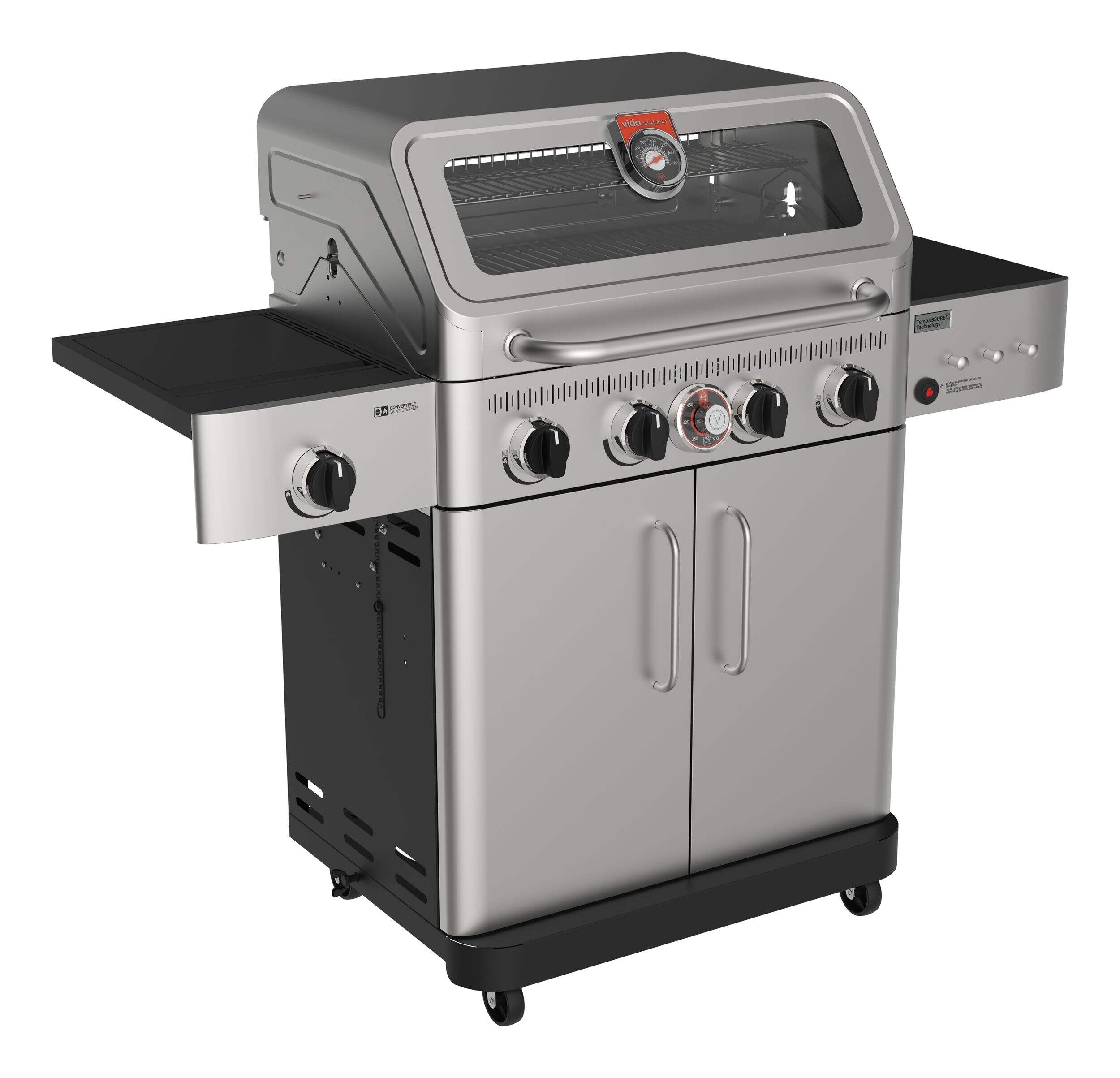 Préparez des repas inoubliables avec le barbecue à 4 brûleurs Vida de la série Essence de PADERNO. Grâce à TempASSURED TechnologyMC en instance de brevet, vous pouvez passer du mode four pour une cuisson stable et précise au mode barbecue pour une grillade classique. Que ce soit pour grignoter des hamburgers ou pour vos plats distinctifs, ce gril offre la perfection à tout coup. Conçu pour contenir jusqu'à 24 hamburgers à la fois, il est votre compagnon idéal pour les fêtes dans le jardin et les festins en famille.