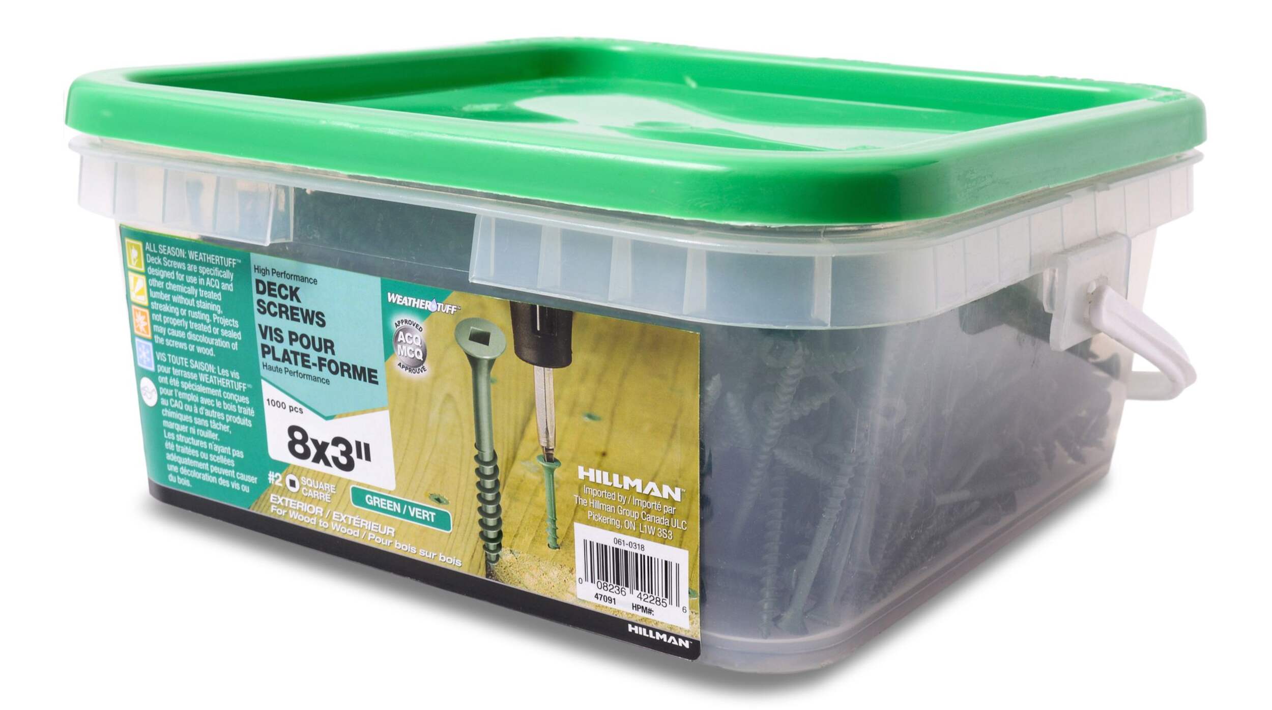 Vis à terrasse Hillman Pro-Fast Premium conçues pour offrir une performance supérieure dans tous les projets de bois et de terrasses extérieurs. Dotées d'une tête étoilée anti-déformation, de lames de fraisage et d'une tige à torsion antifente, ces vis vertes ne nécessitent pas de préperçage, ce qui rend l'installation rapide et efficace. Spécialement conçues pour résister à la rouille, aux taches et aux traînées dans le bois traité chimiquement, elles assurent une longue durée de vie et un fini propre et poli.