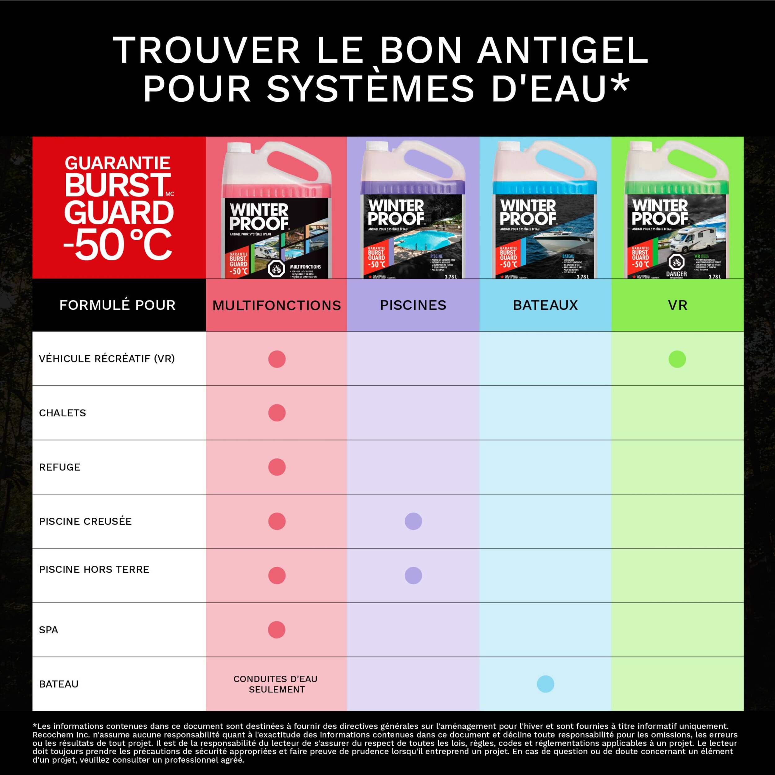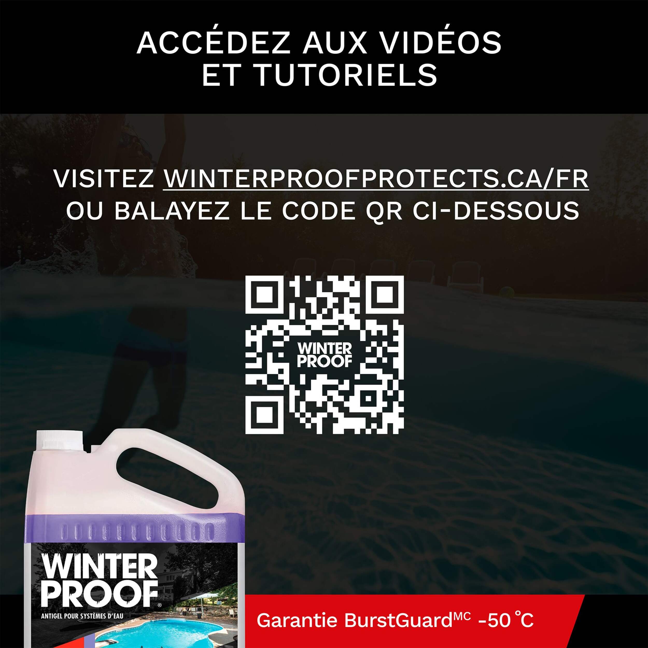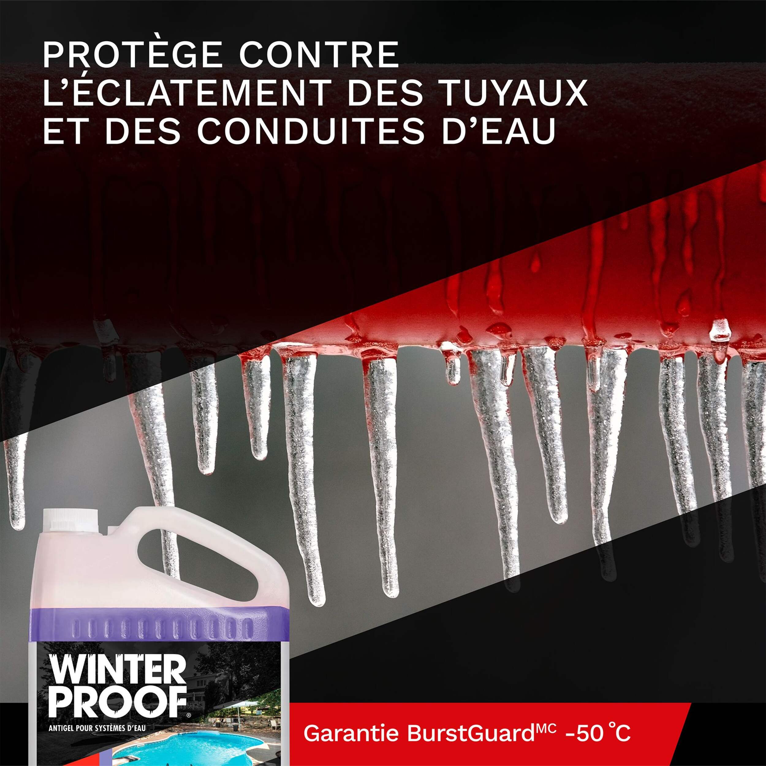 Antigel pour plomberie de piscine WinterProof avec garantie BurstGuard jusqu'à -50°C vous offrant la tranquillité d'esprit contre les rudes hivers canadiens. Notre formule prête à l'emploi aide à protéger les conduites, les drains et les systèmes de filtrage de votre piscine contre les fissures, l'éclatement et d'autres dommages causés par le gel. Sans danger pour les tuyaux en métal et en plastique.